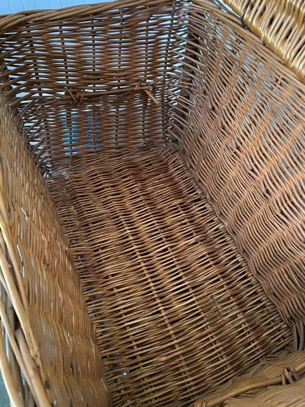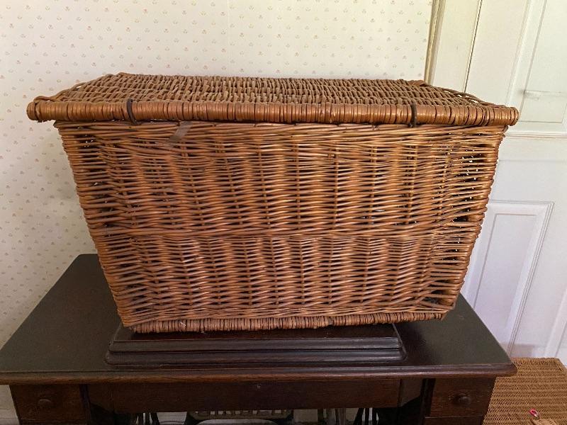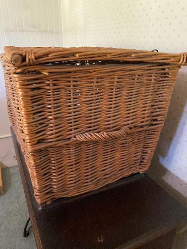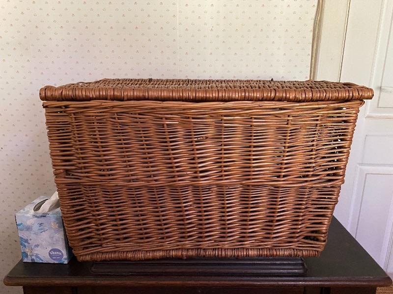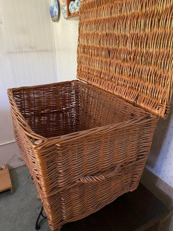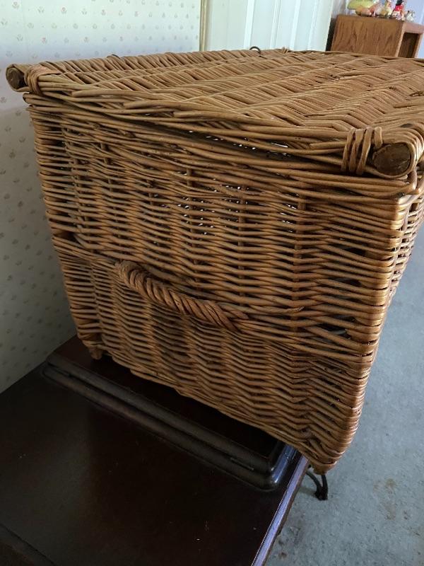 Lidded wicker basket. Good size, Kleenex box for sizing. Good condition. Hinged lid, handles on the side.