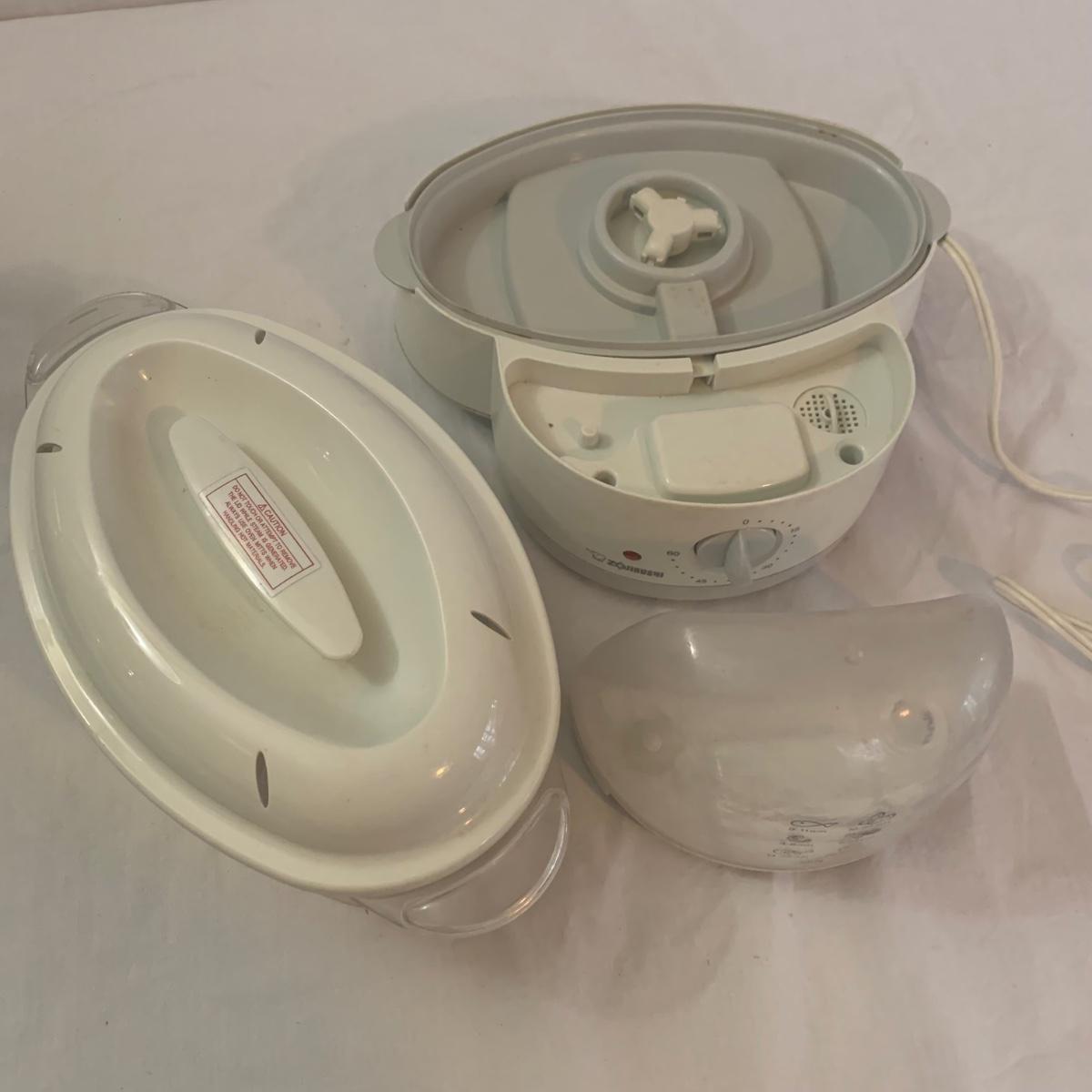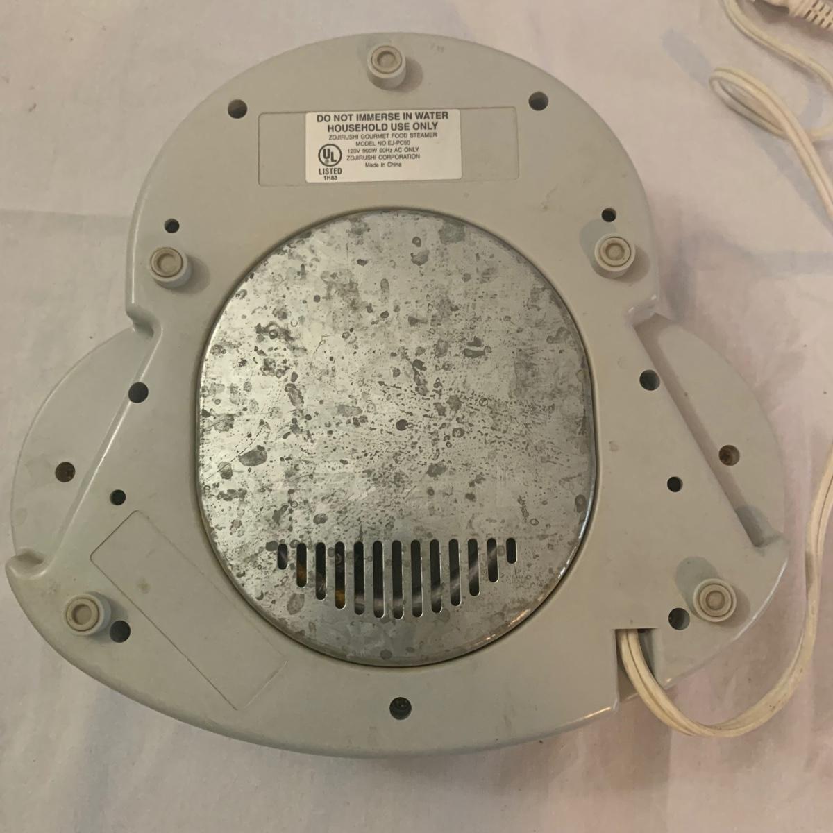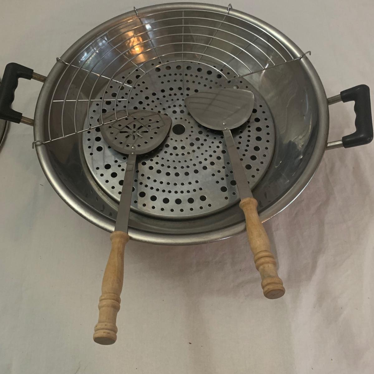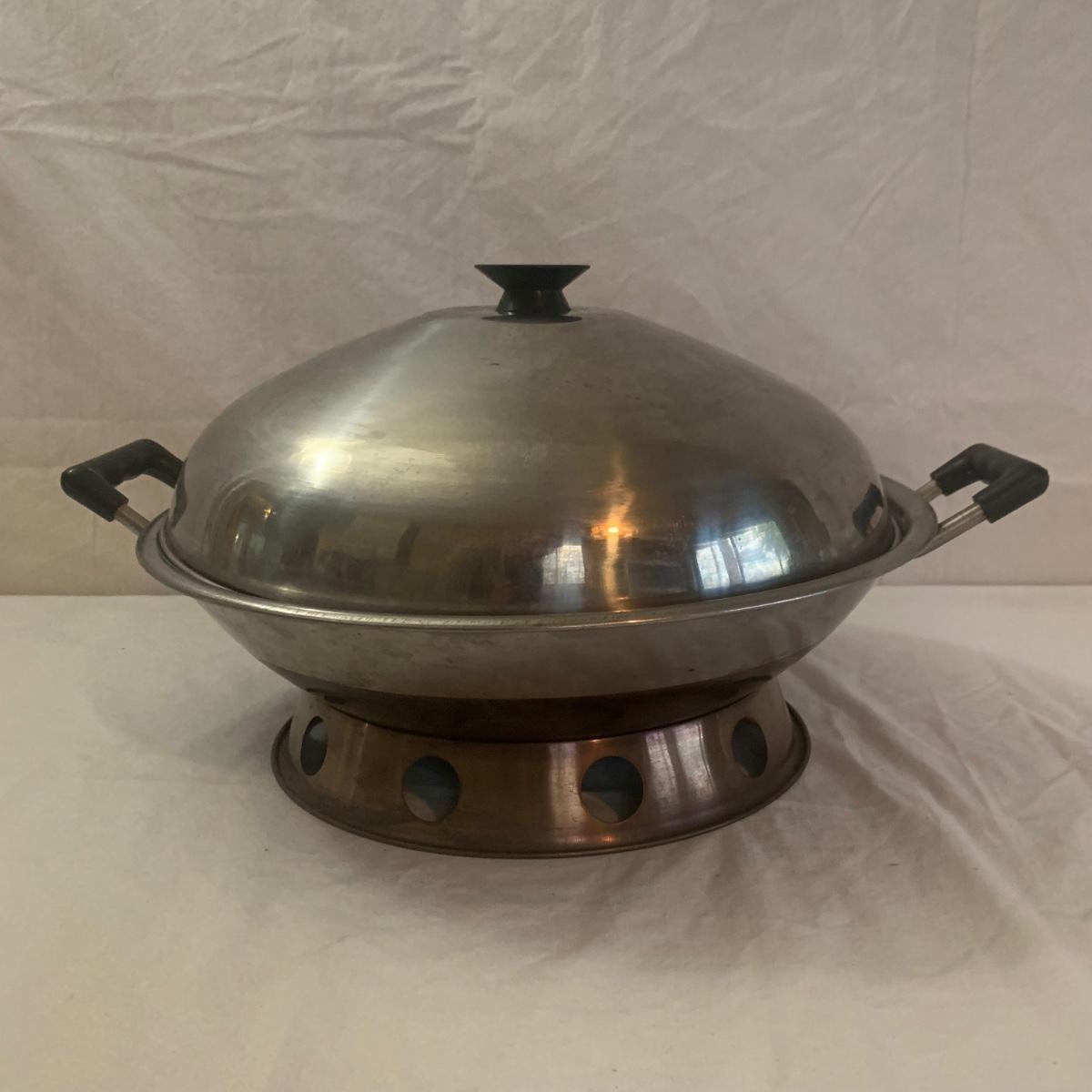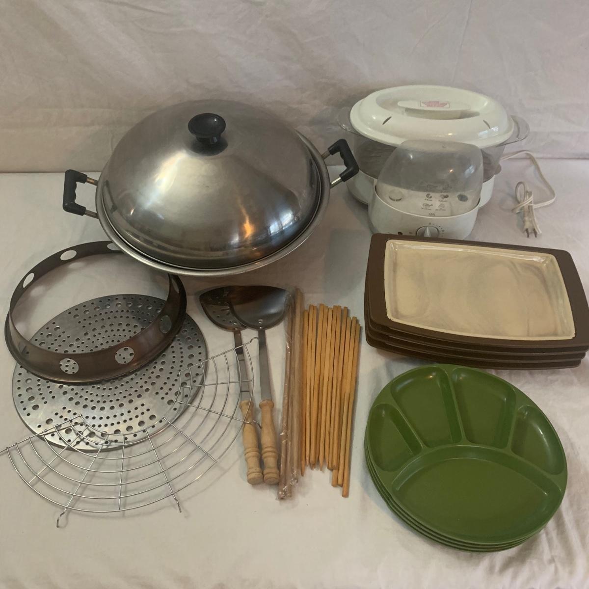 This lidded wok is stainless steal with a copper bottom. It comes with a stand and various accessories. It is 14.5”D. The Zojirushi Gourmet Food Steamer powered on when plugged in. Also included are multiple sets of wood chopsticks, three green divided plates that have a melamine feel, and four rectangular West Bend dishes with plastic bases and enamel coated metal inserts.