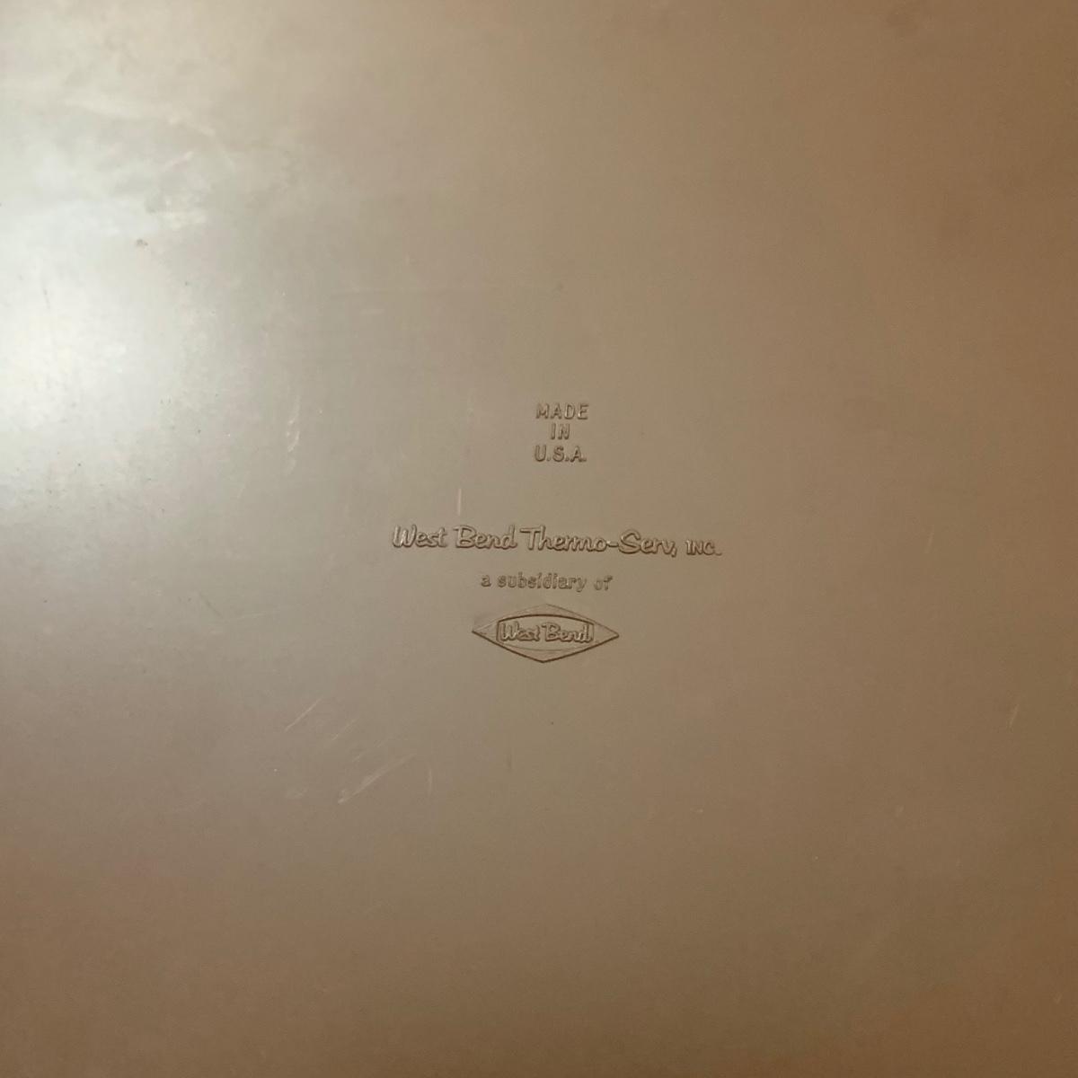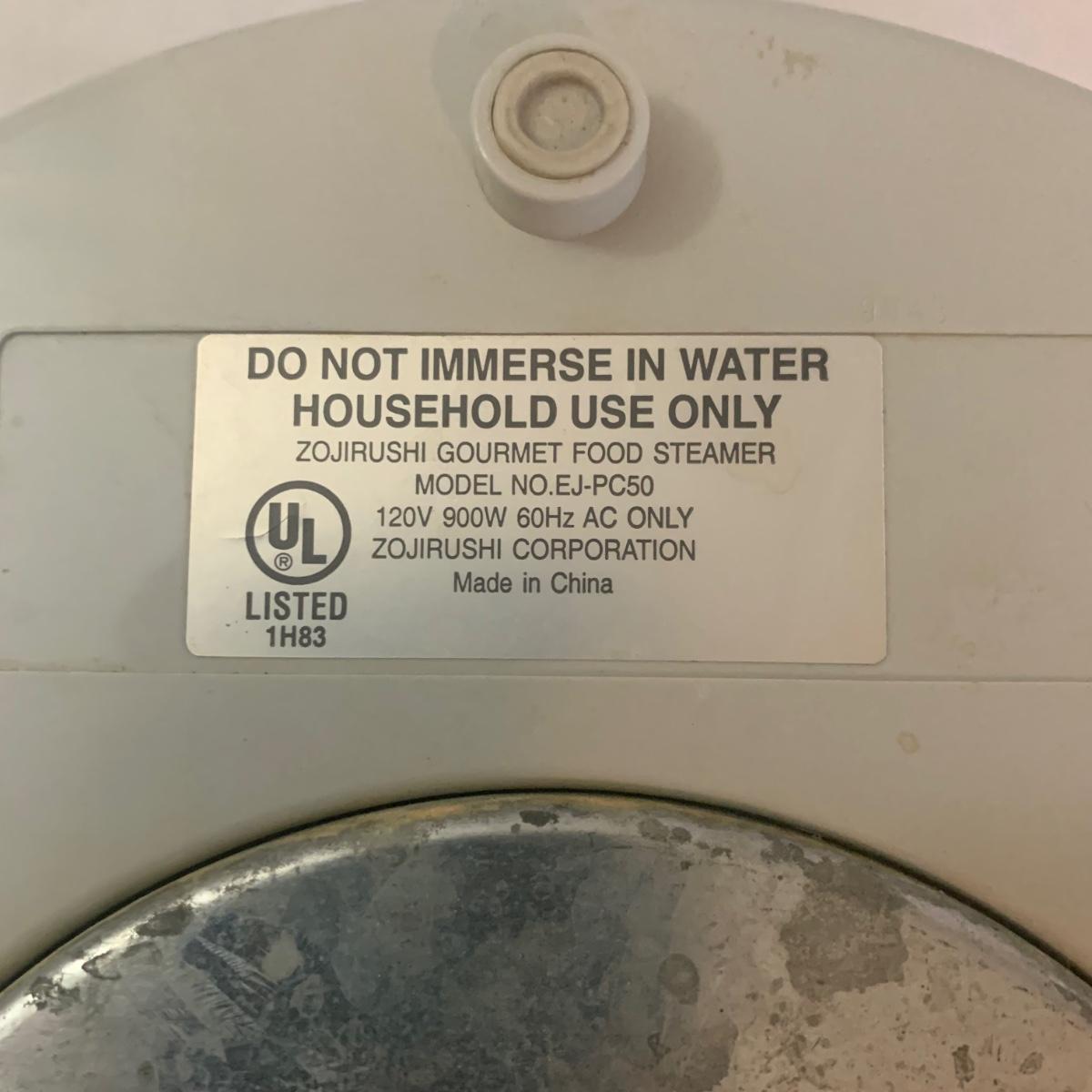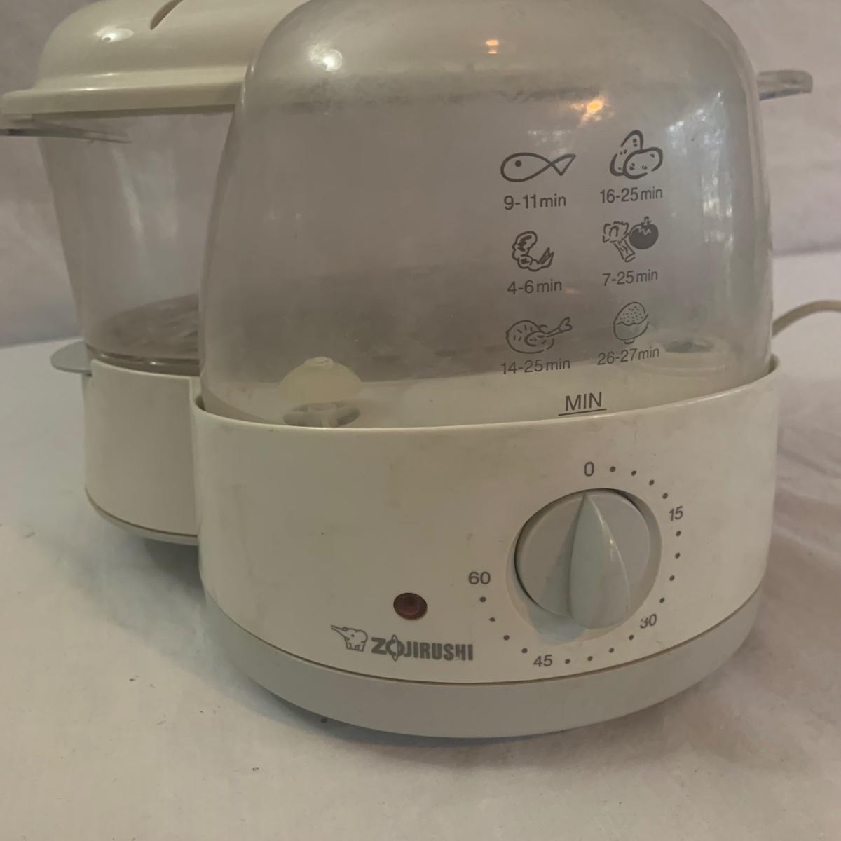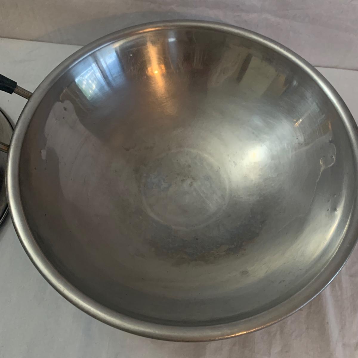 This lidded wok is stainless steal with a copper bottom. It comes with a stand and various accessories. It is 14.5”D. The Zojirushi Gourmet Food Steamer powered on when plugged in. Also included are multiple sets of wood chopsticks, three green divided plates that have a melamine feel, and four rectangular West Bend dishes with plastic bases and enamel coated metal inserts.