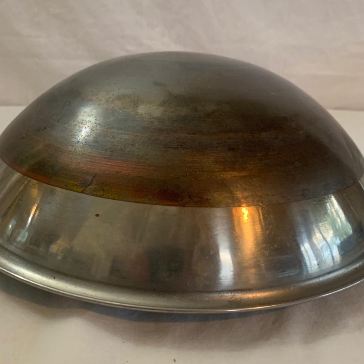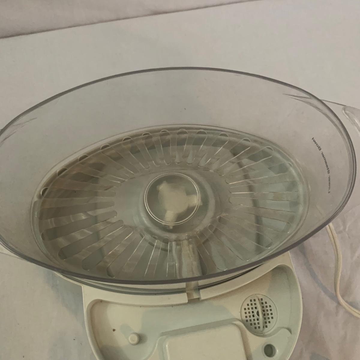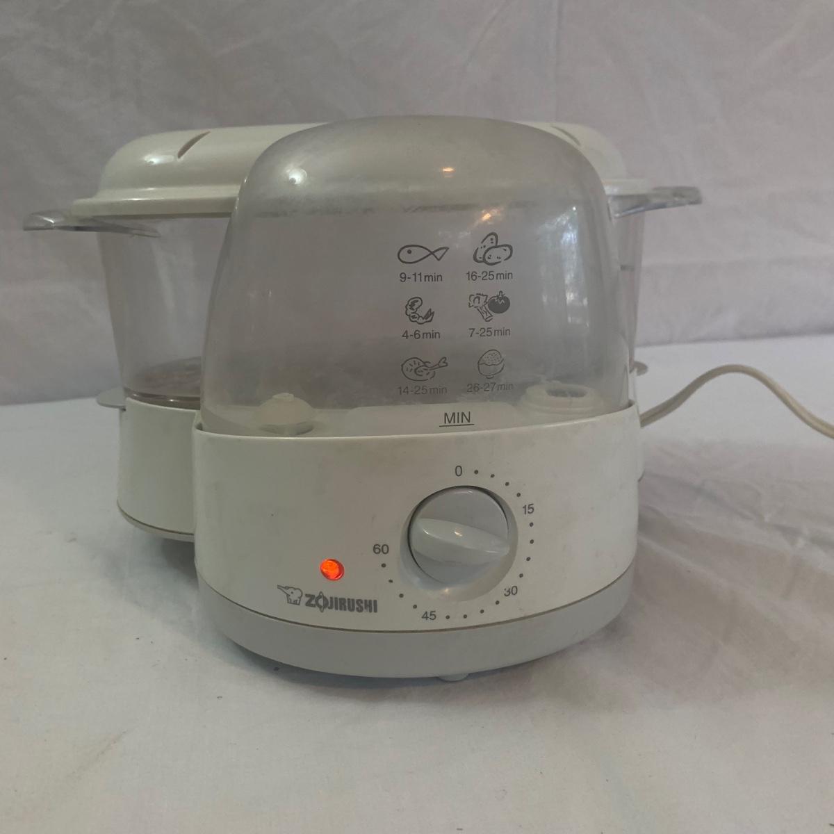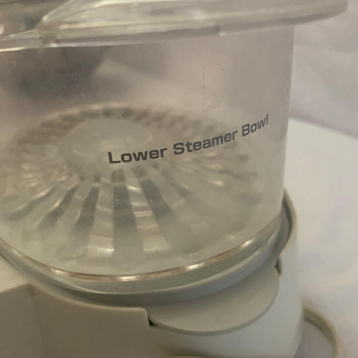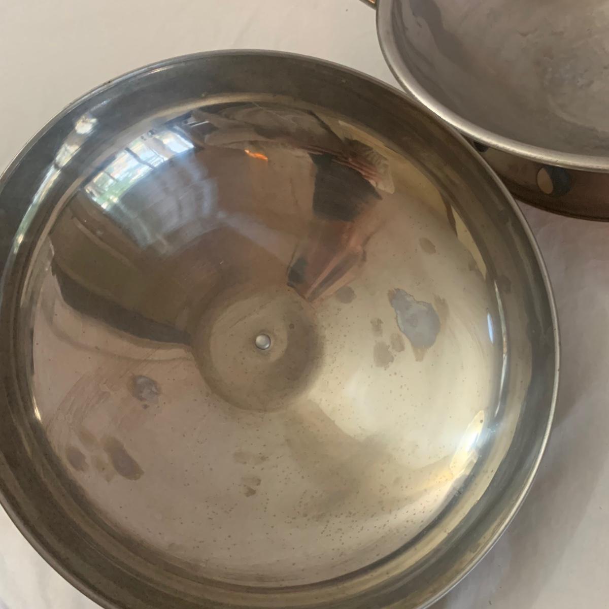 This lidded wok is stainless steal with a copper bottom. It comes with a stand and various accessories. It is 14.5”D. The Zojirushi Gourmet Food Steamer powered on when plugged in. Also included are multiple sets of wood chopsticks, three green divided plates that have a melamine feel, and four rectangular West Bend dishes with plastic bases and enamel coated metal inserts.
