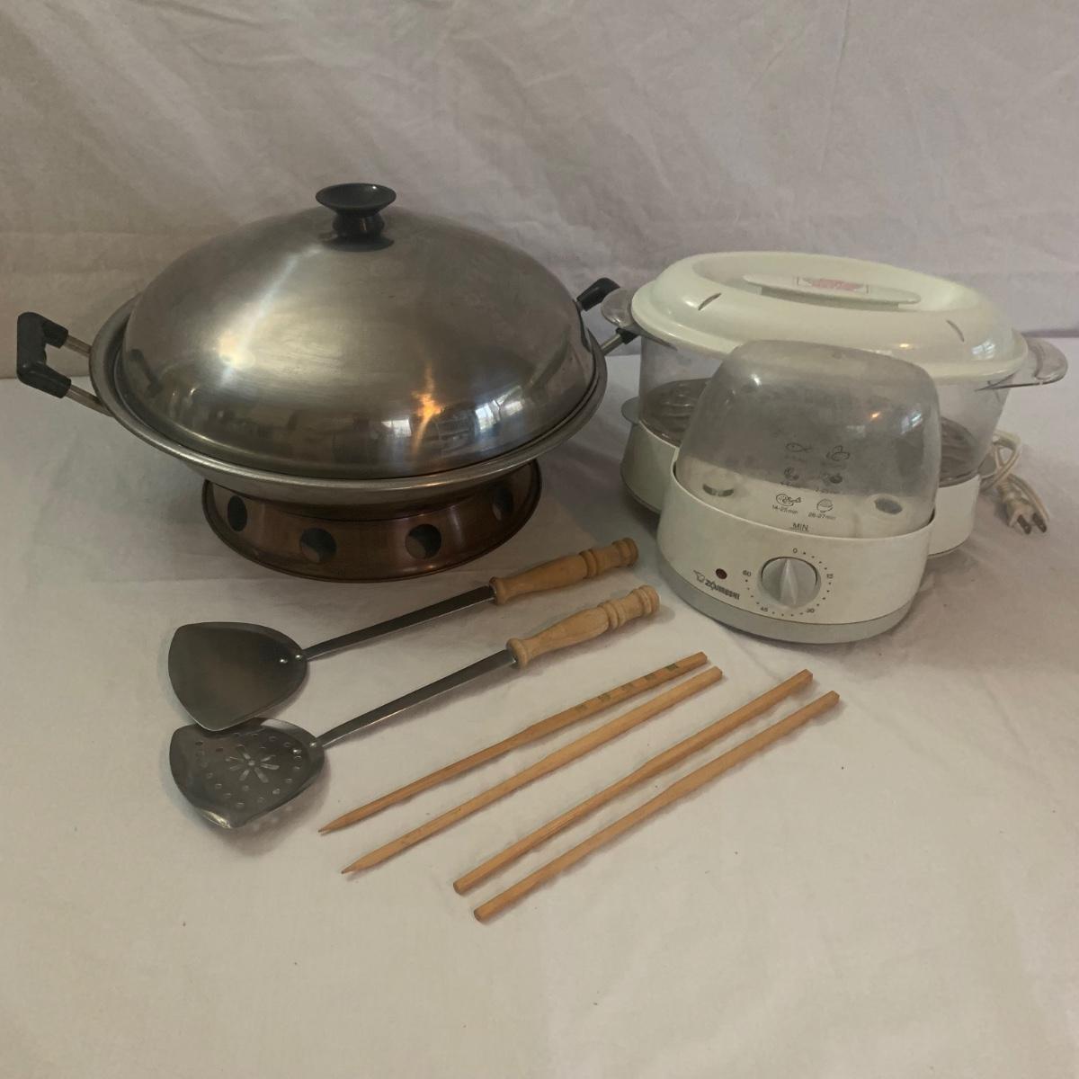 Lidded Wok, Zojirushi Gourmet Steamer, & Serving Dishes (K-HS)