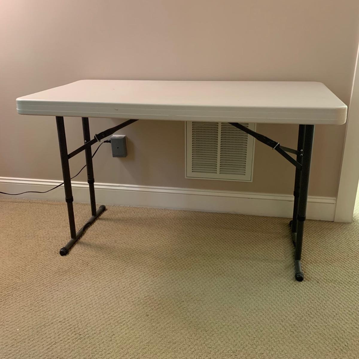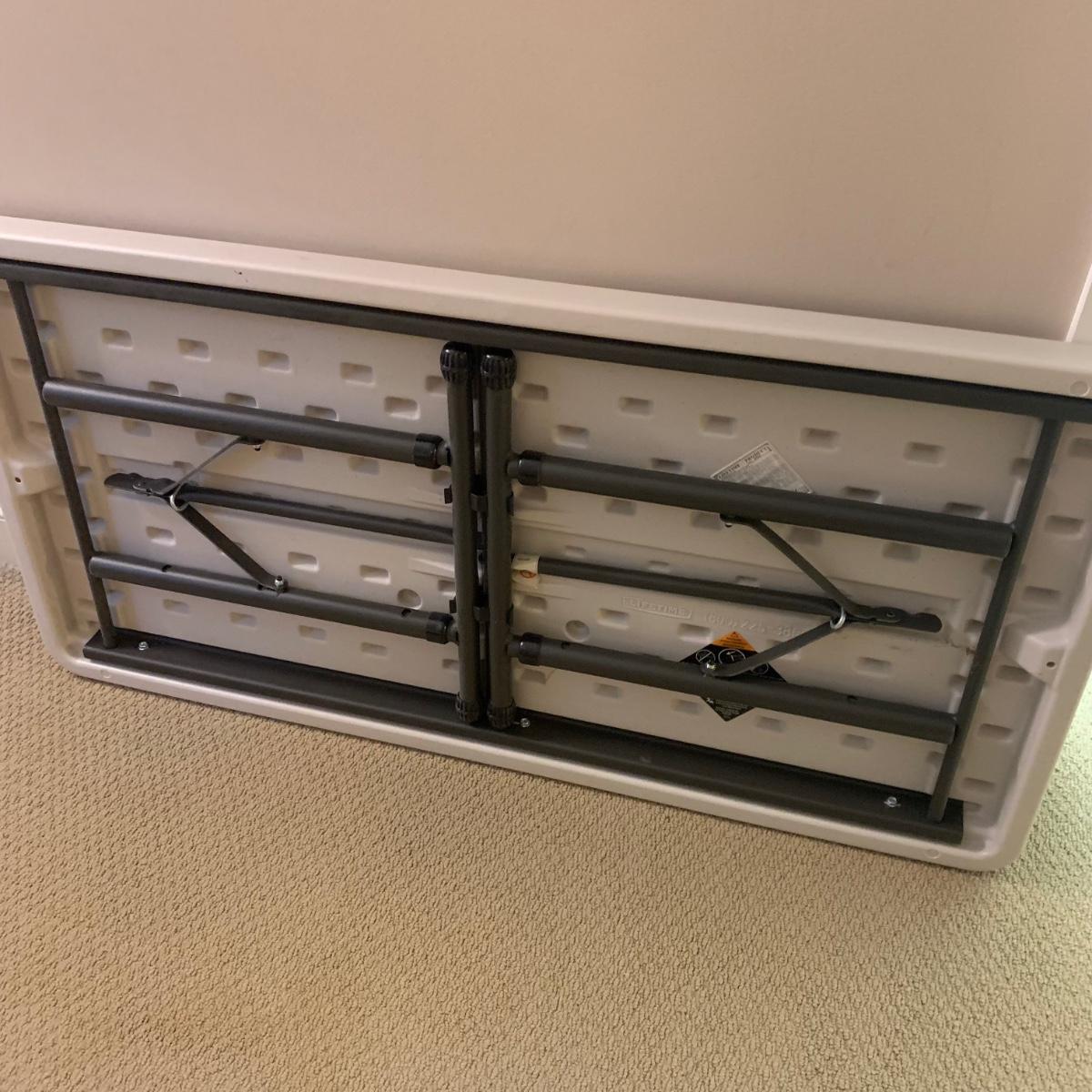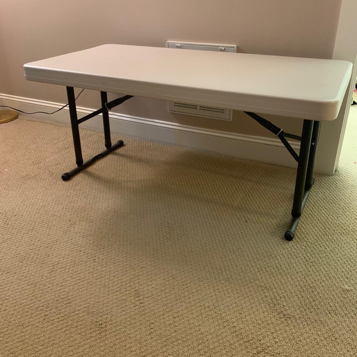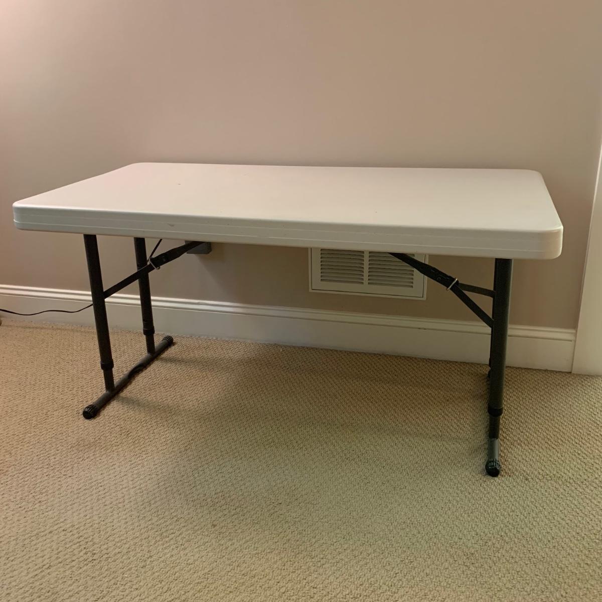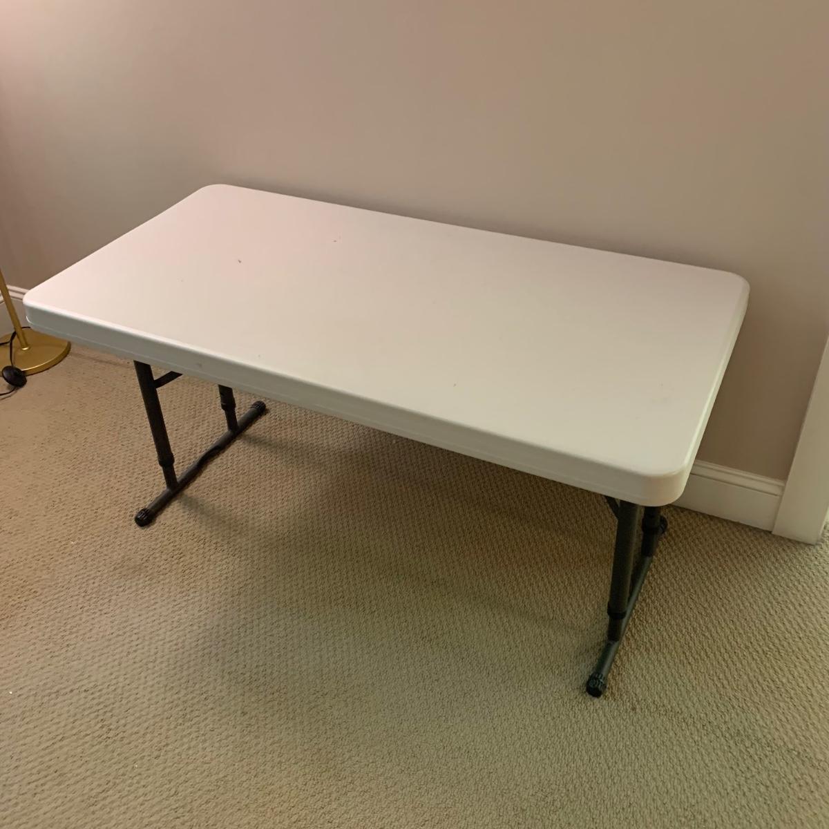 Lifetime brand plastic table with metal legs. Table measures 48” x 24” x 21.5”H at its shortest height, and 29“H at its tallest. There are some light stains and marks on the top surface. Table collapses for storage.