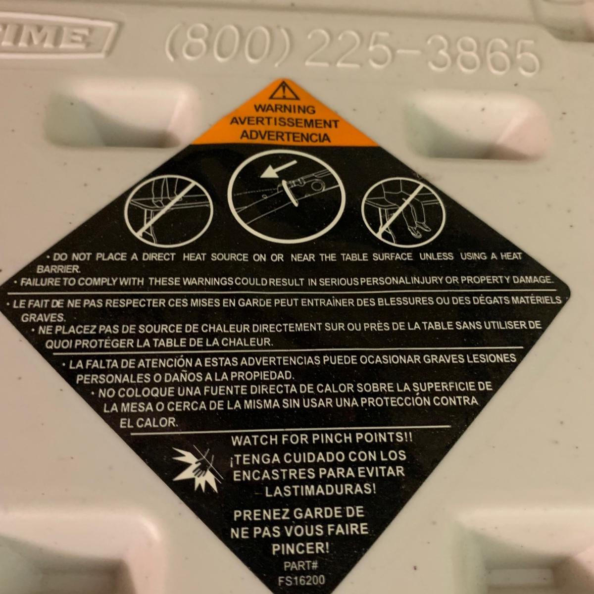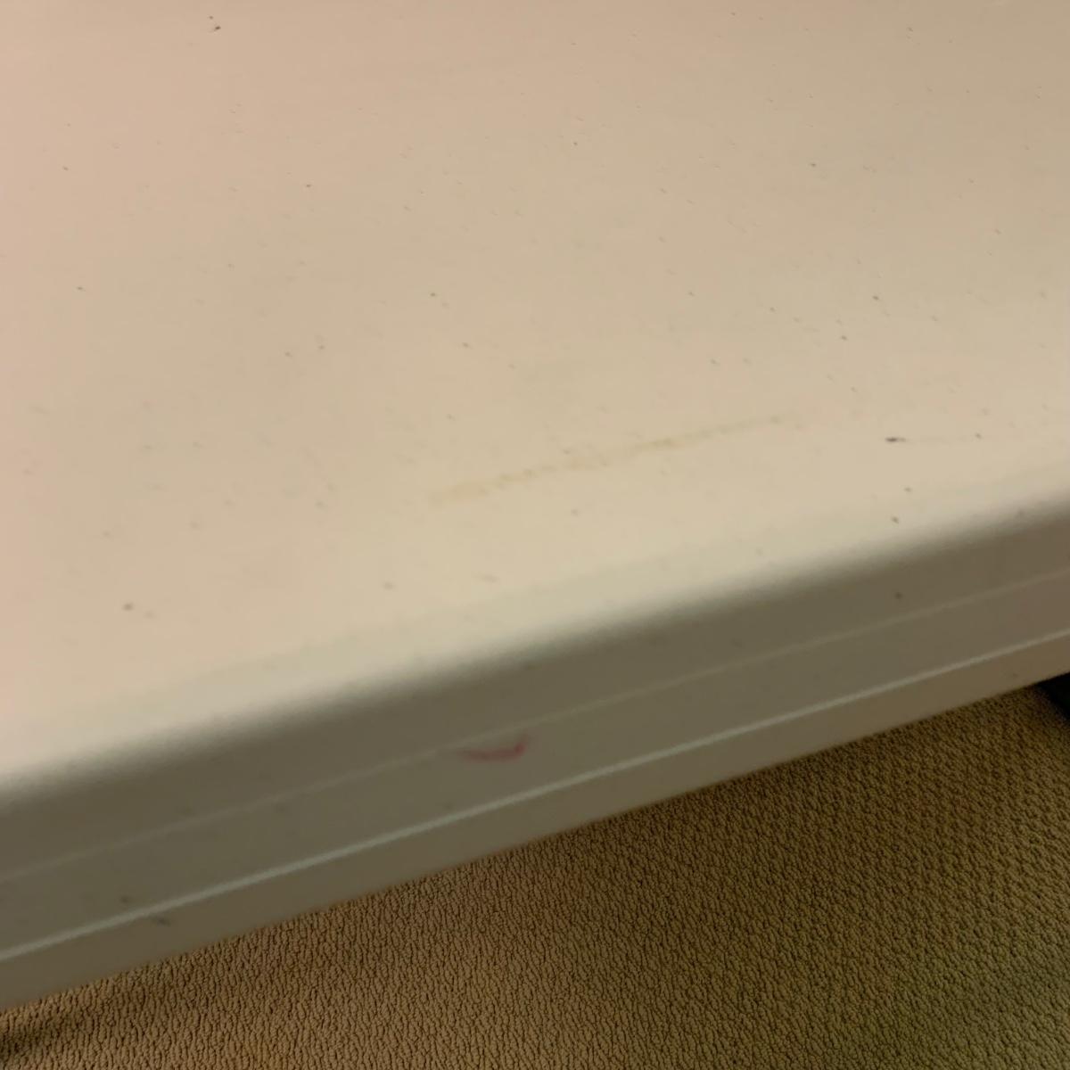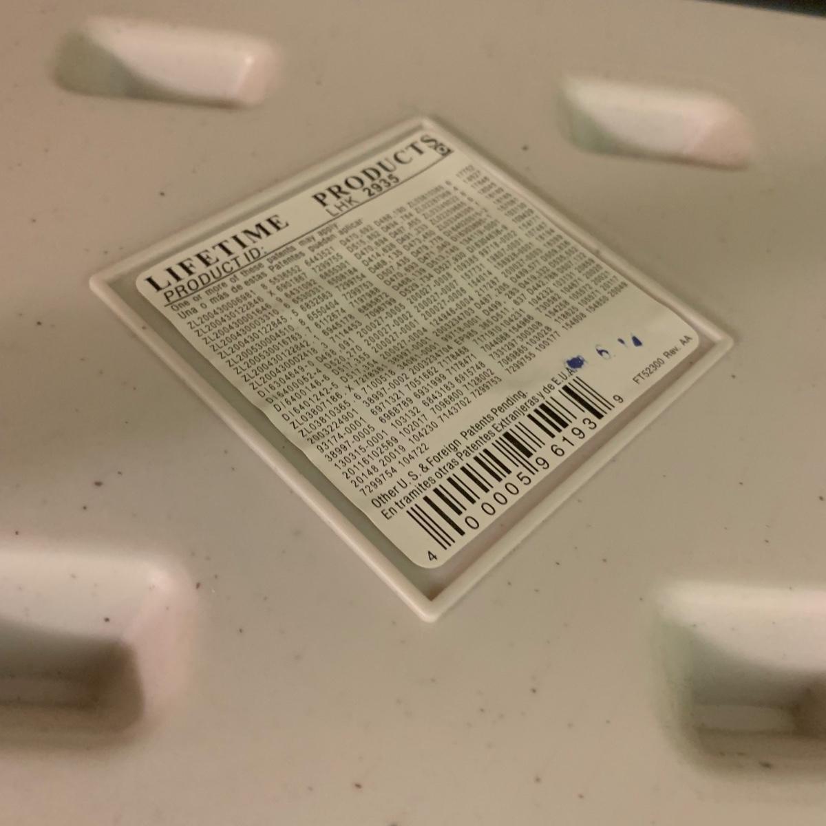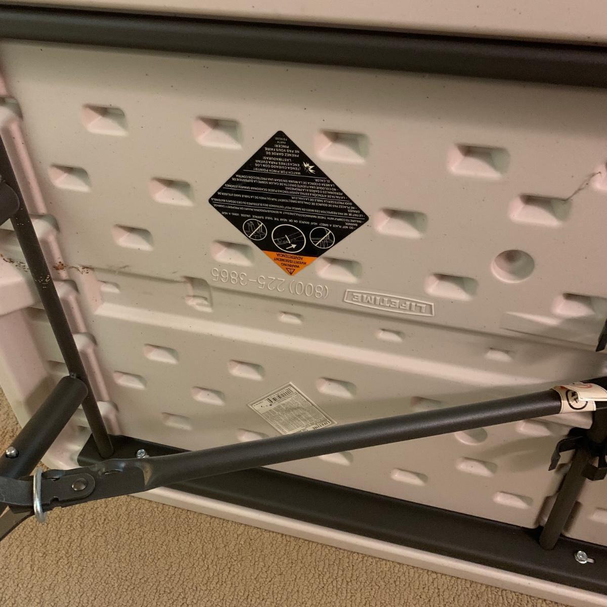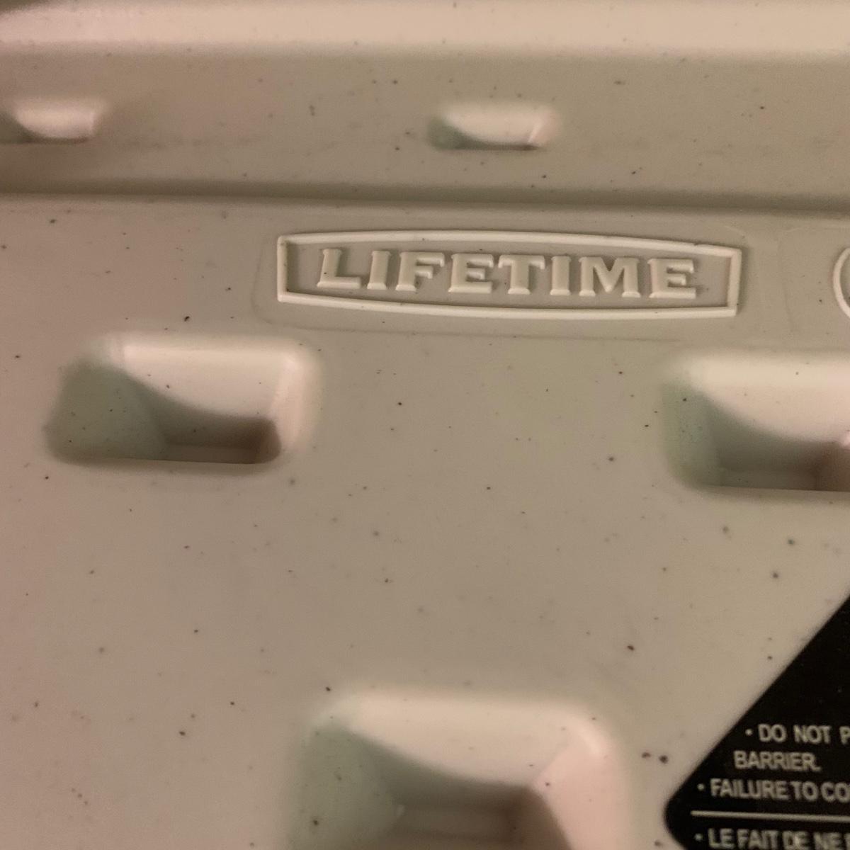 Lifetime brand plastic table with metal legs. Table measures 48” x 24” x 21.5”H at its shortest height, and 29“H at its tallest. There are some light stains and marks on the top surface. Table collapses for storage.