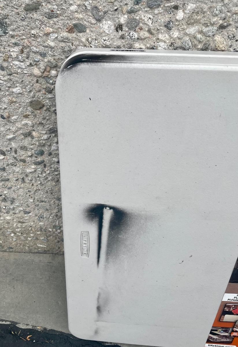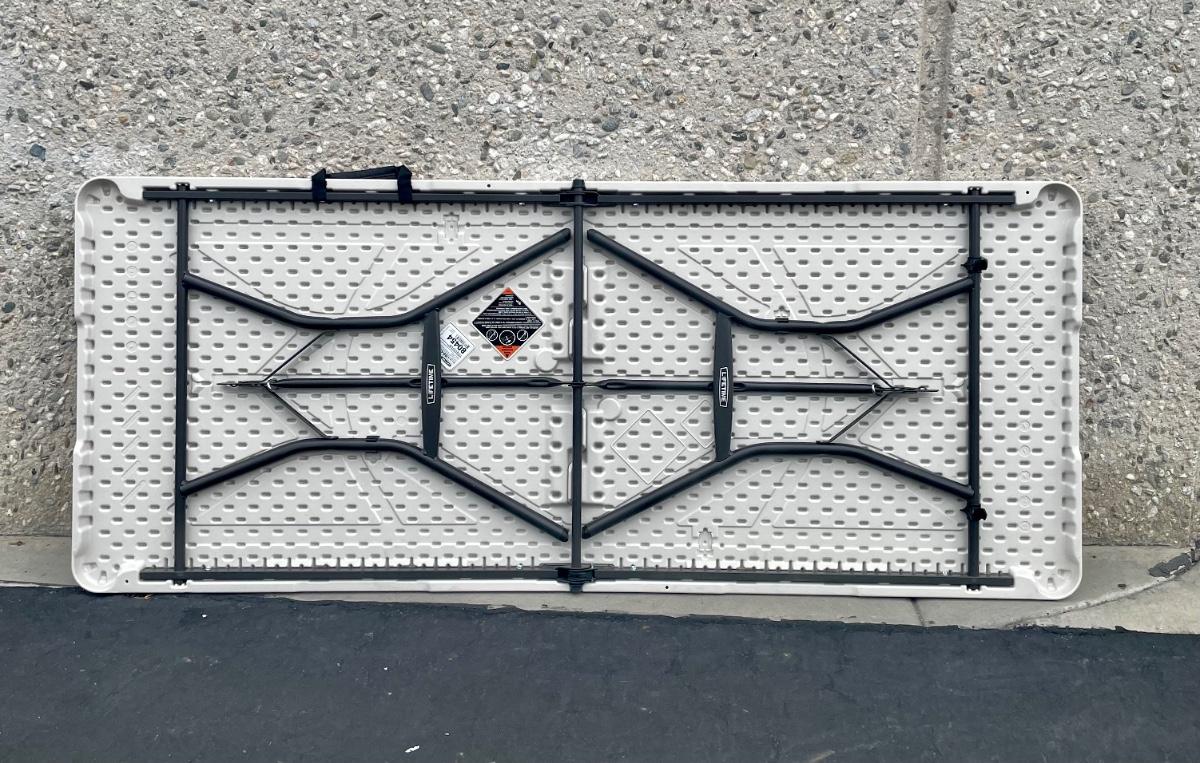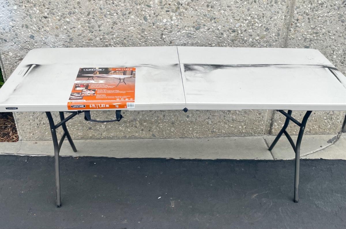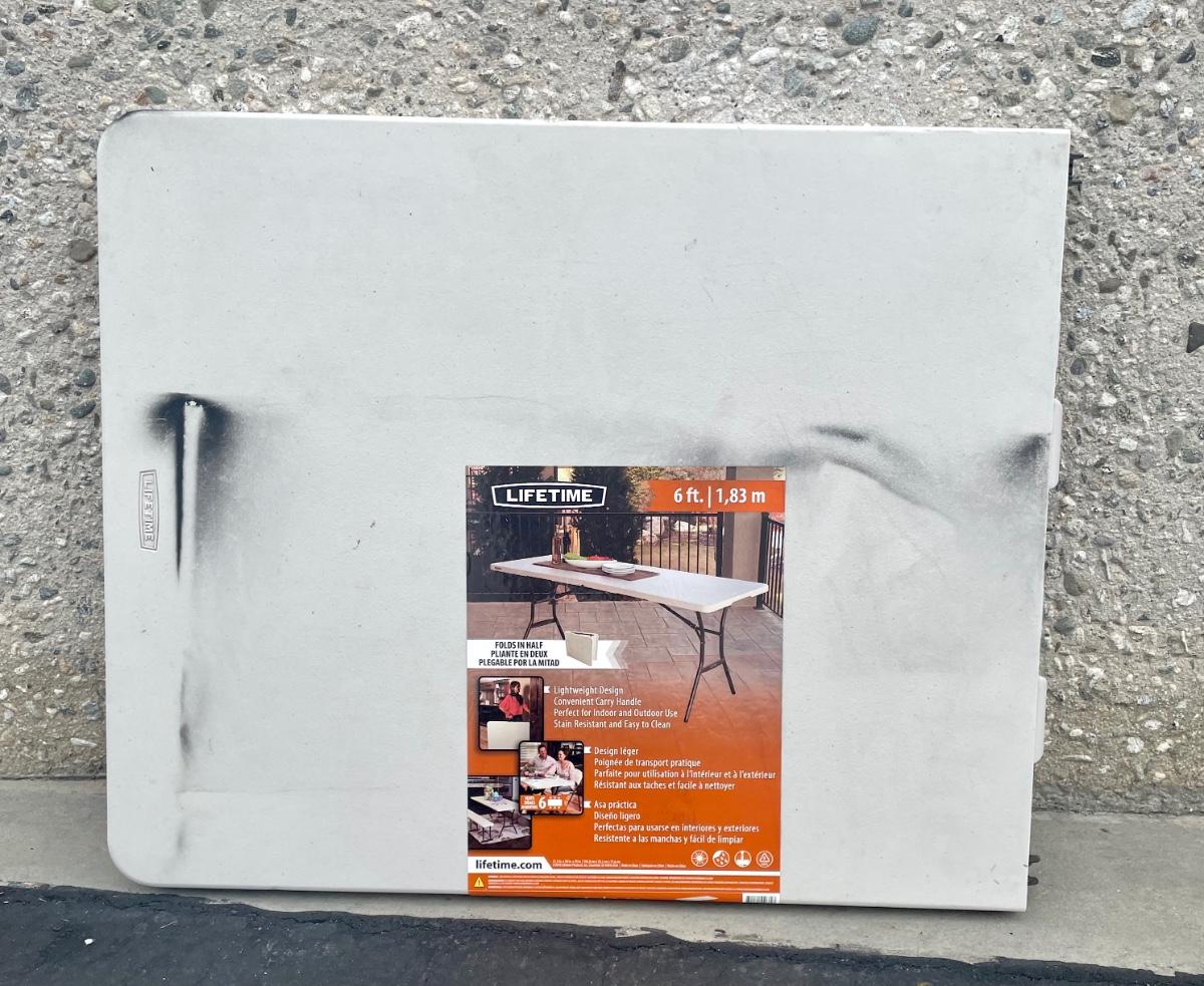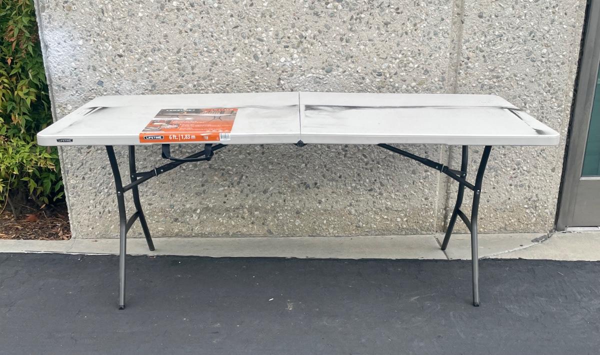 Lifetime Folding Resin Table with Folding Legs. Size when open is 30" x 72", measures 36" x 30" when folded. Was used once as a painting stand, has some black paint overspray (might be able to clean it off). Otherwise in near-new condition.