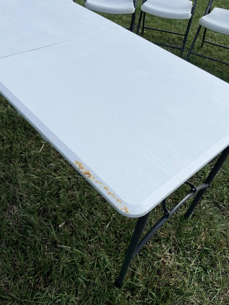 All pieces fold easy ~ Table not folded = 28” H x 60” W x 27.5” D ~ Table folded = 27” x 32” ~ One corner of table needs additional cleaning. Seems to be dried glue, see photos