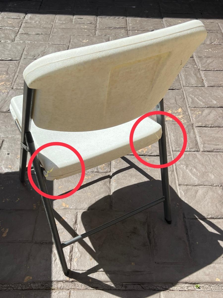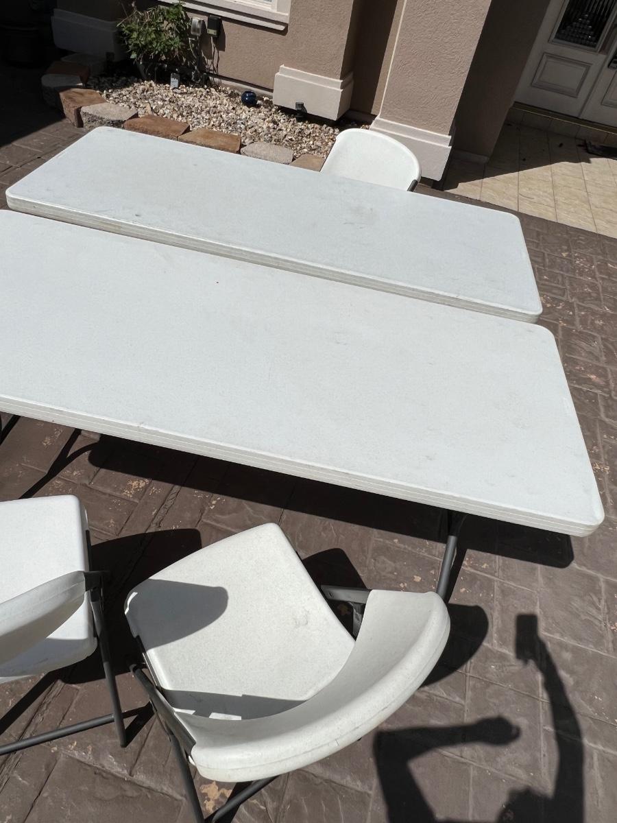 1 of the chairs has minor cracks, you can still sit in it with no problems ~ Tables = 6ft