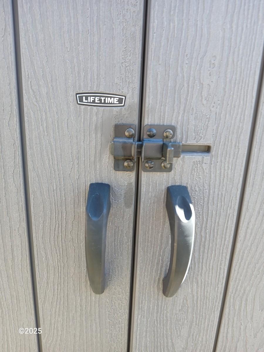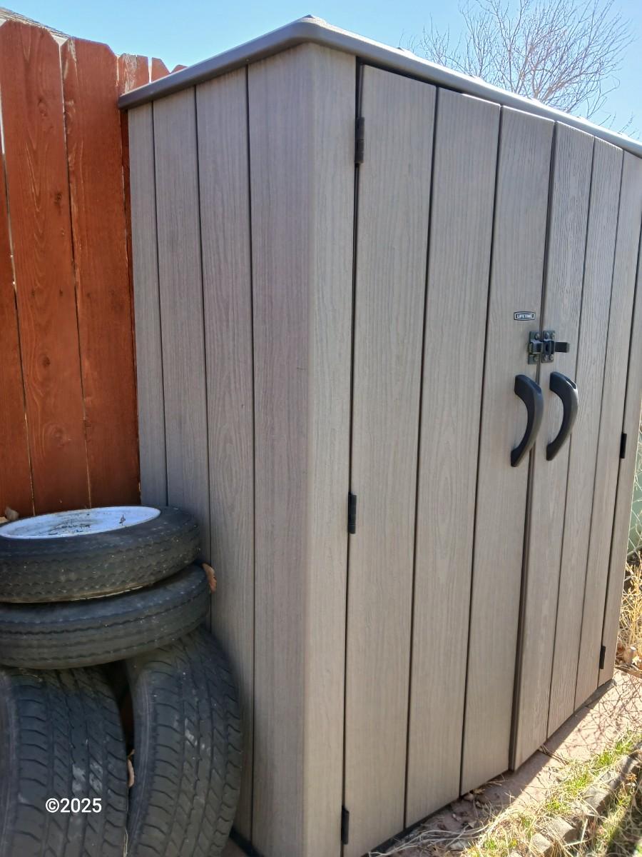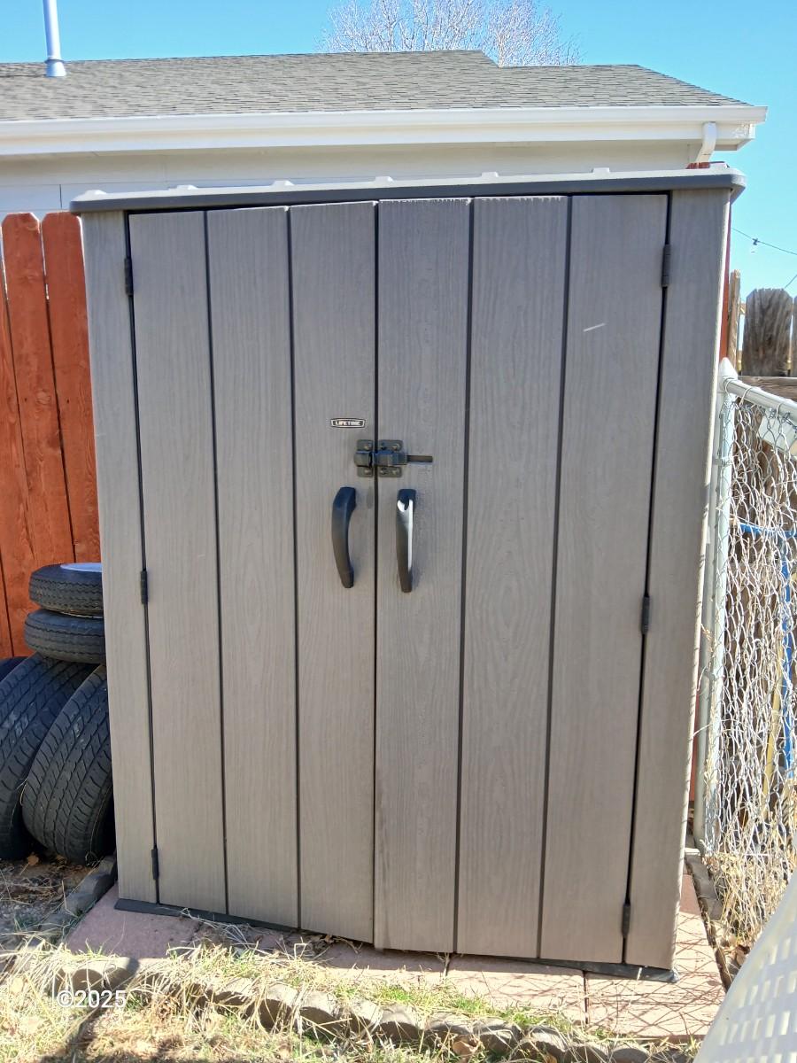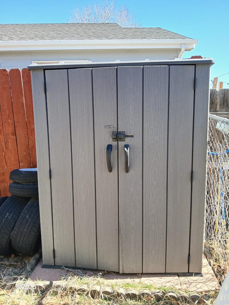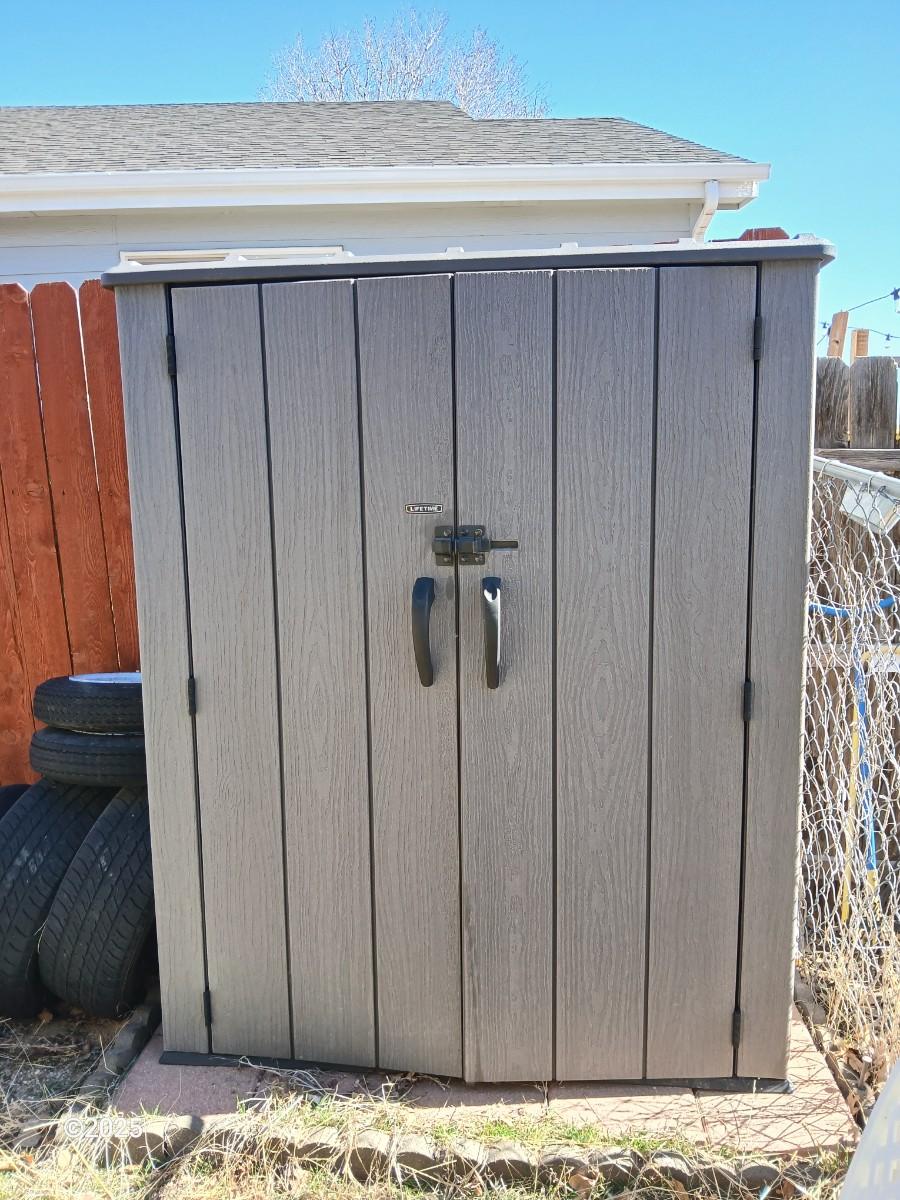 Lifetime storage shed - heavy plastic with instruction booklet and extra parts. Has two adjustable shelves inside