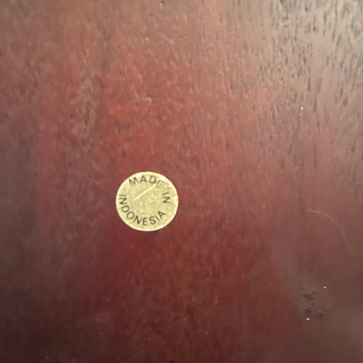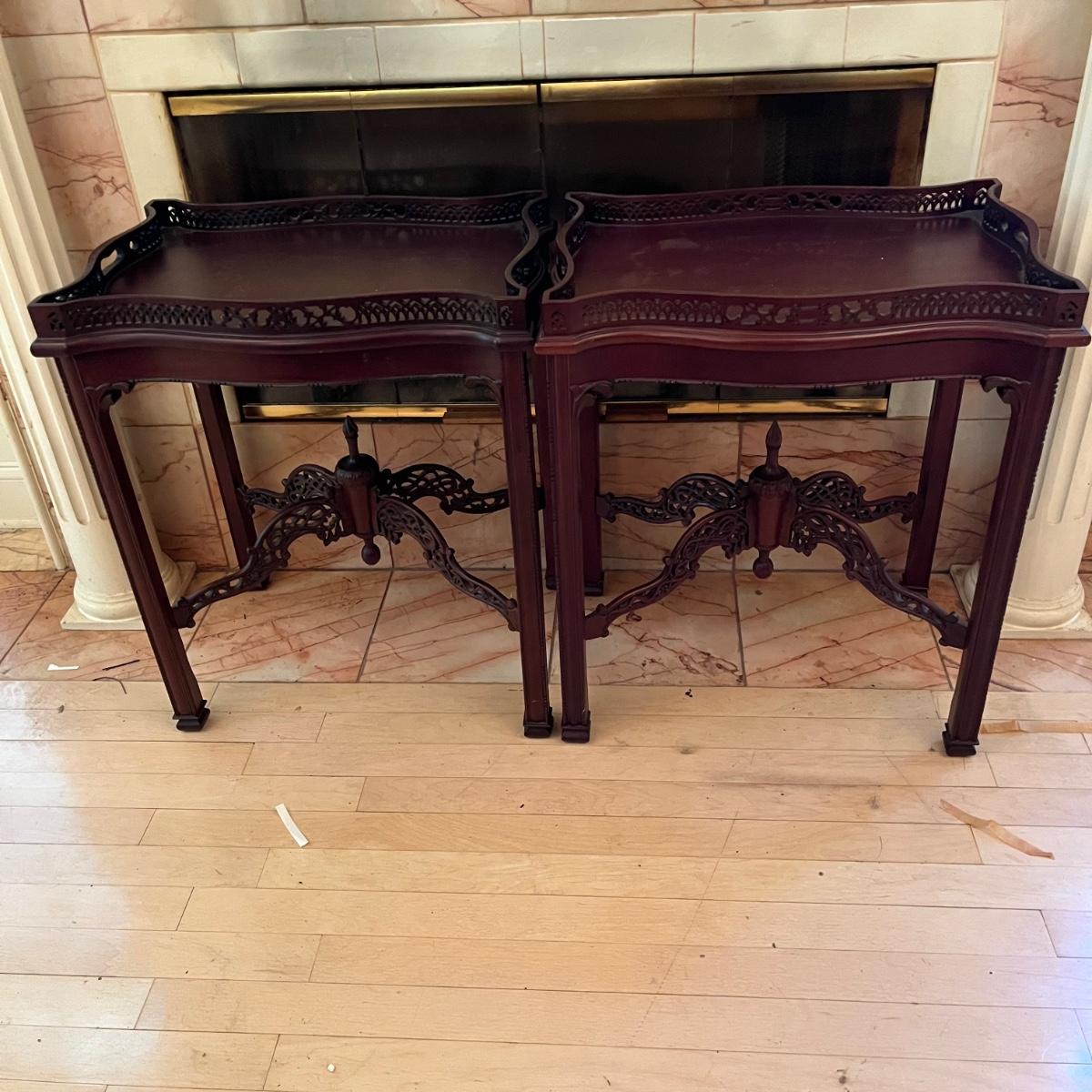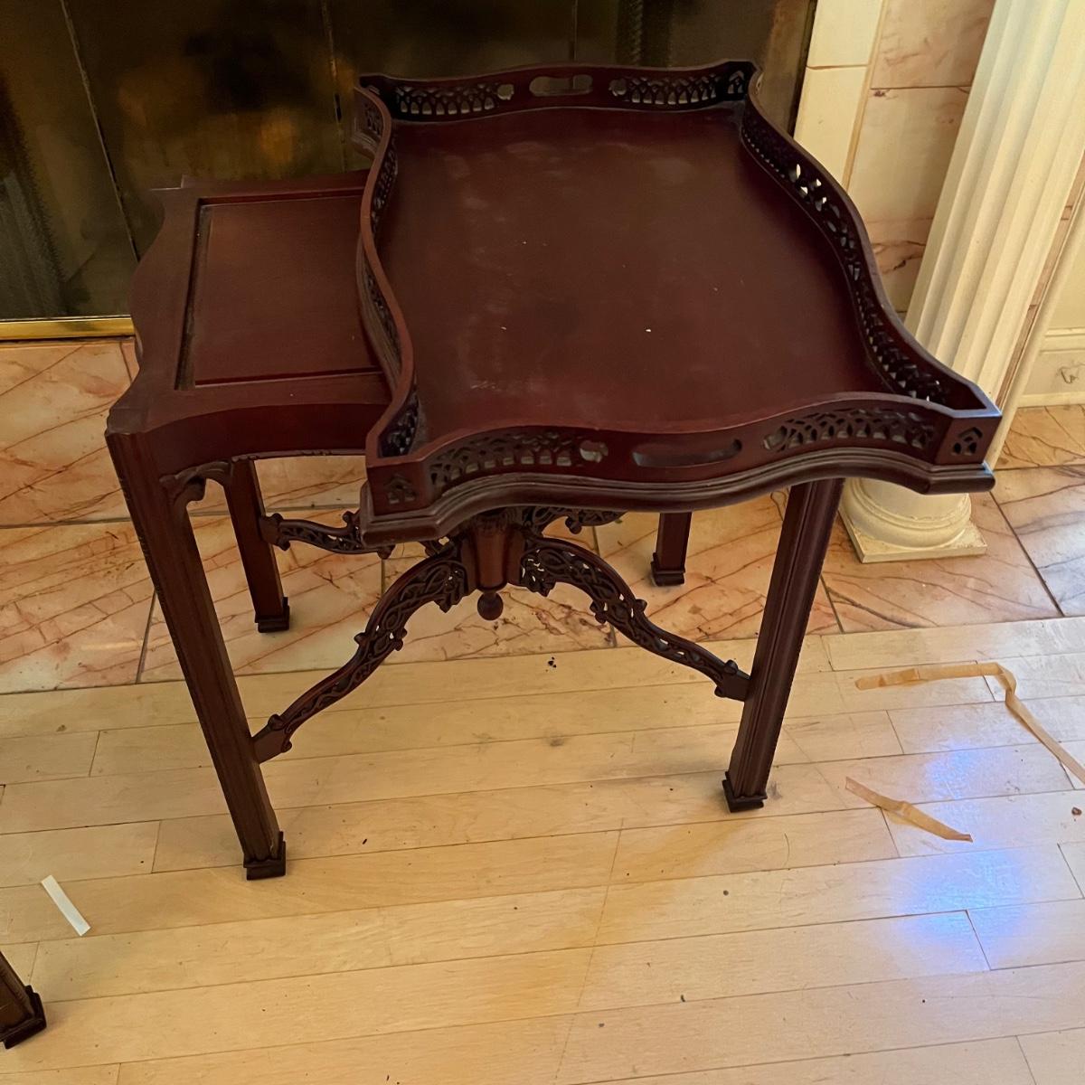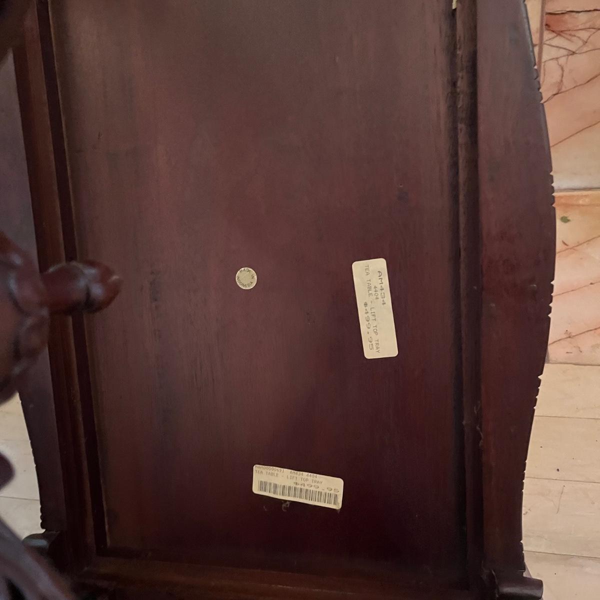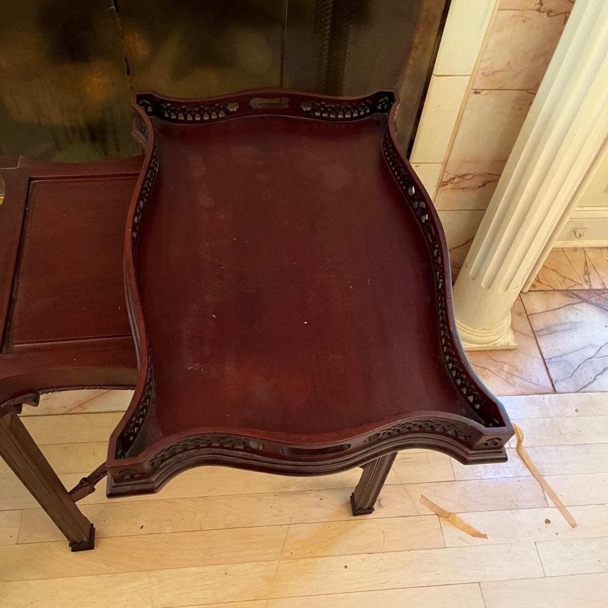 Lot includes a pair of of what appears to be mahogany wood lift top tea tray tables made in Indonesia. Tables are in good condition and have intricate wood design bracing the legs. Tables measure 16.5” x 24” x 27.5”.