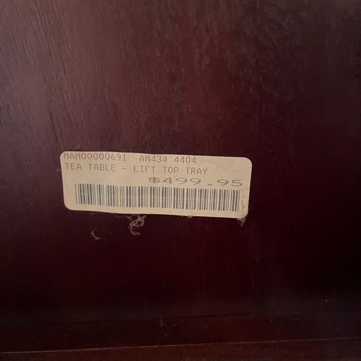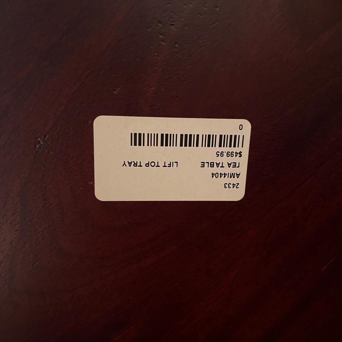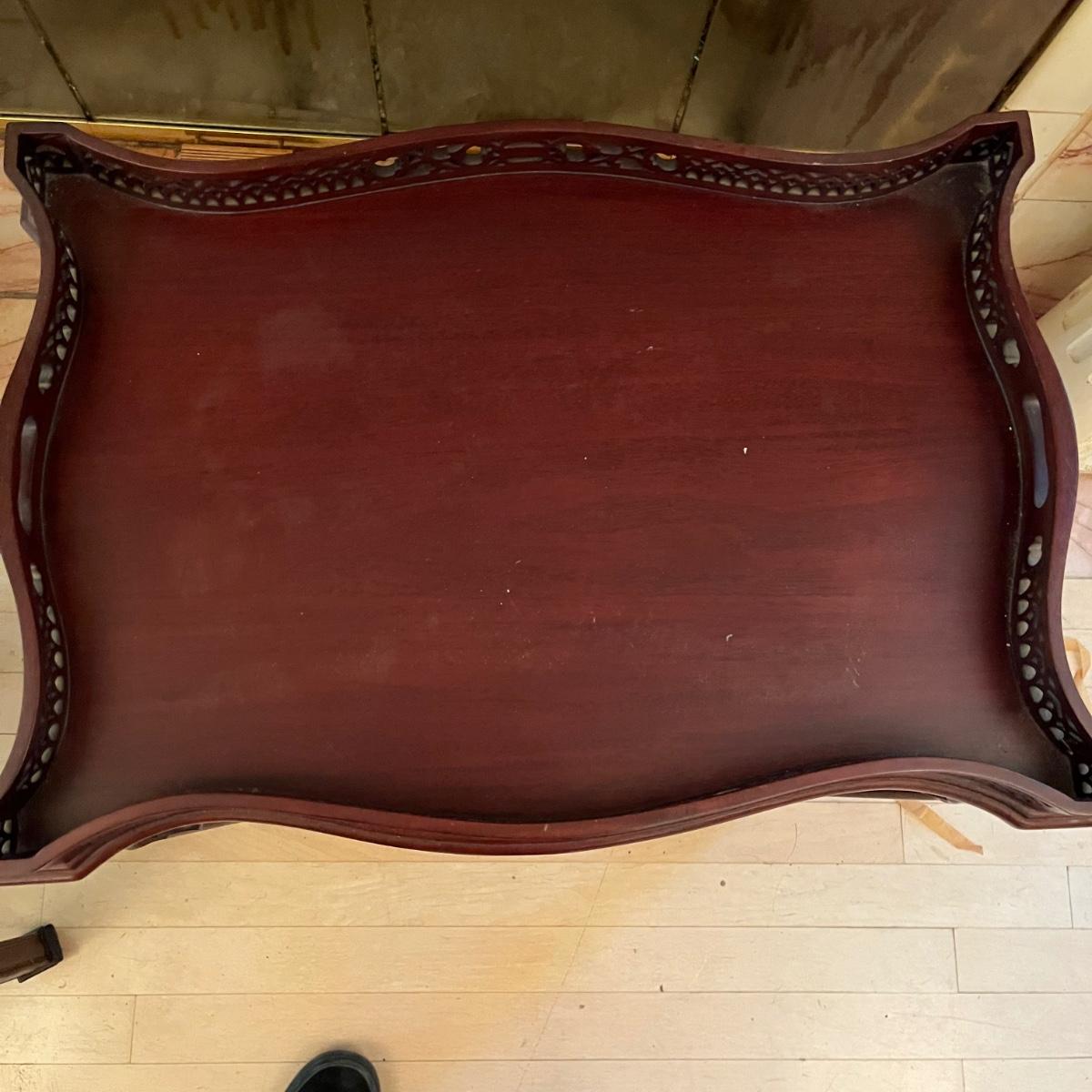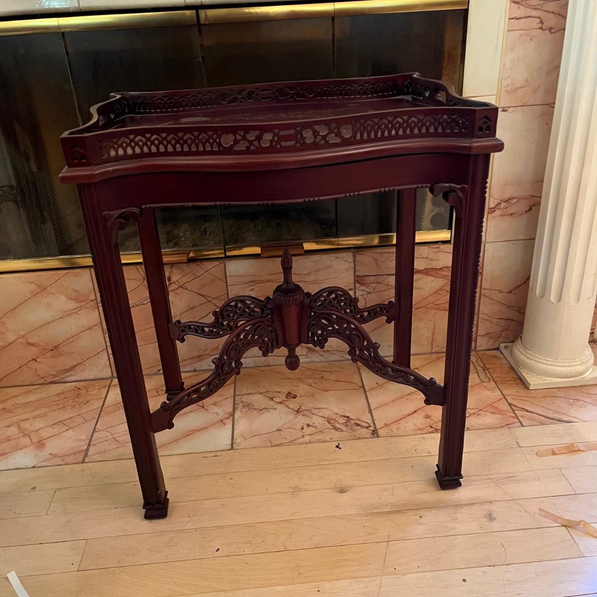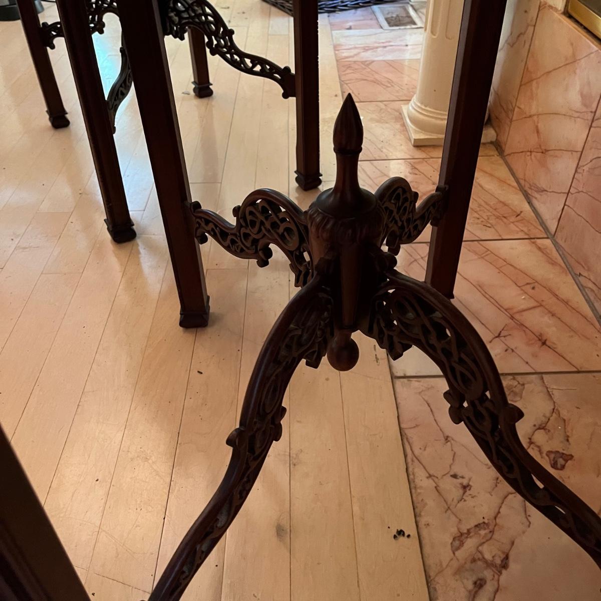 Lot includes a pair of of what appears to be mahogany wood lift top tea tray tables made in Indonesia. Tables are in good condition and have intricate wood design bracing the legs. Tables measure 16.5” x 24” x 27.5”.