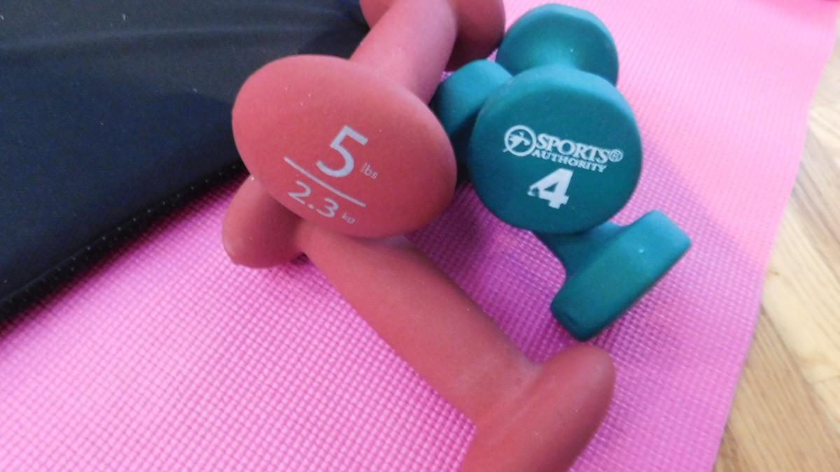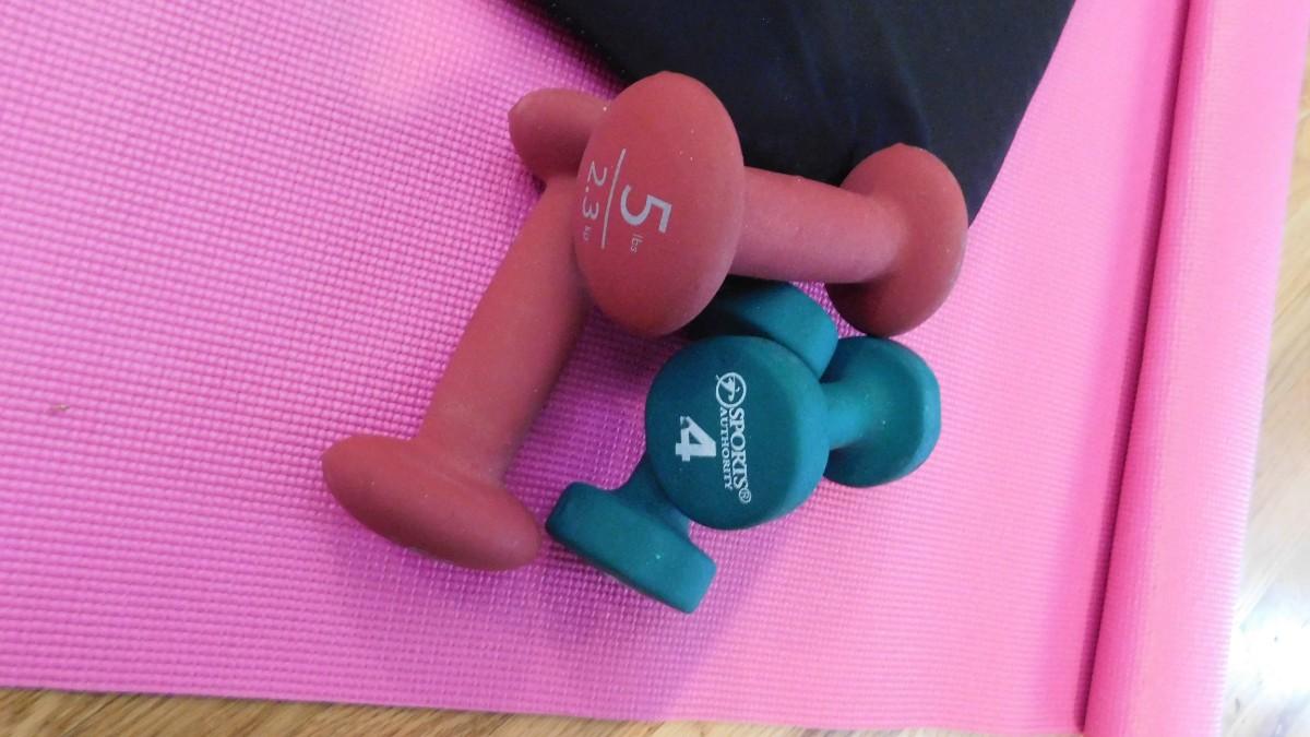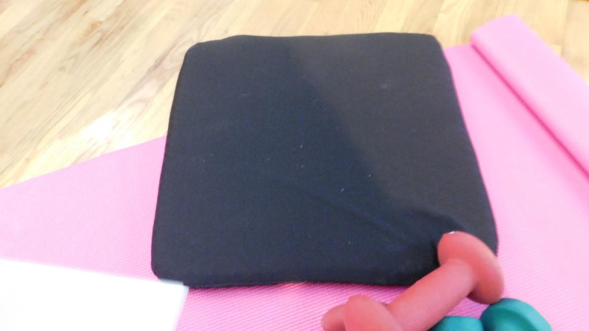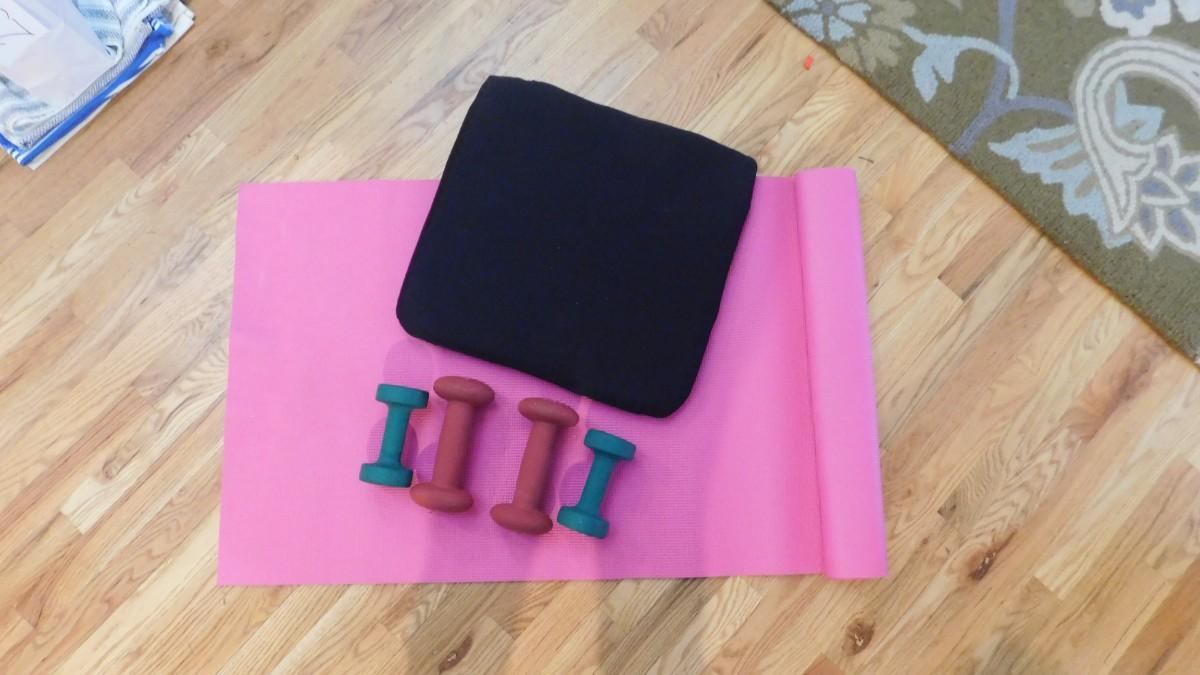 HAND WEIGHTS, YOGA MAT AND GEL CHAIR CUSHION