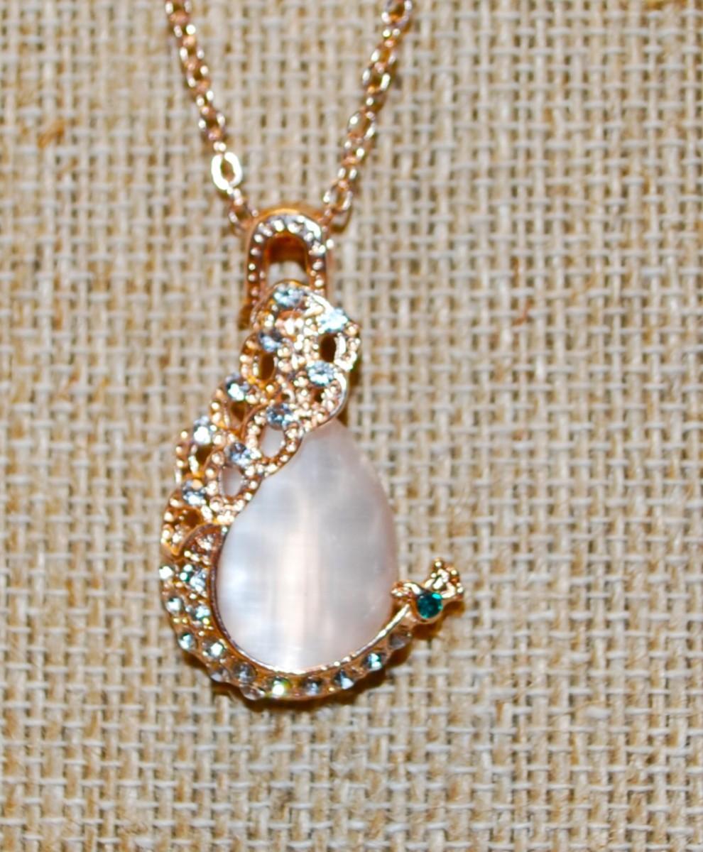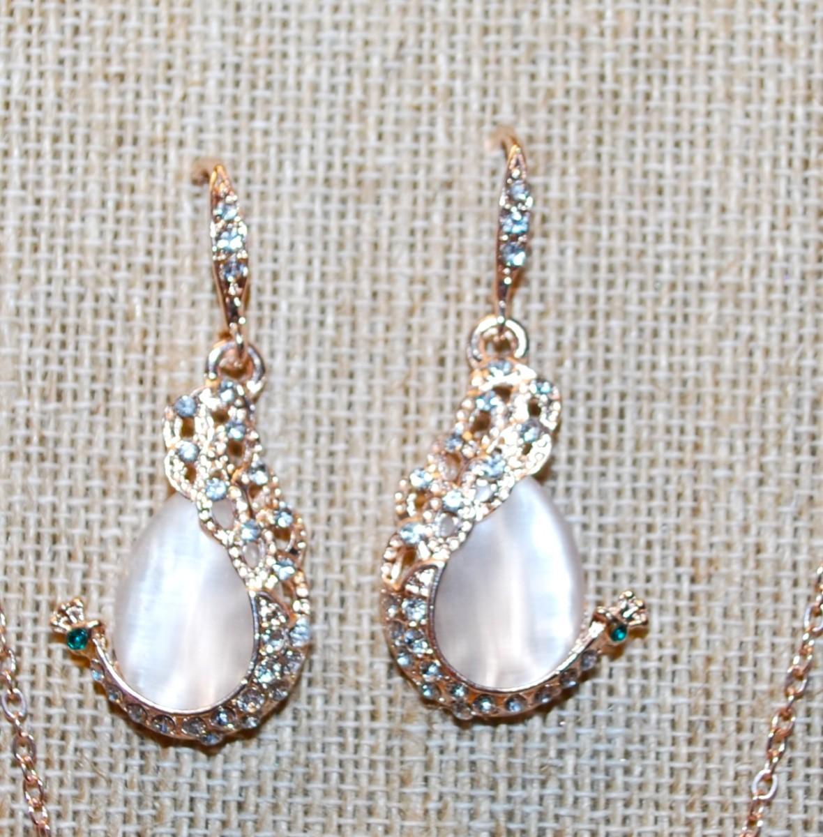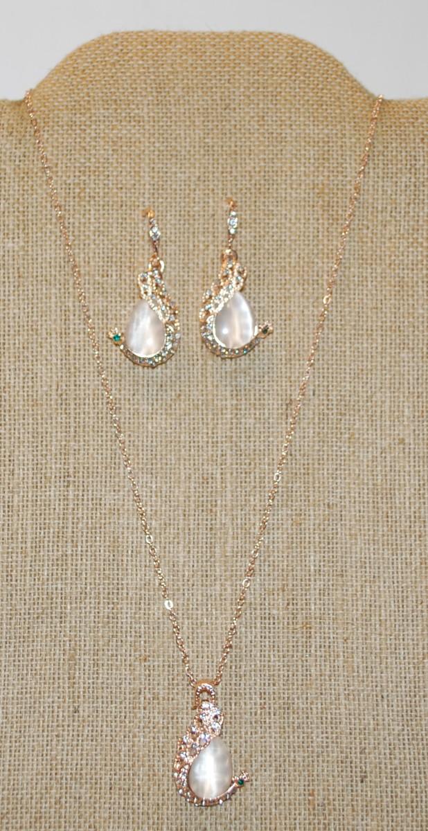 Light Beige Oval Stone PENDANT (1¼" x ¾") and Matching Earrings (1½" x ¾") Set on a Rose Gold Tone Necklace Chain 18" L