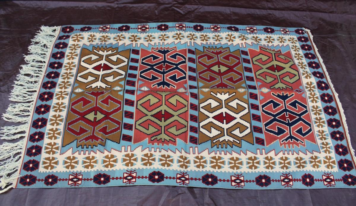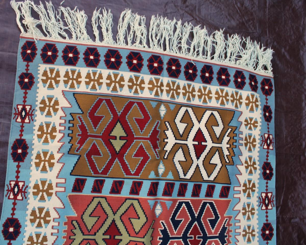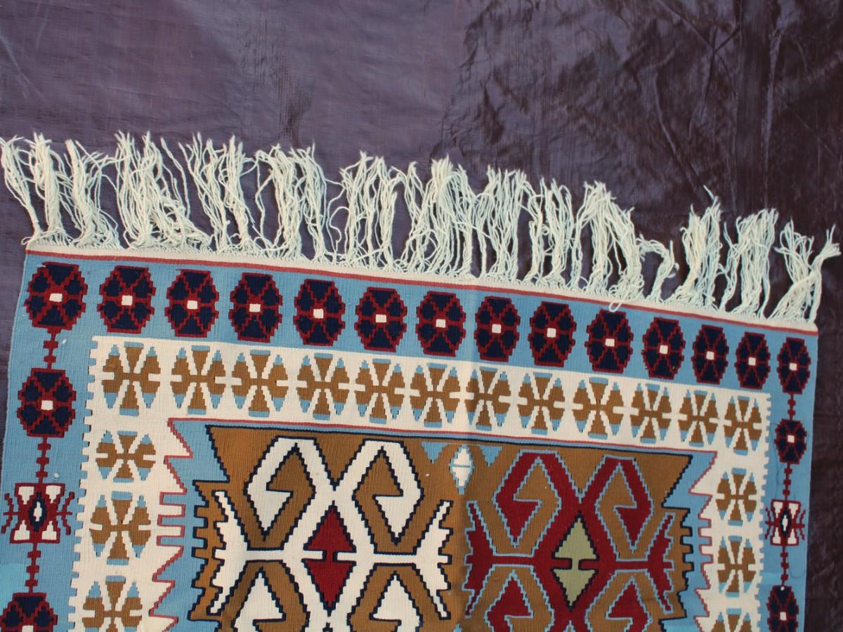 Light blue and brown Turkish wool rug; flat weave, hand made