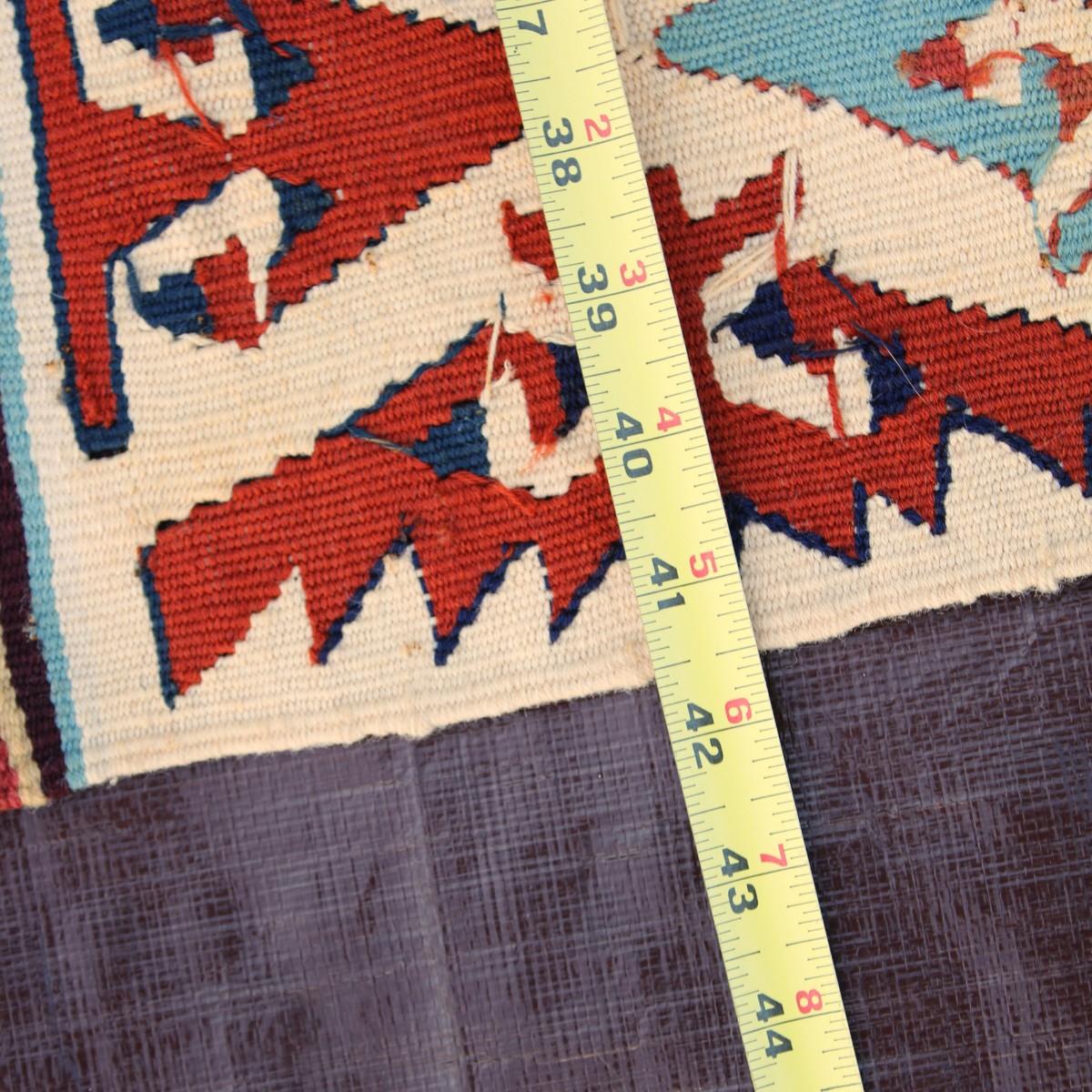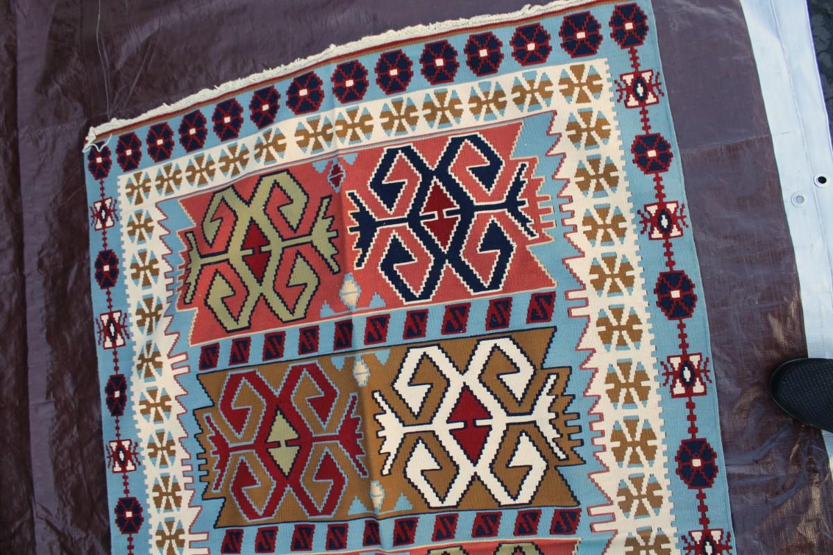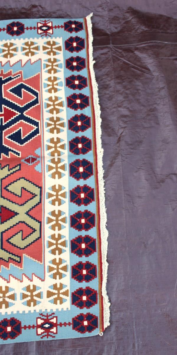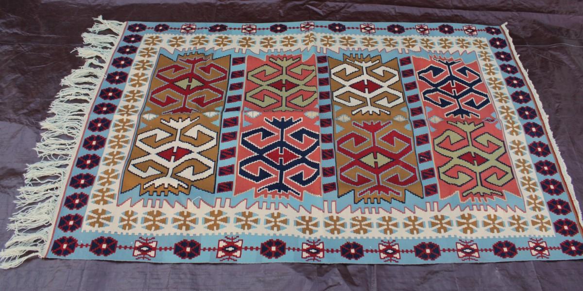 Light blue and brown Turkish wool rug; flat weave, hand made