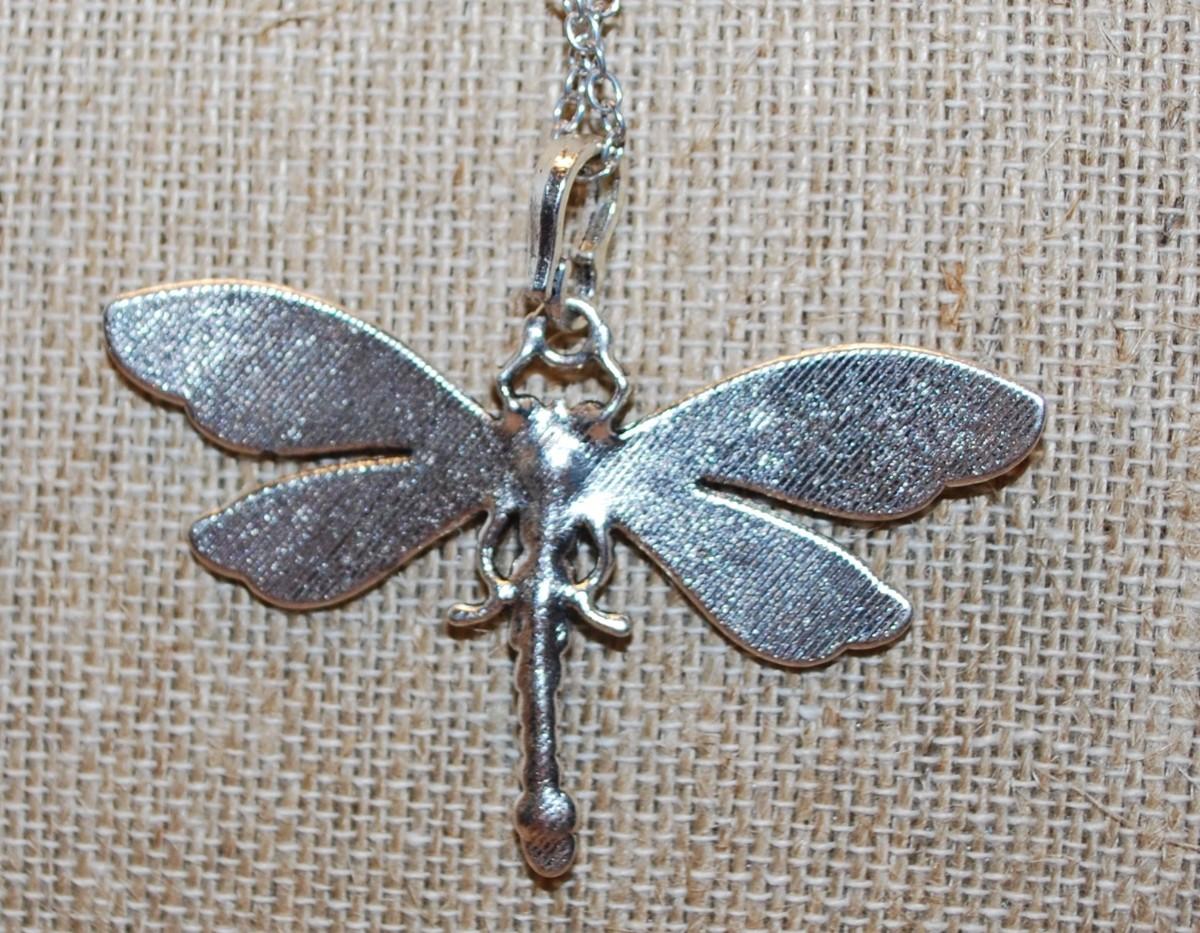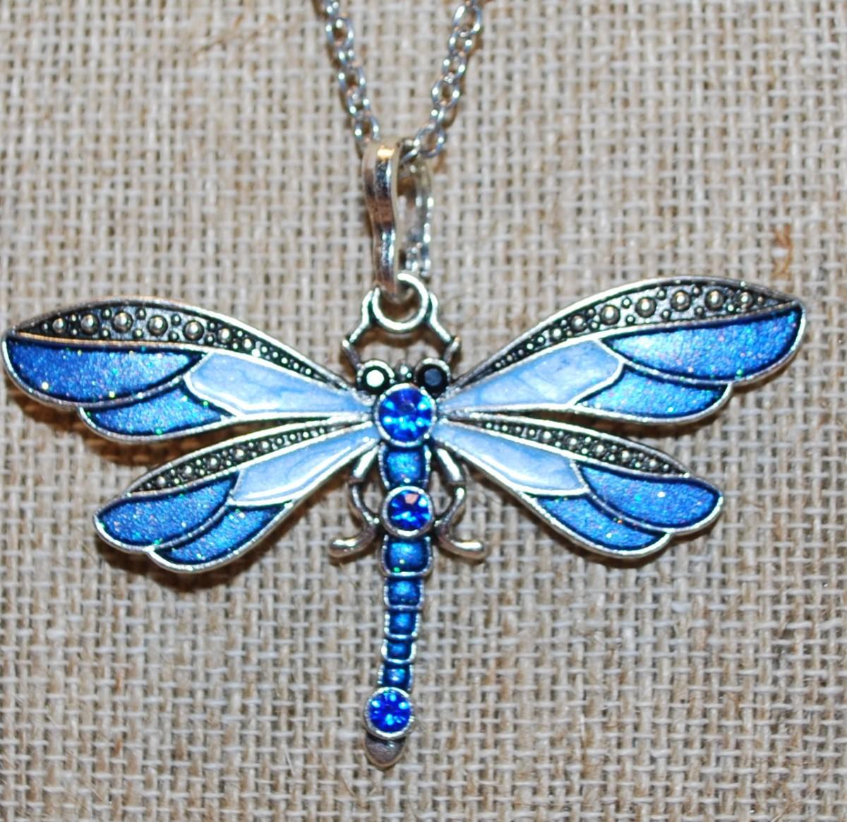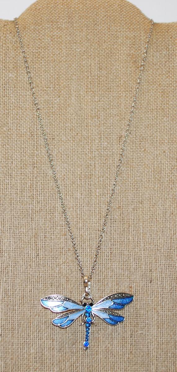 LIGHT BLUE & DARK BLUE Dragonfly PENDANT (2½" x 2") on a Silver Tone Necklace Chain 19" L