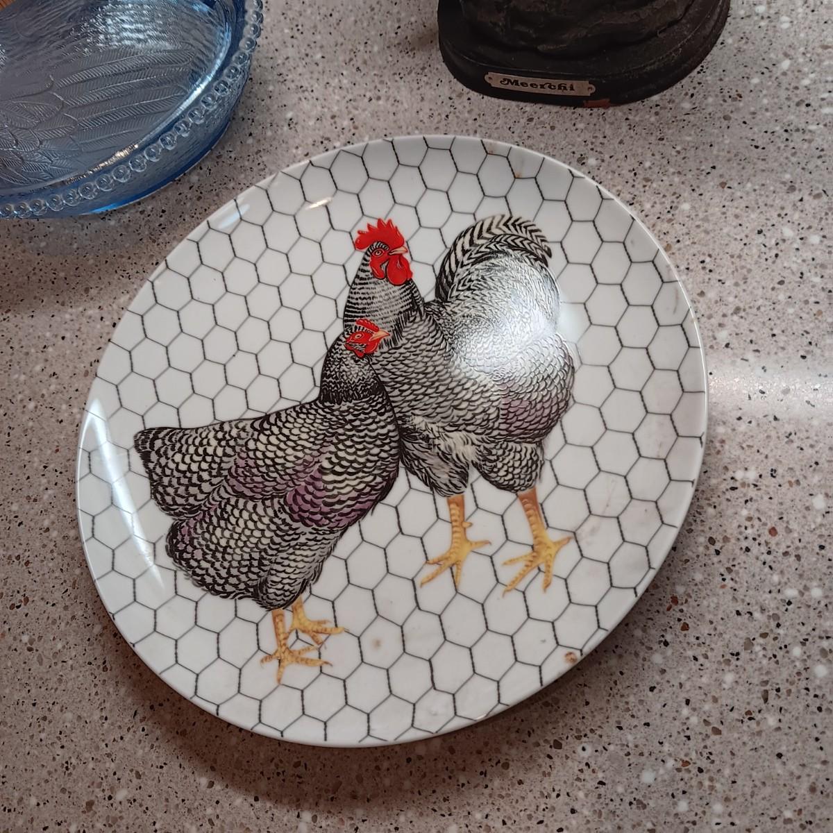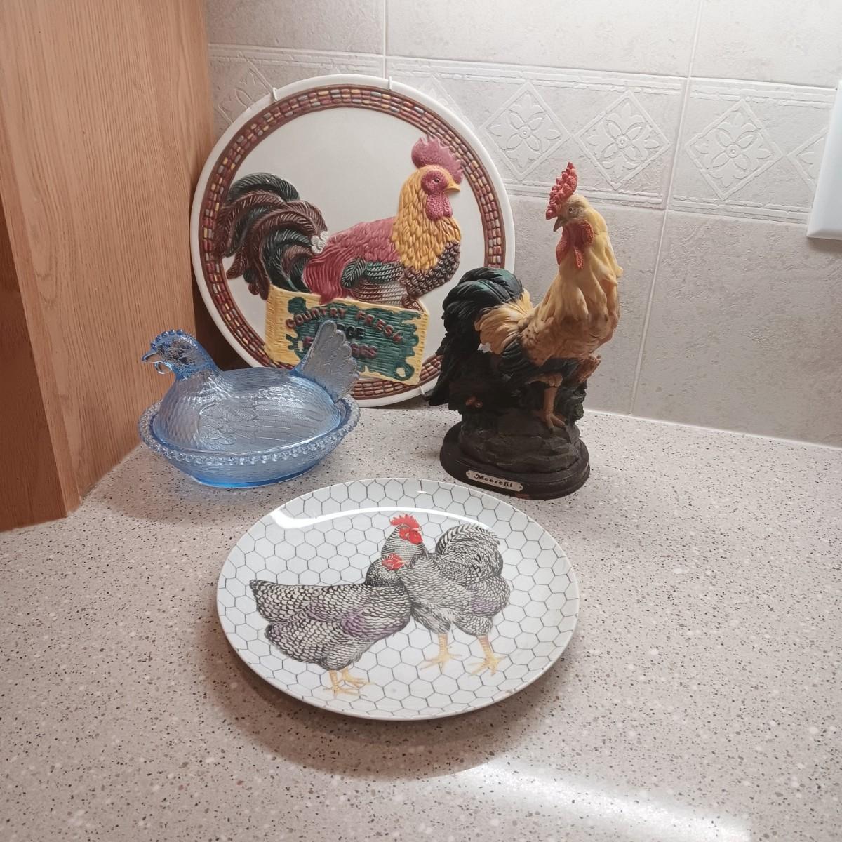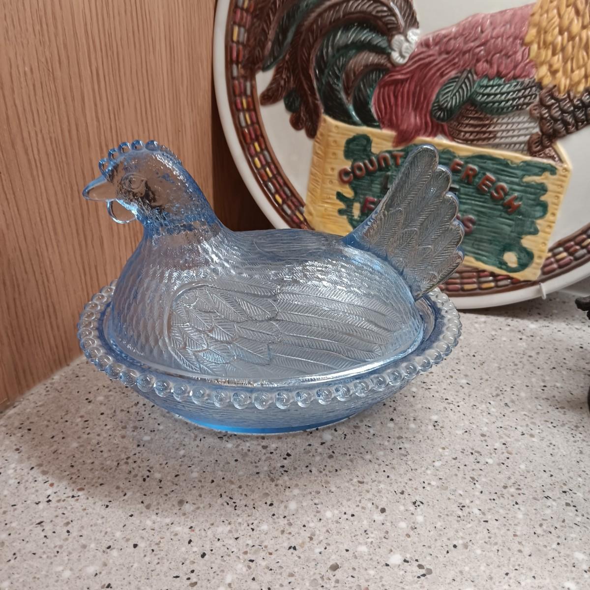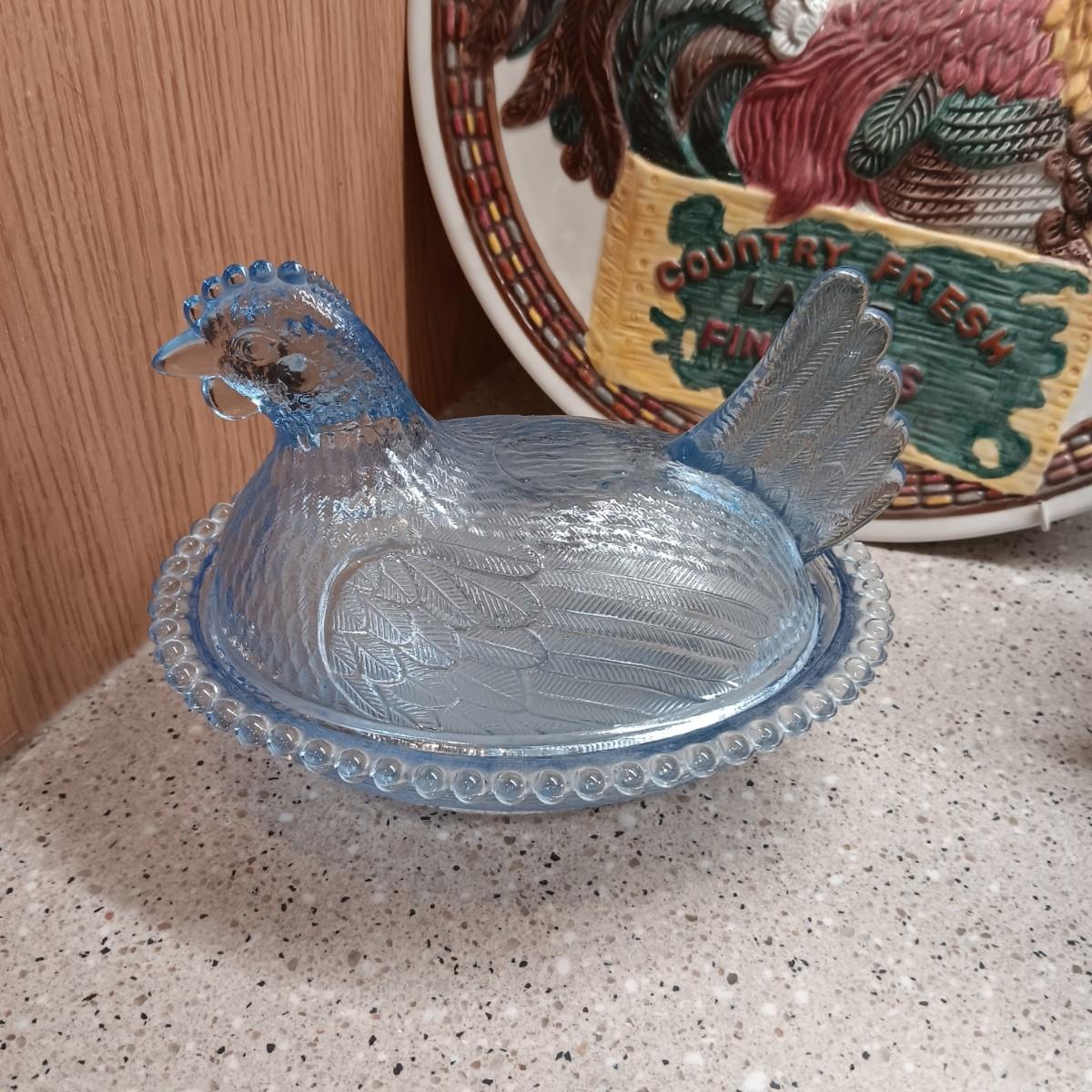 LIGHT BLUE GLASS HEN ON NEST, PLATES AND FREESTANDING ROOSTER