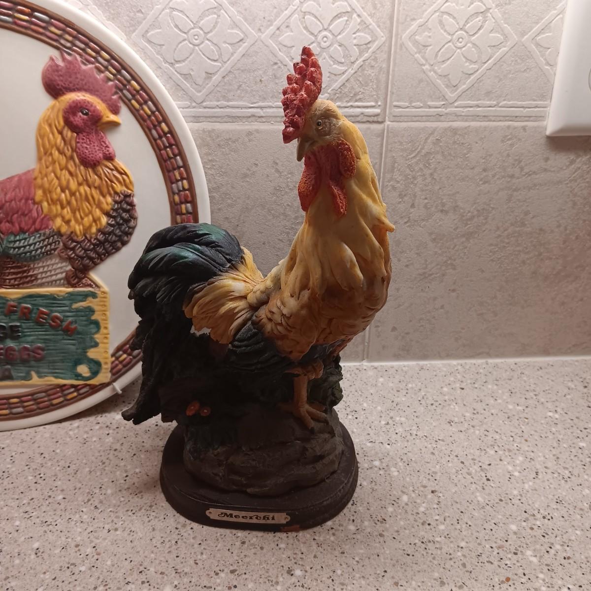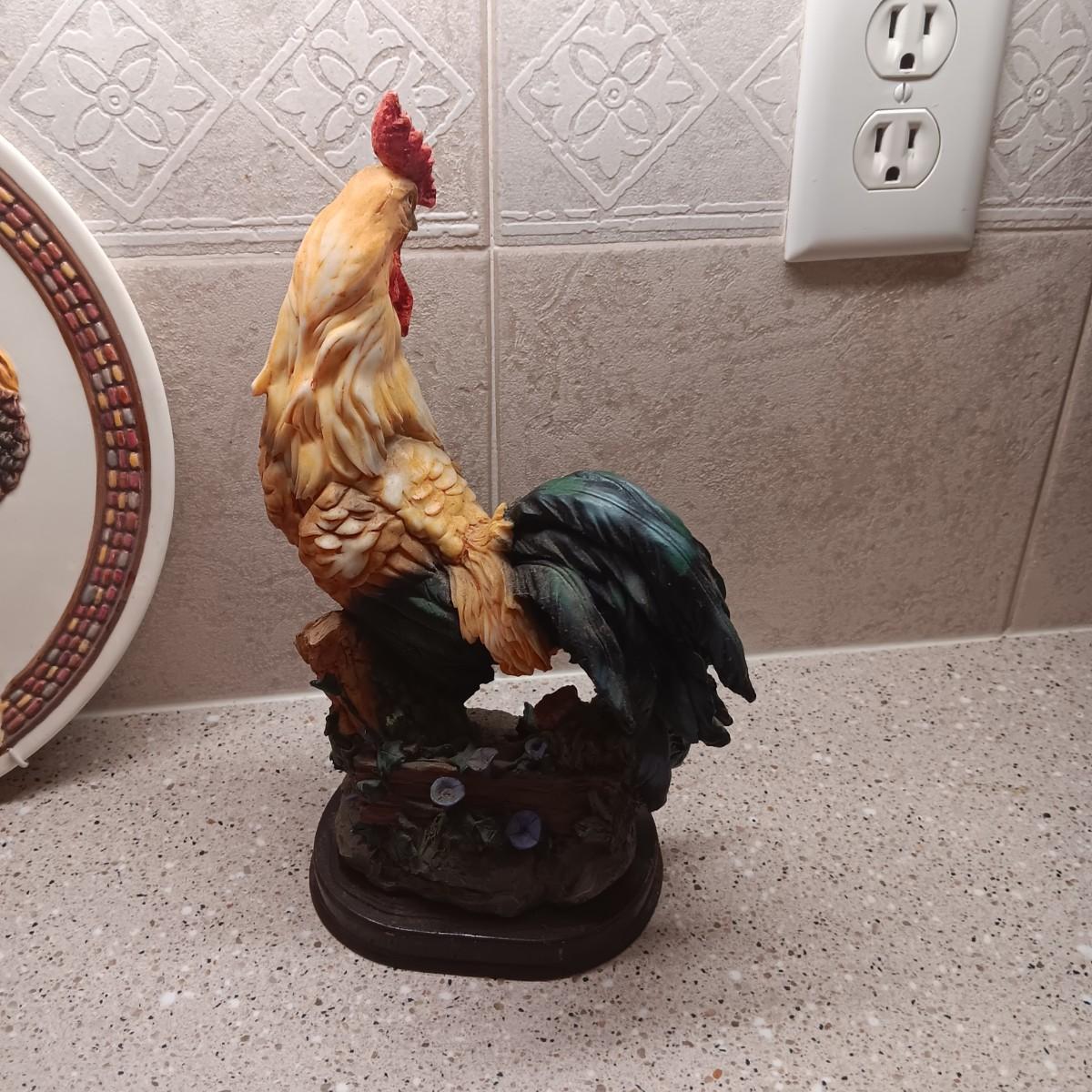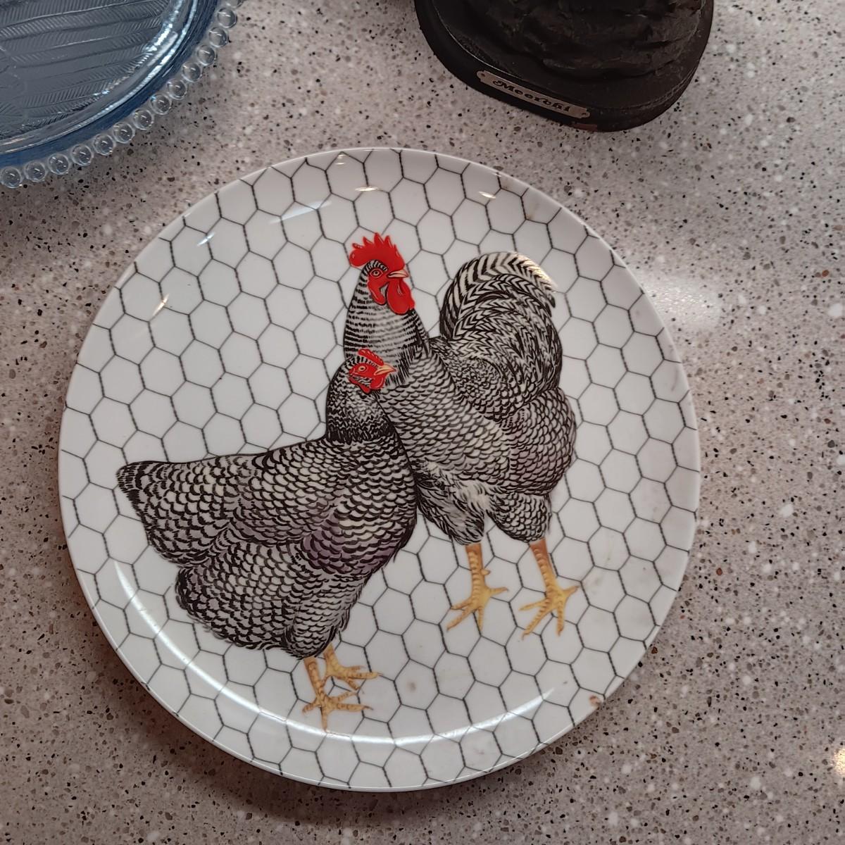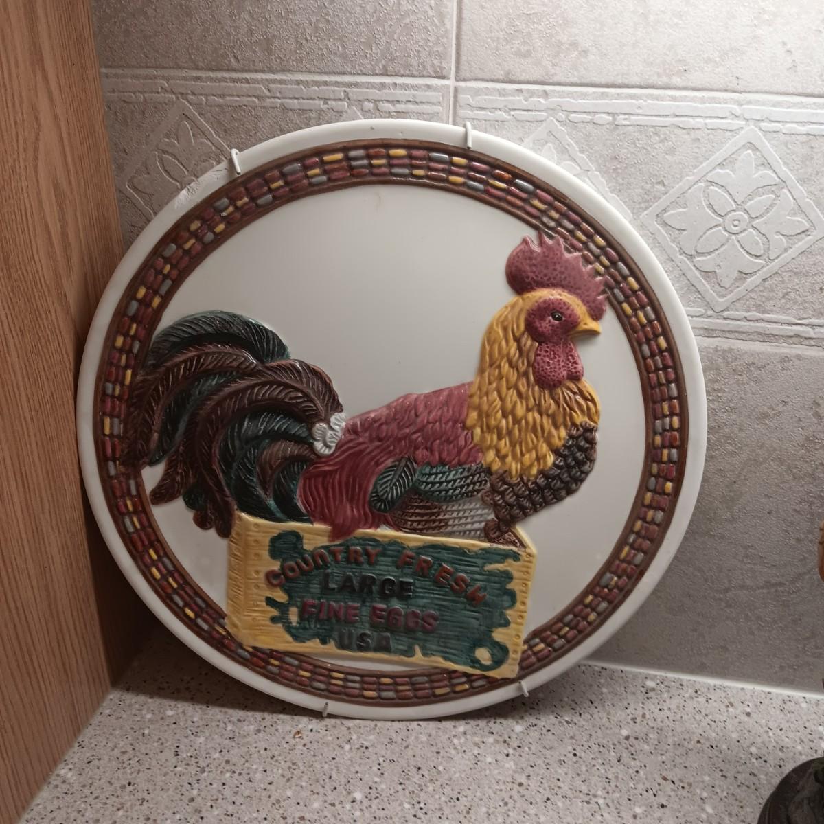 LIGHT BLUE GLASS HEN ON NEST, PLATES AND FREESTANDING ROOSTER