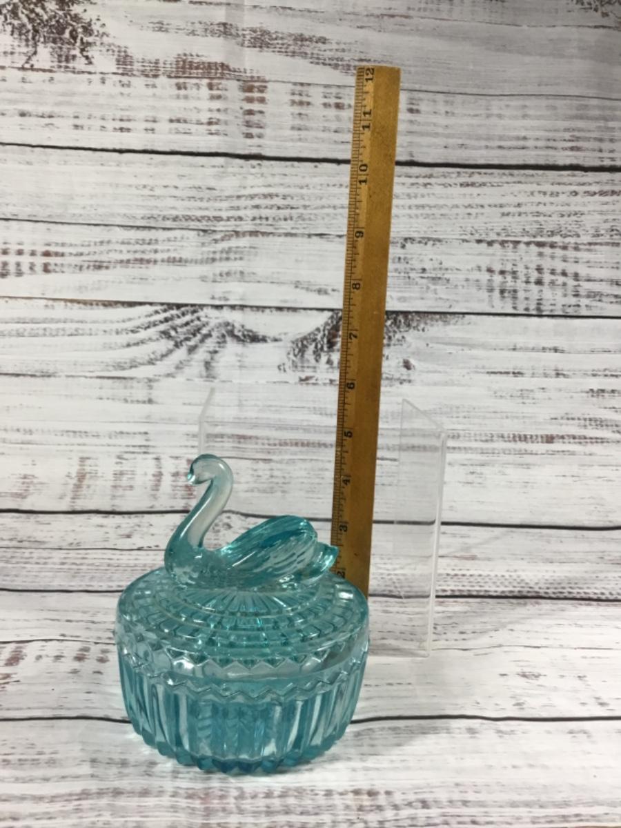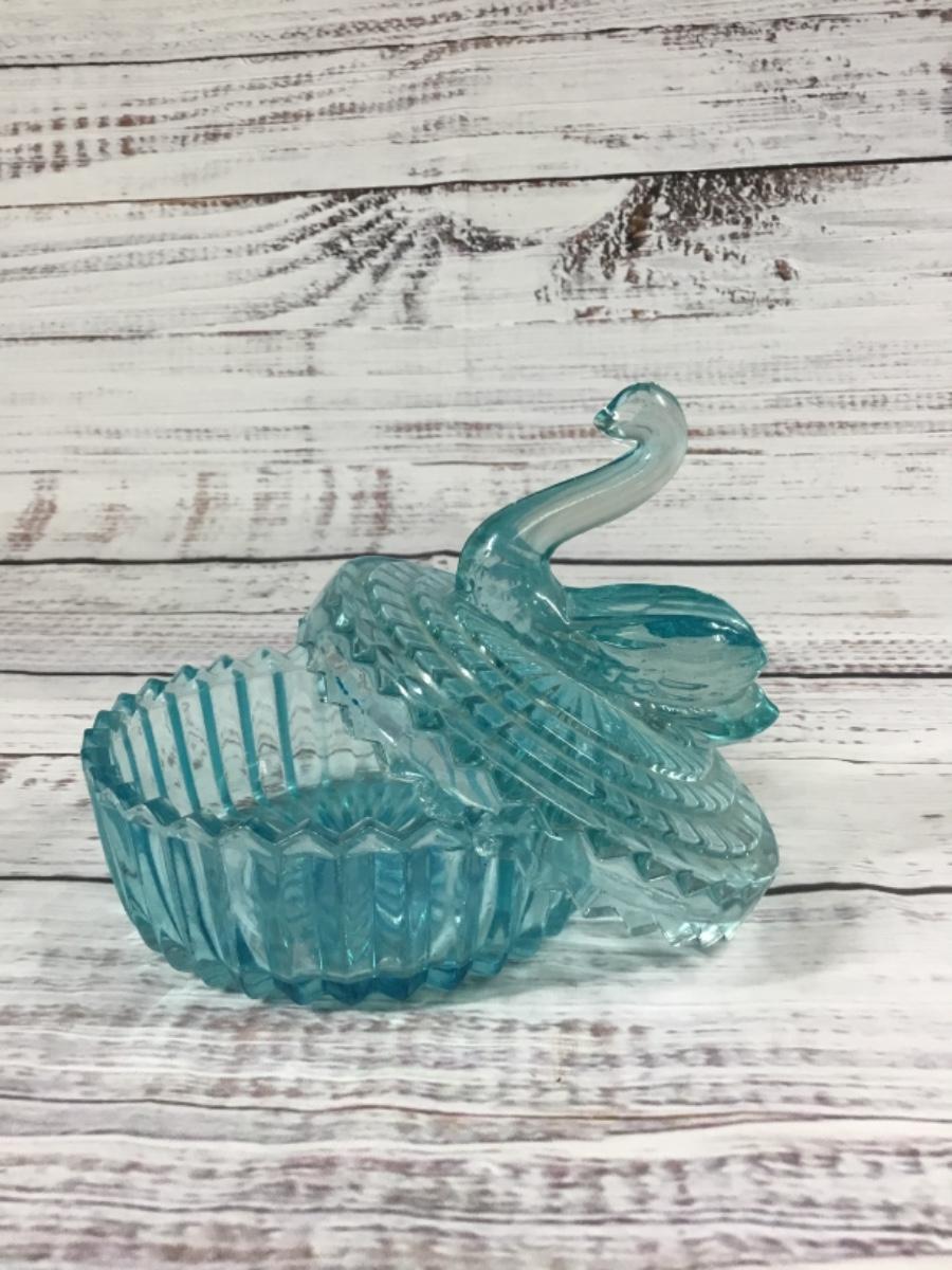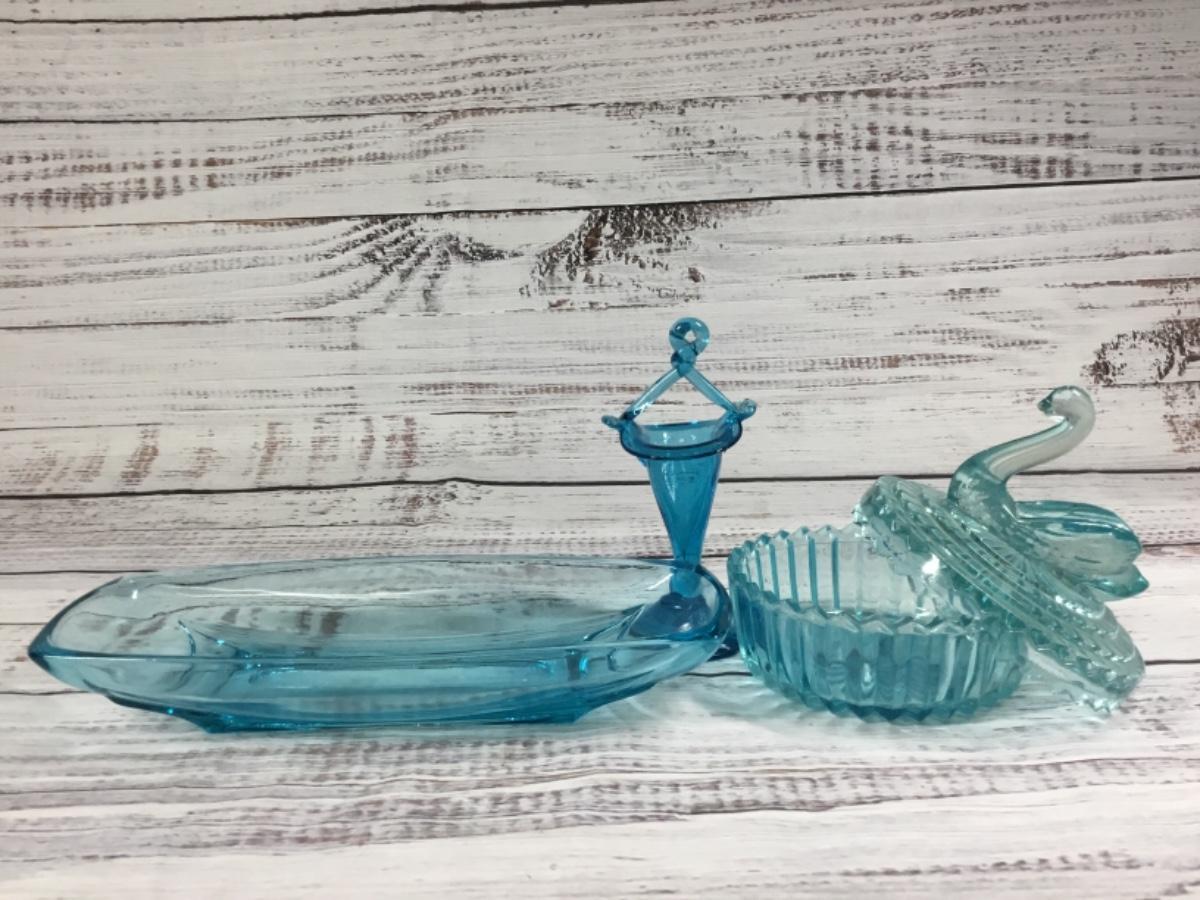 The set of three includes: a plate, bowl, and a shot glass. All items are in good condition. The swan design on the top of the bowl is missing some glass.