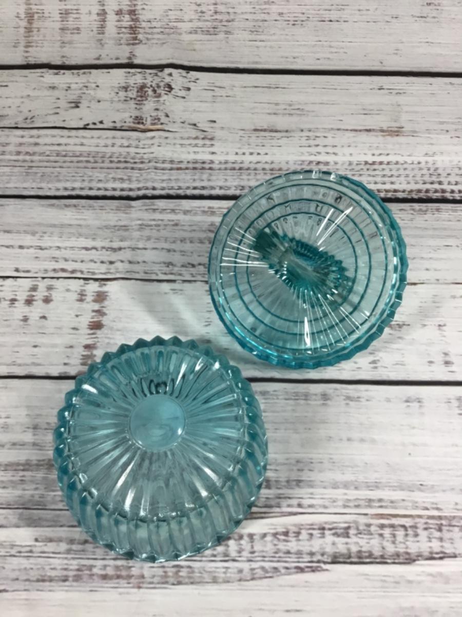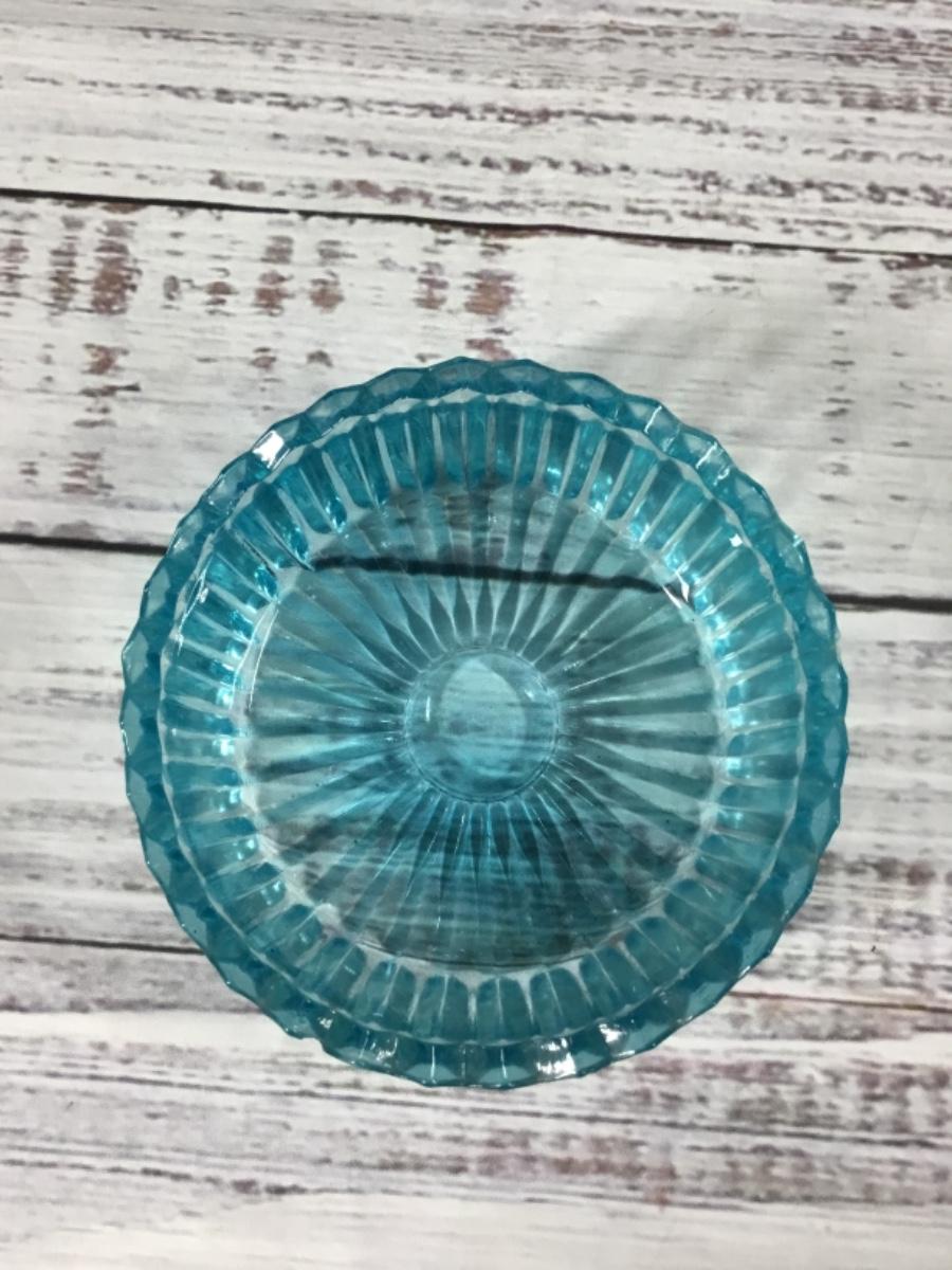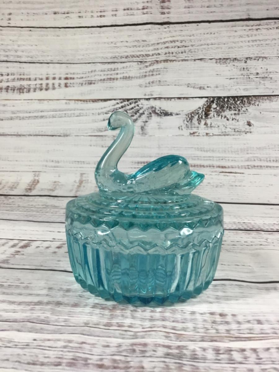 The set of three includes: a plate, bowl, and a shot glass. All items are in good condition. The swan design on the top of the bowl is missing some glass.