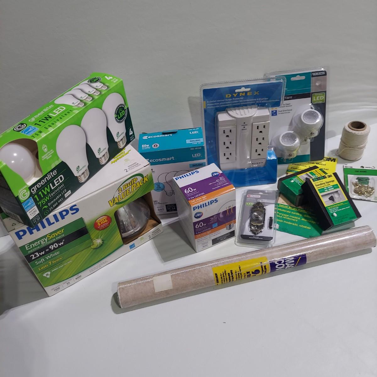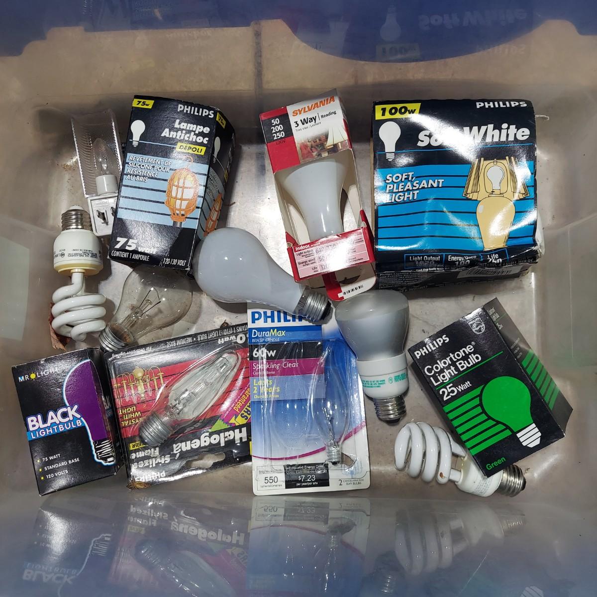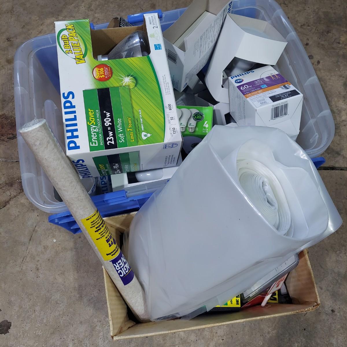 Lot includes a bin full of light bulbs that appear to be unused in original packaging. Plus several miscellaneous hardware items and some hand tools. Please see photos for details. Local Pickup Only