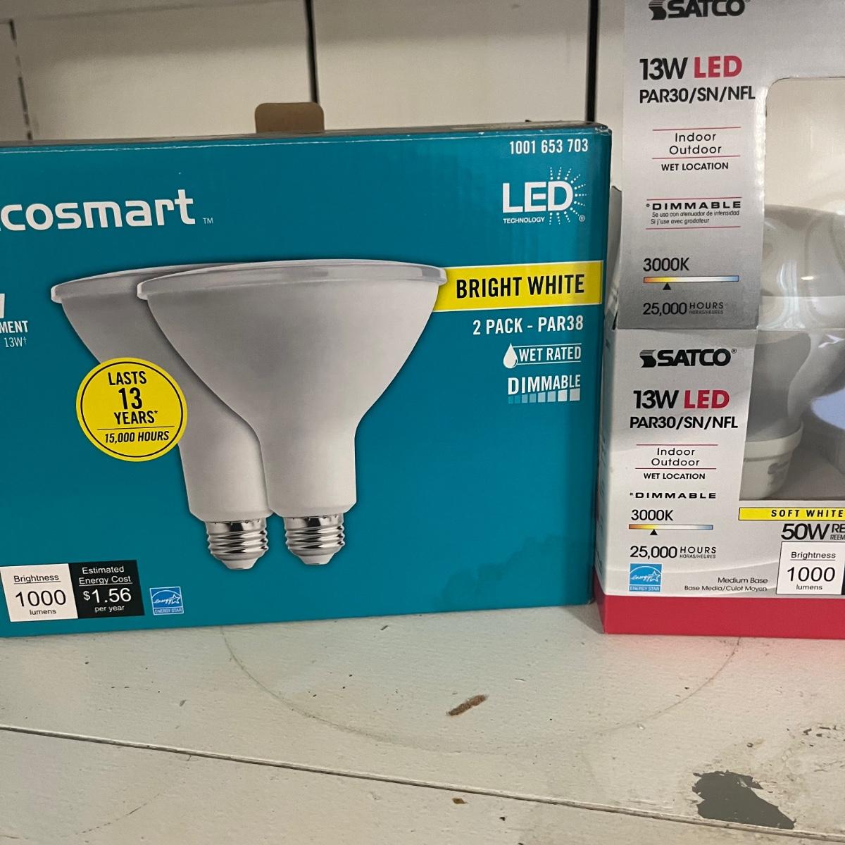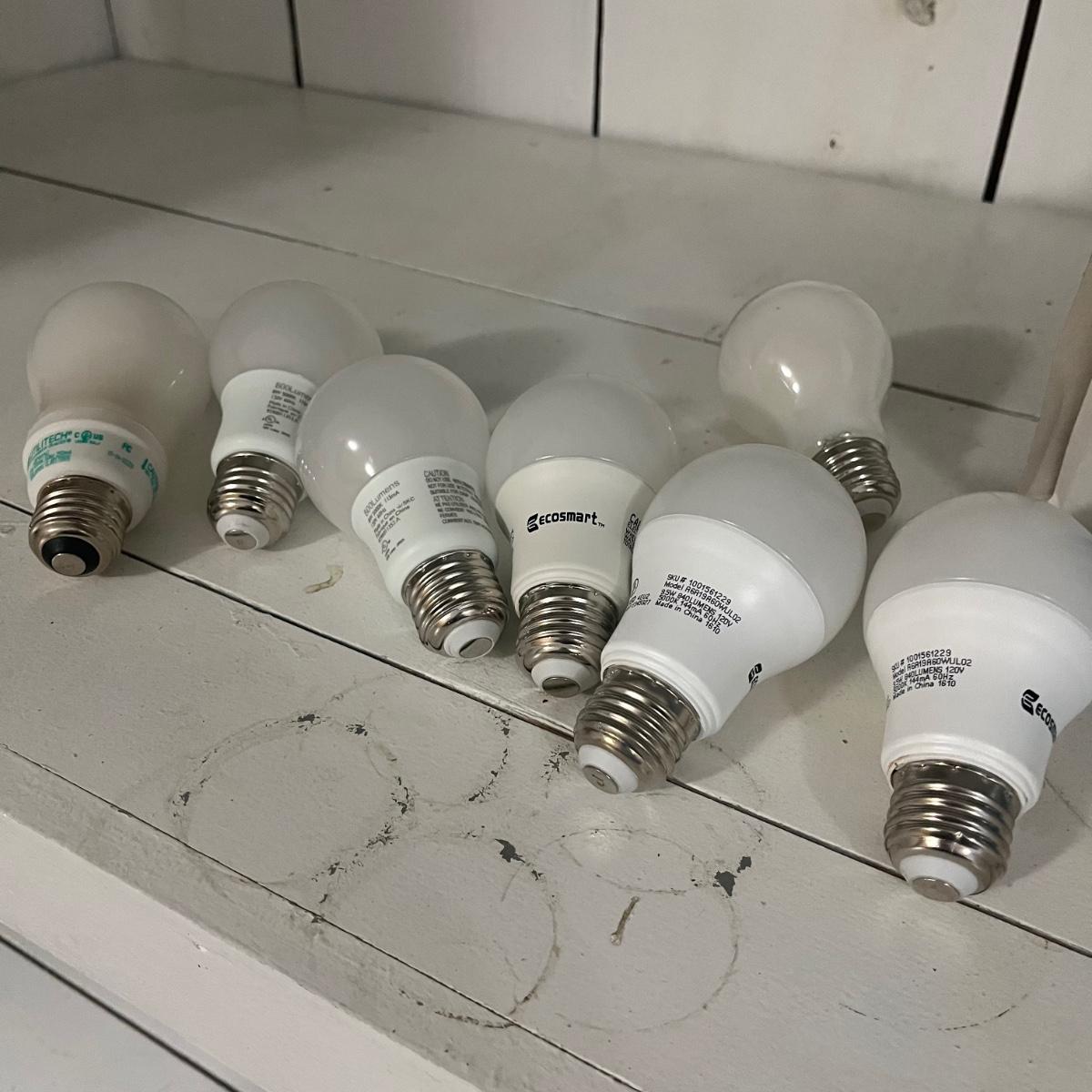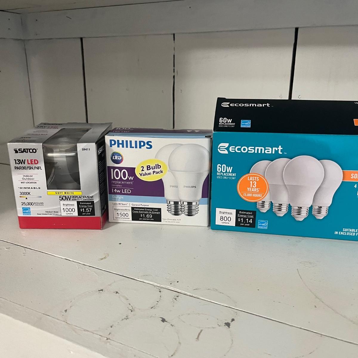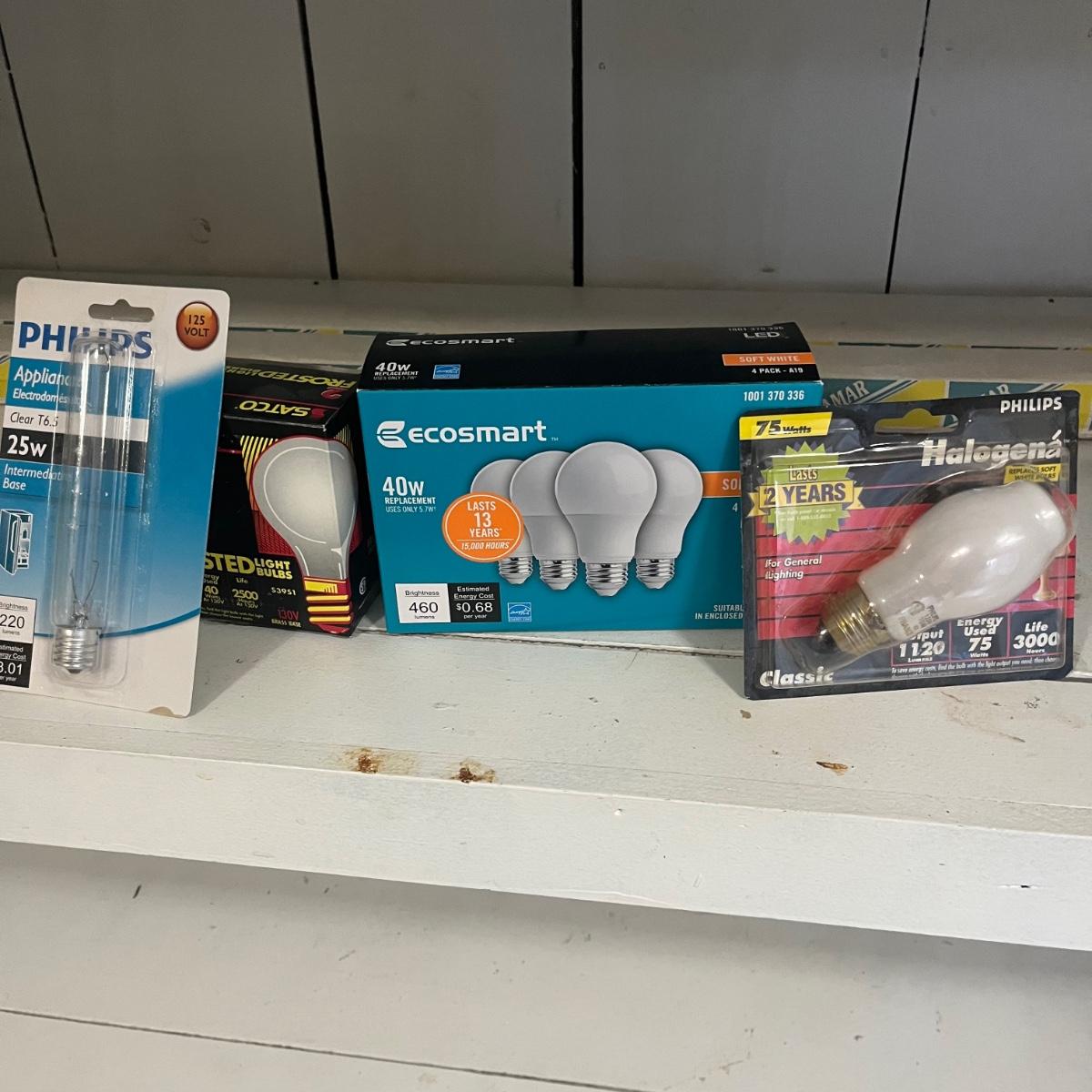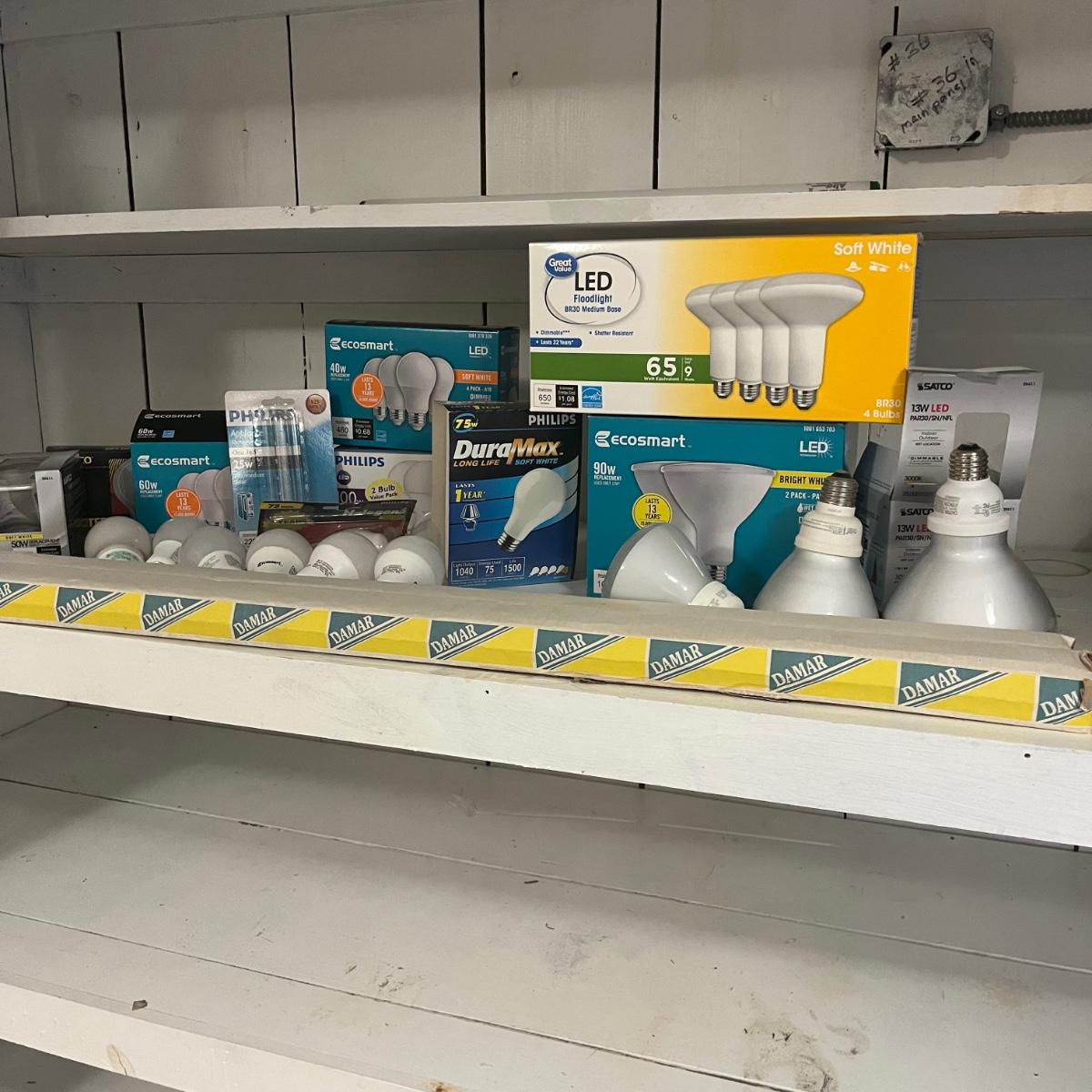 Lot contains a variety of light bulbs including floodlights, two 36” fluorescent, appliance, LED and more. Not all boxes are full.