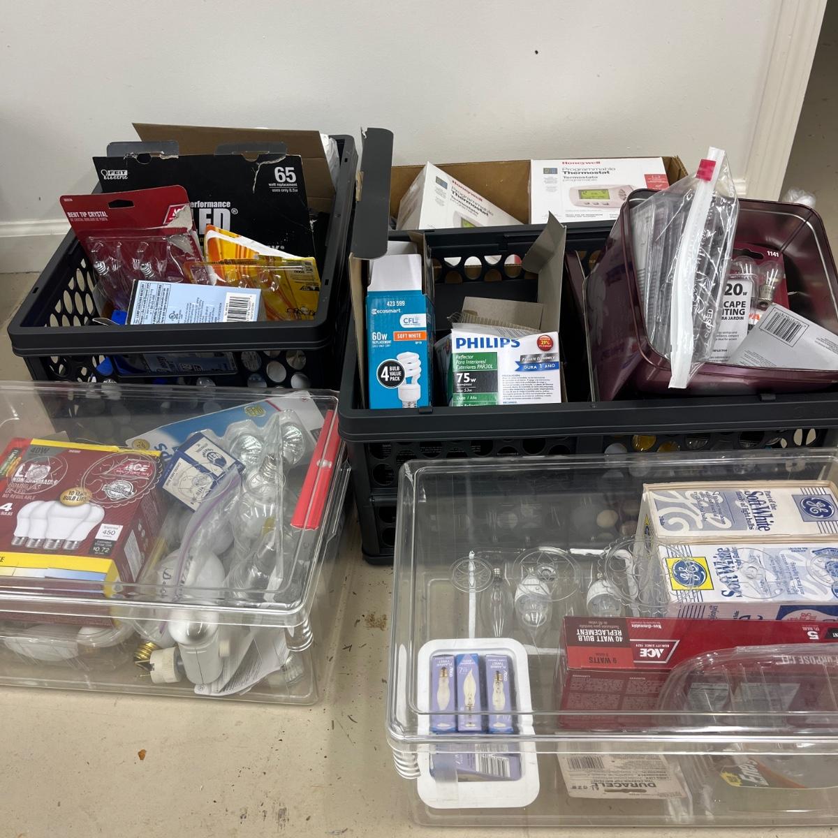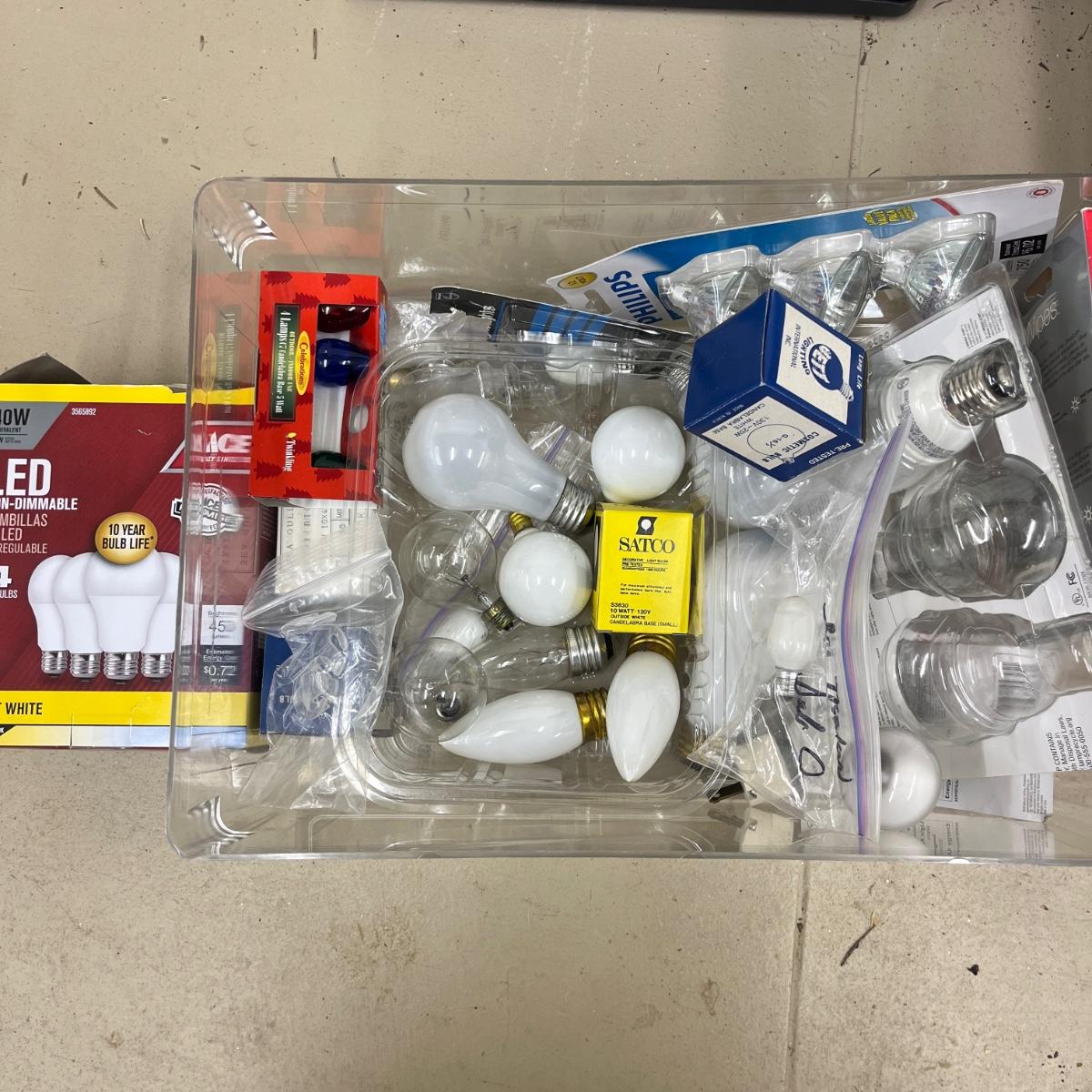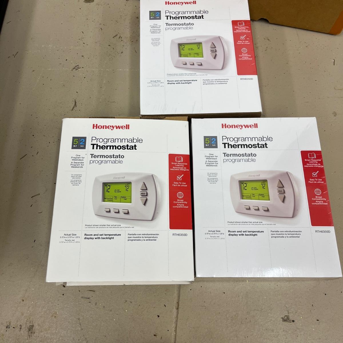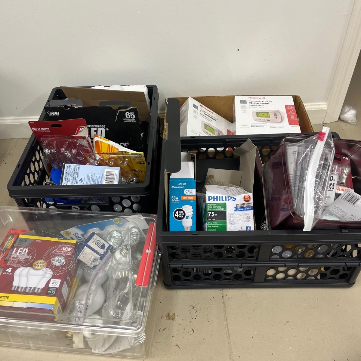 This lot includes three Honeywell programmable thermostats and a large assortment of bulbs with LED, fluorescent and incandescent bulbs.