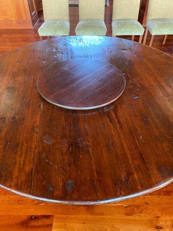 This table measures 52" round with an ADDITIONAL custom made 72" round top to make larger which is separate and has a lazy susan attached in the center.