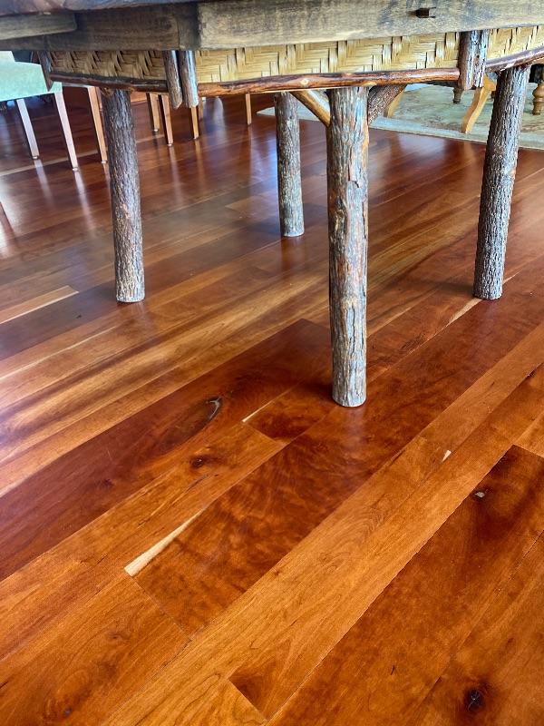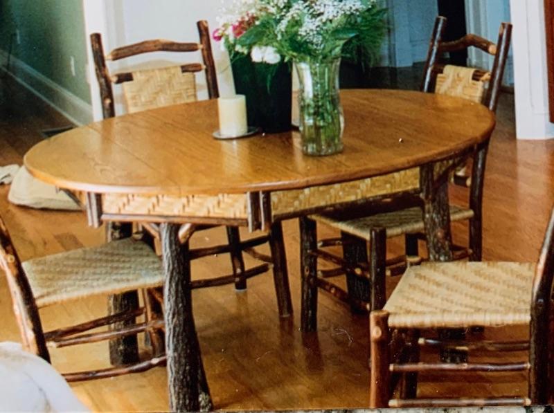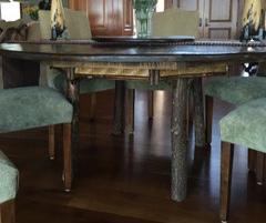 Adirondack Style Breakfast Table with Round polished wood top and a 4" cane apron, on four tree limbs as legs, custom made by Phil Kellogg https://www.custommade.com/by/phil-kellogg/