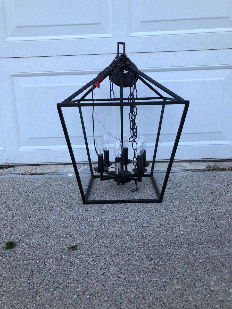 I bought & had hung by an electrician, realized it was too big & took it down. It was only up a couple weeks. It’s a very dark bronze. New it was $150. 23” high & 16” wide