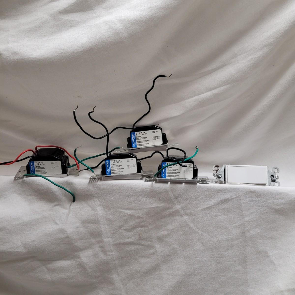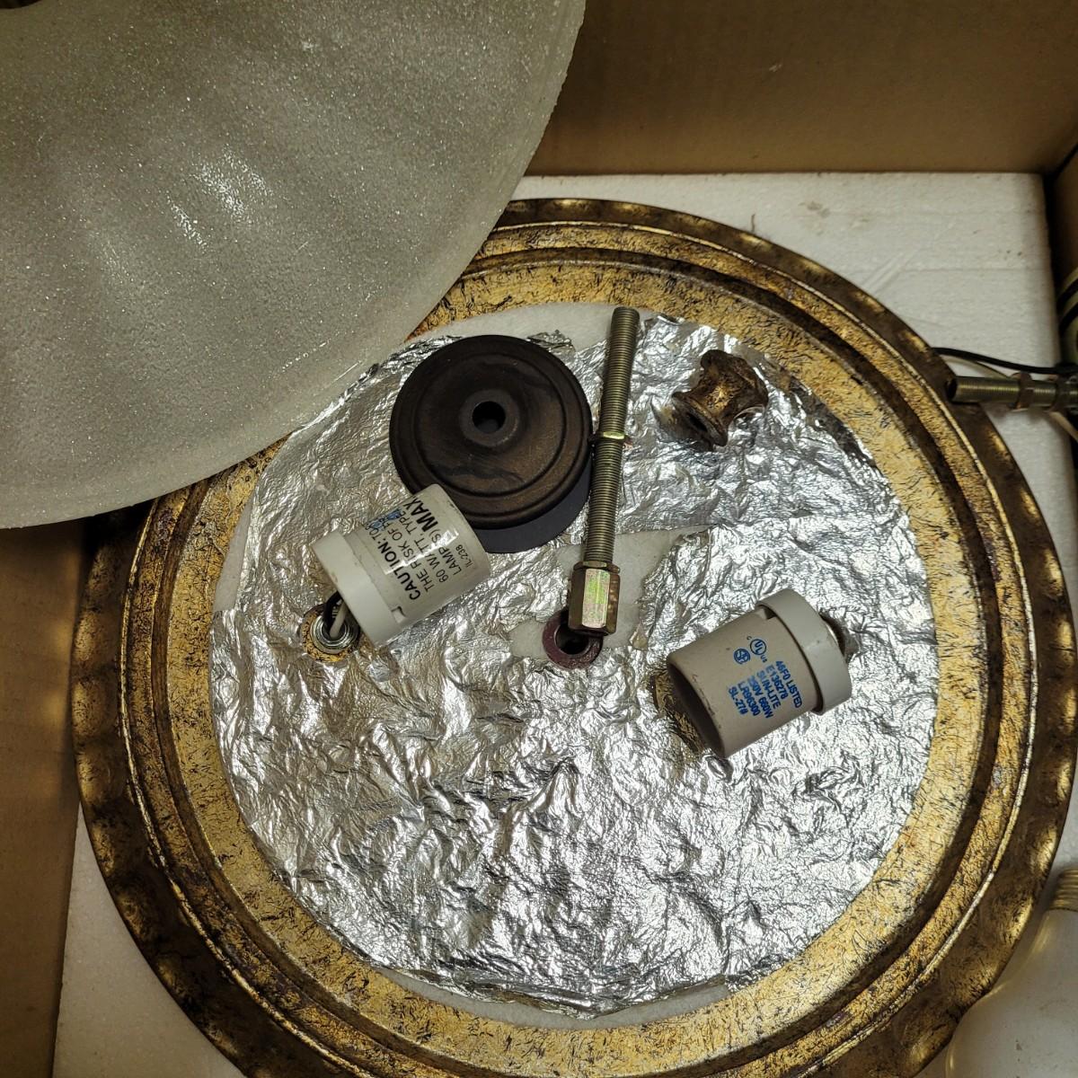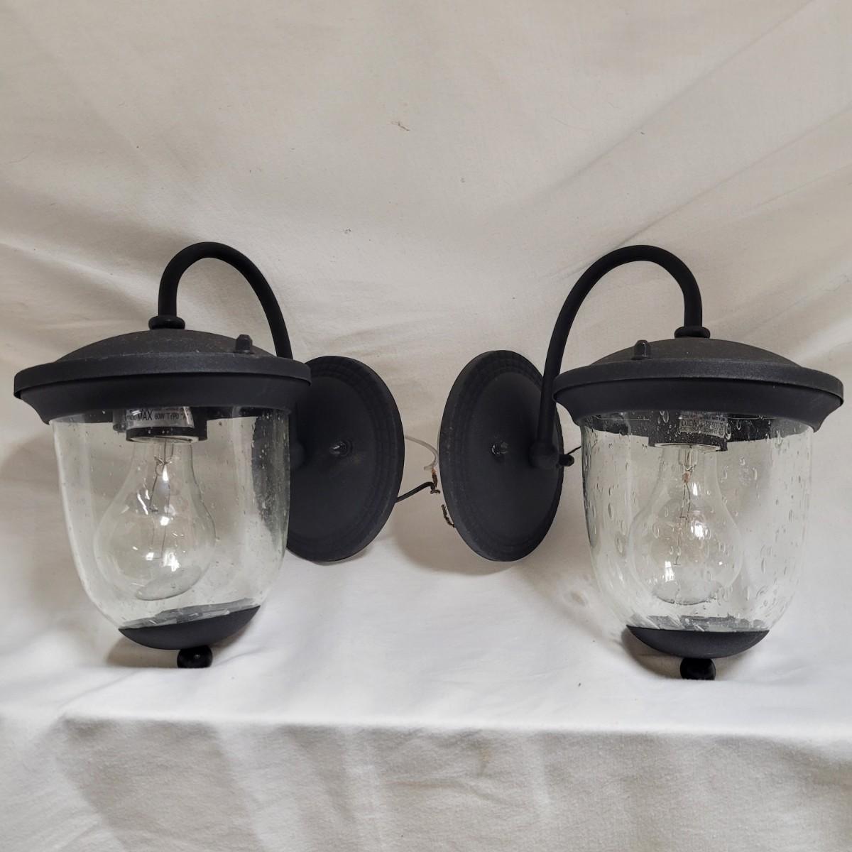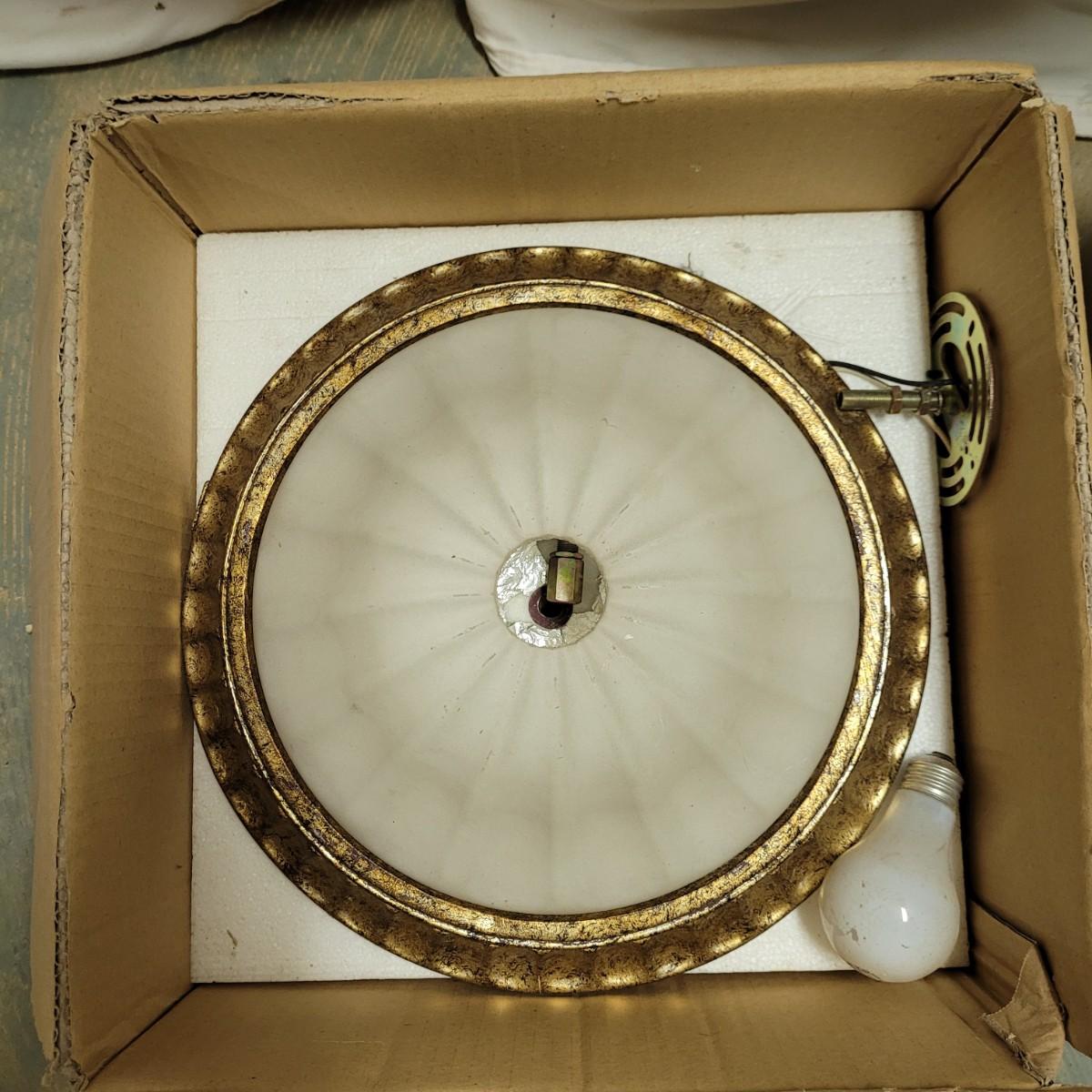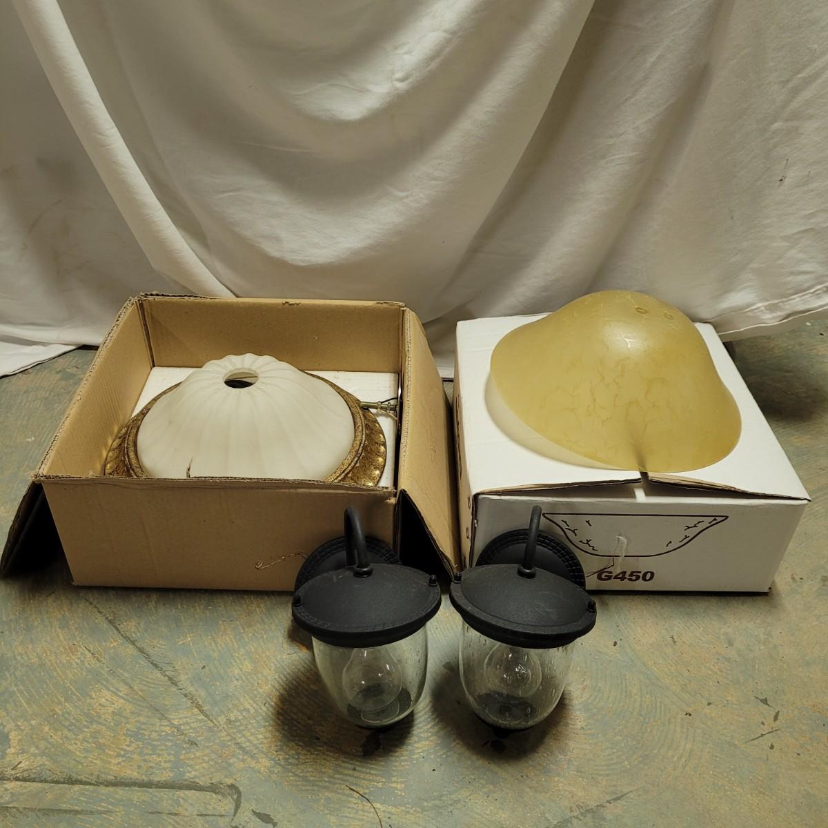 This lot contains two ceiling dome light covers, (one with electrical components), two exterior sconces and five light switches. Dome with electrical components measures approximately 14"DIA at base. Items not tested.