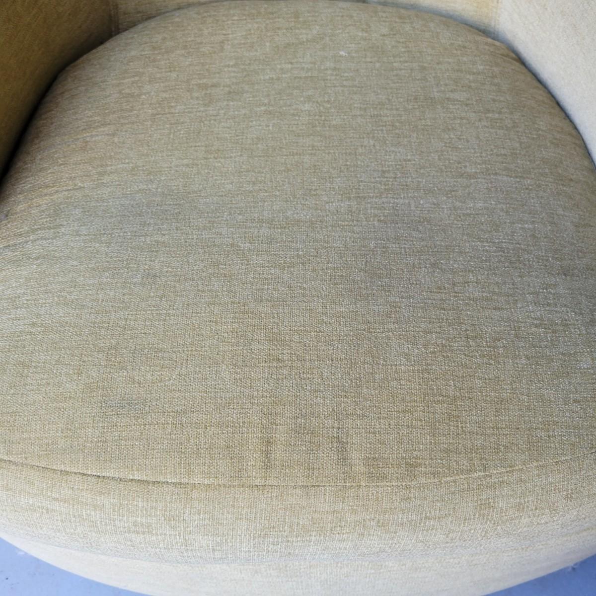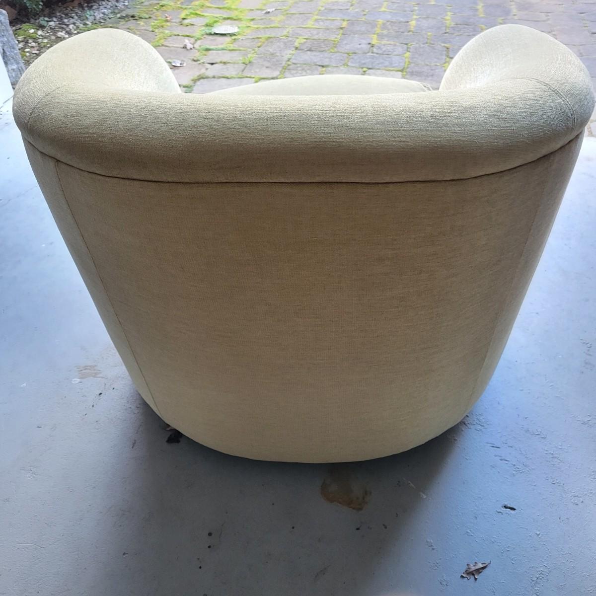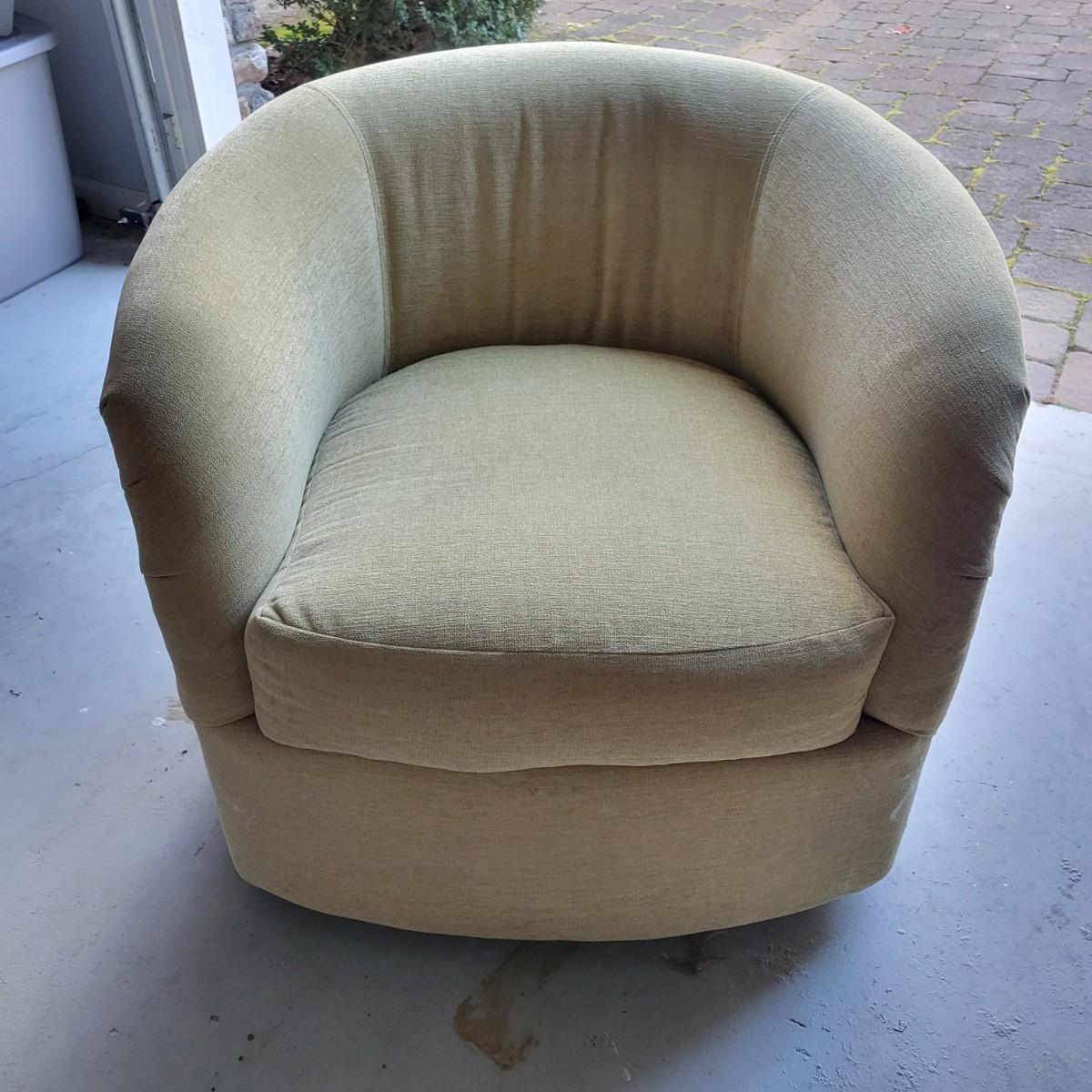 A tub chair in good condition with a minor blemishes on the upholstery. This chair is plush and features a light gold upholstery and has a spinning base. Seat cushion is not removable. Measures approximately 31" x 31" x 26" with a seat height of 16.5". Local pickup only