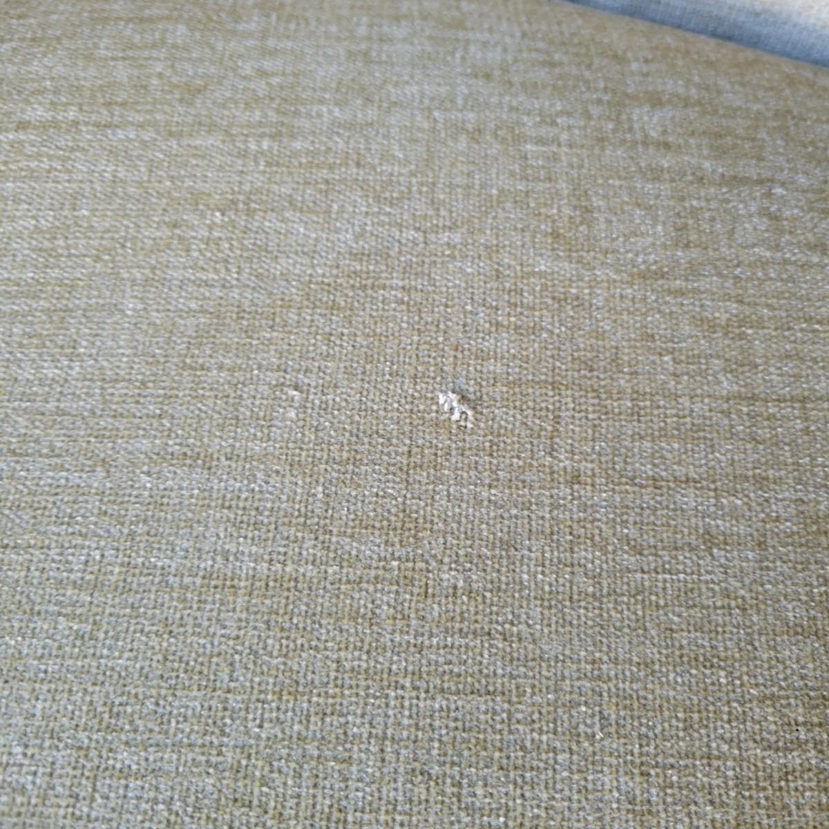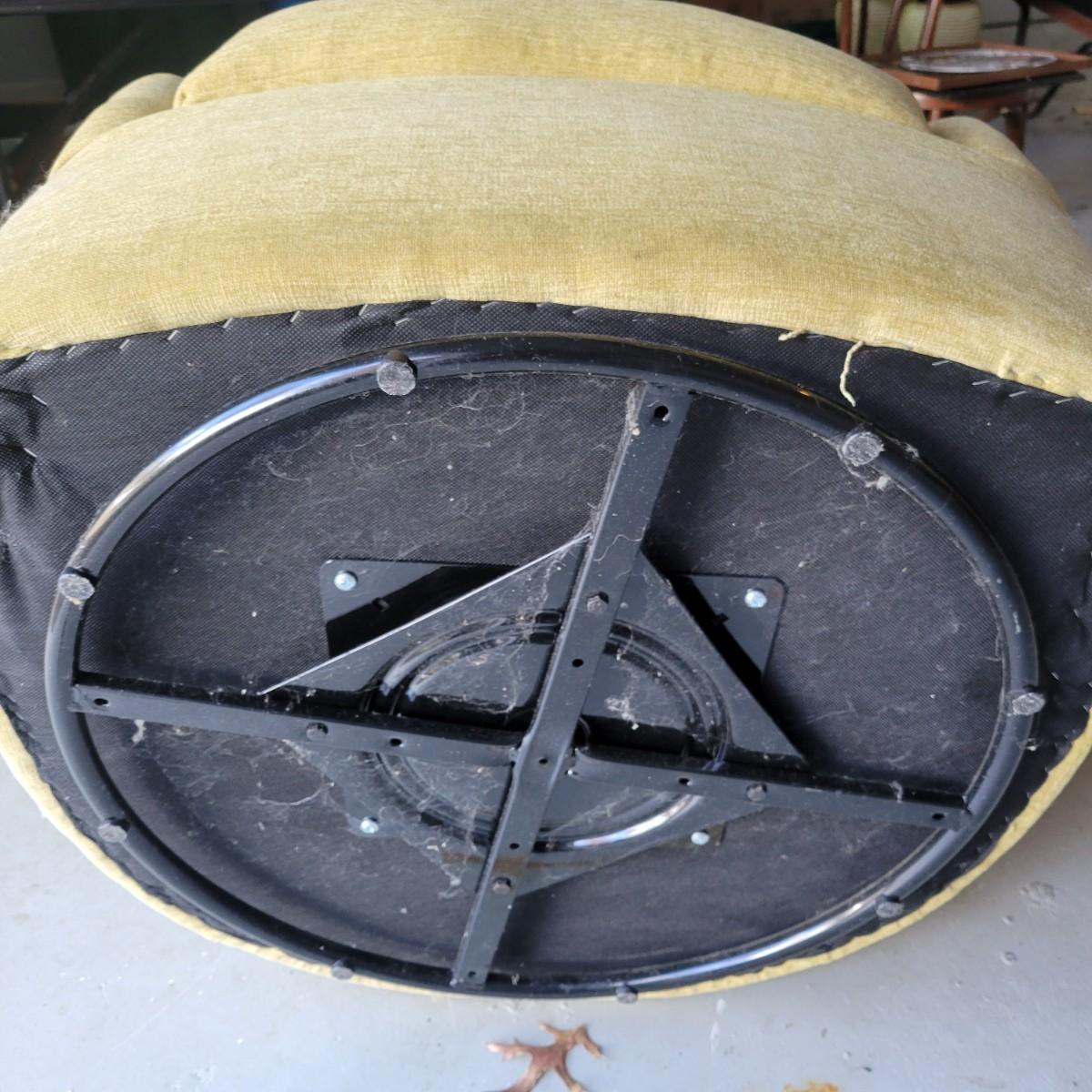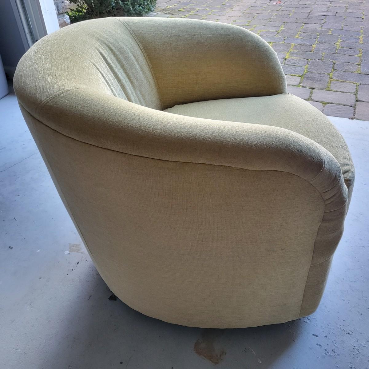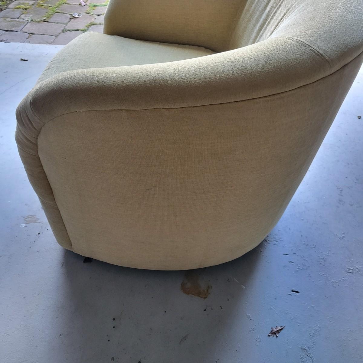 A tub chair in good condition with a minor blemishes on the upholstery. This chair is plush and features a light gold upholstery and has a spinning base. Seat cushion is not removable. Measures approximately 31" x 31" x 26" with a seat height of 16.5". Local pickup only