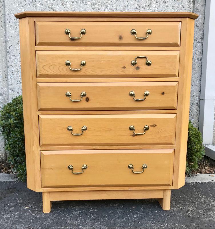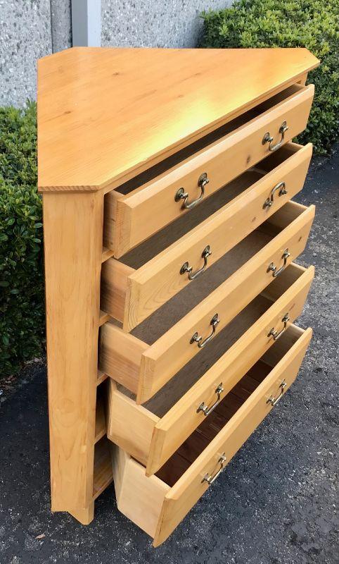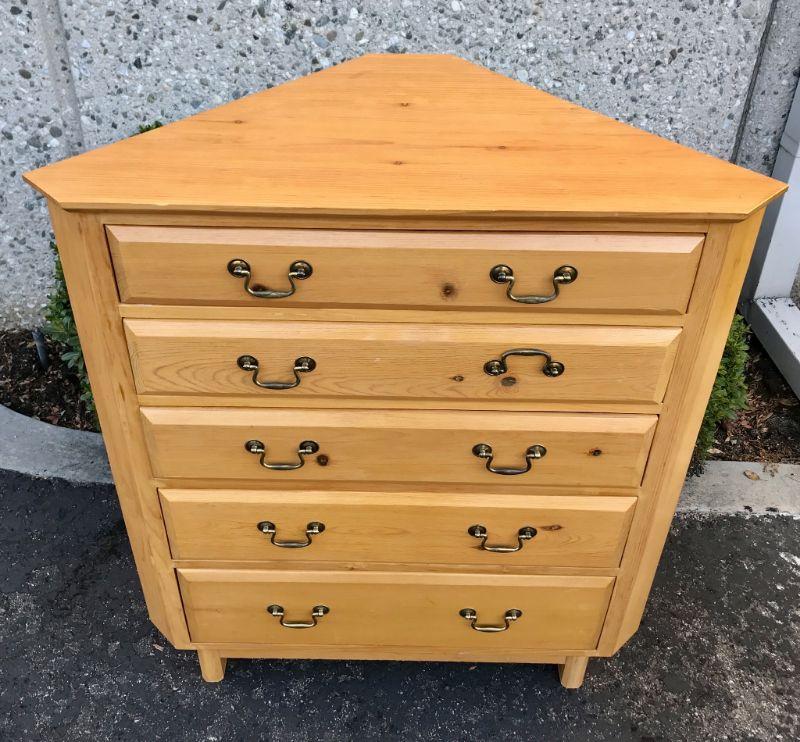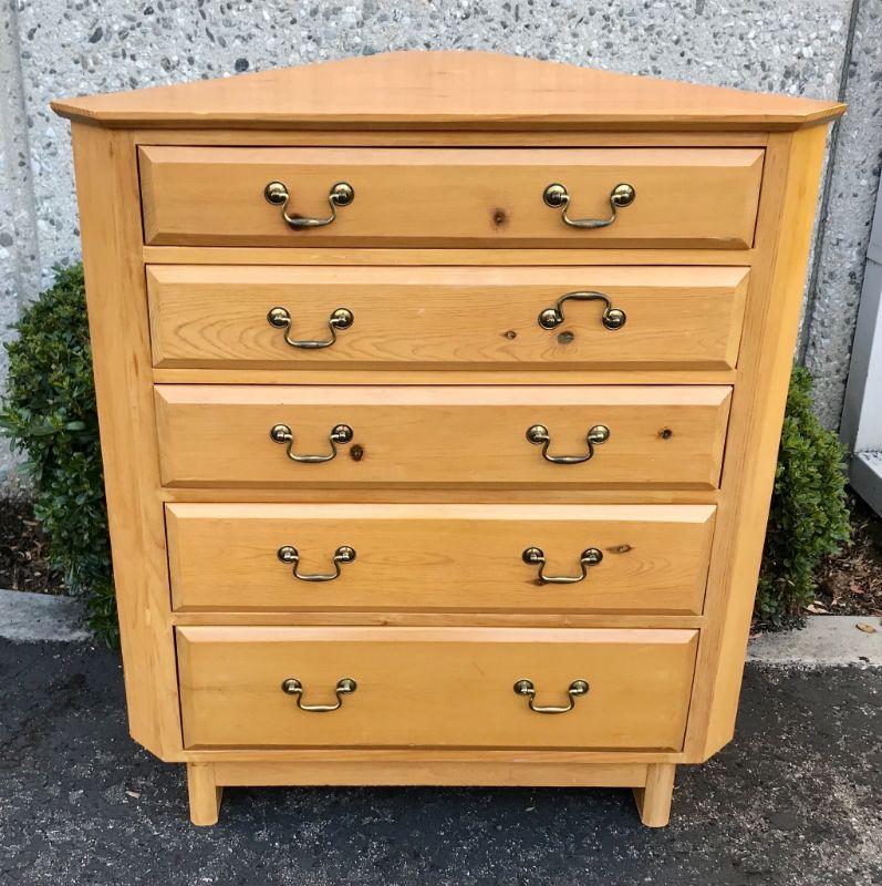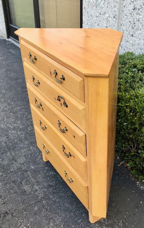 Light blonde oak dresser. Made to sit in the corner. 5 drawers. Measures about 40hx35wx18d. Good condition.