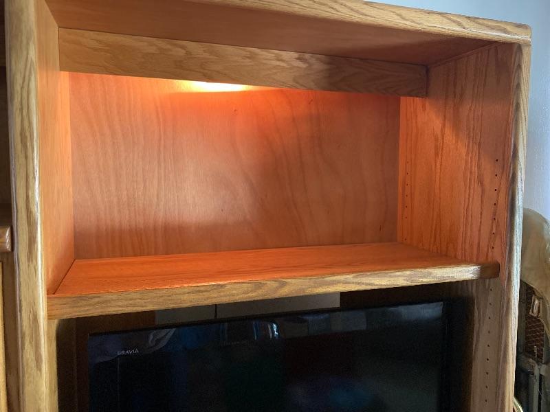 Light oak wall unit. Multiple storage cabinets, glass front cabinet and an adjustable shelf. TV and radio not included. Measures 59”x70.5” and is 16.5” deep. Lighted across the top.