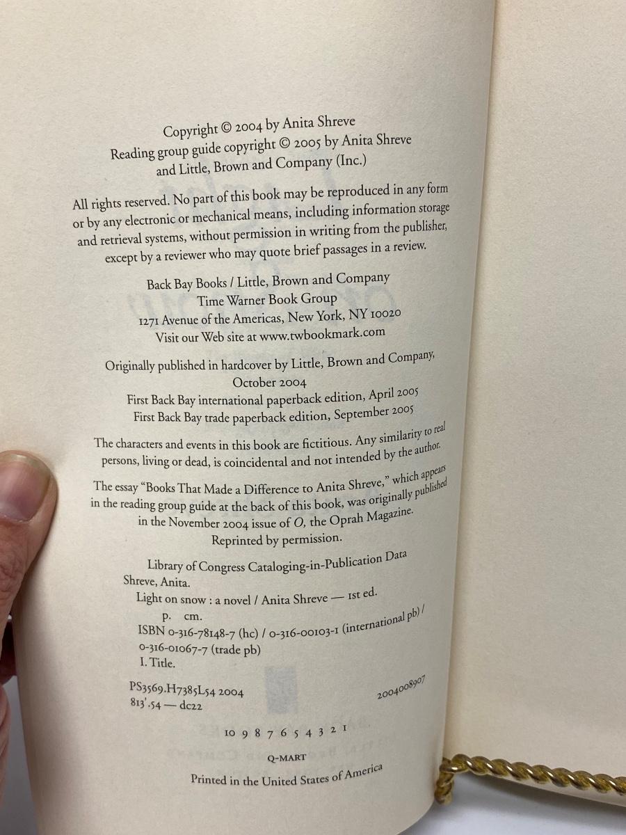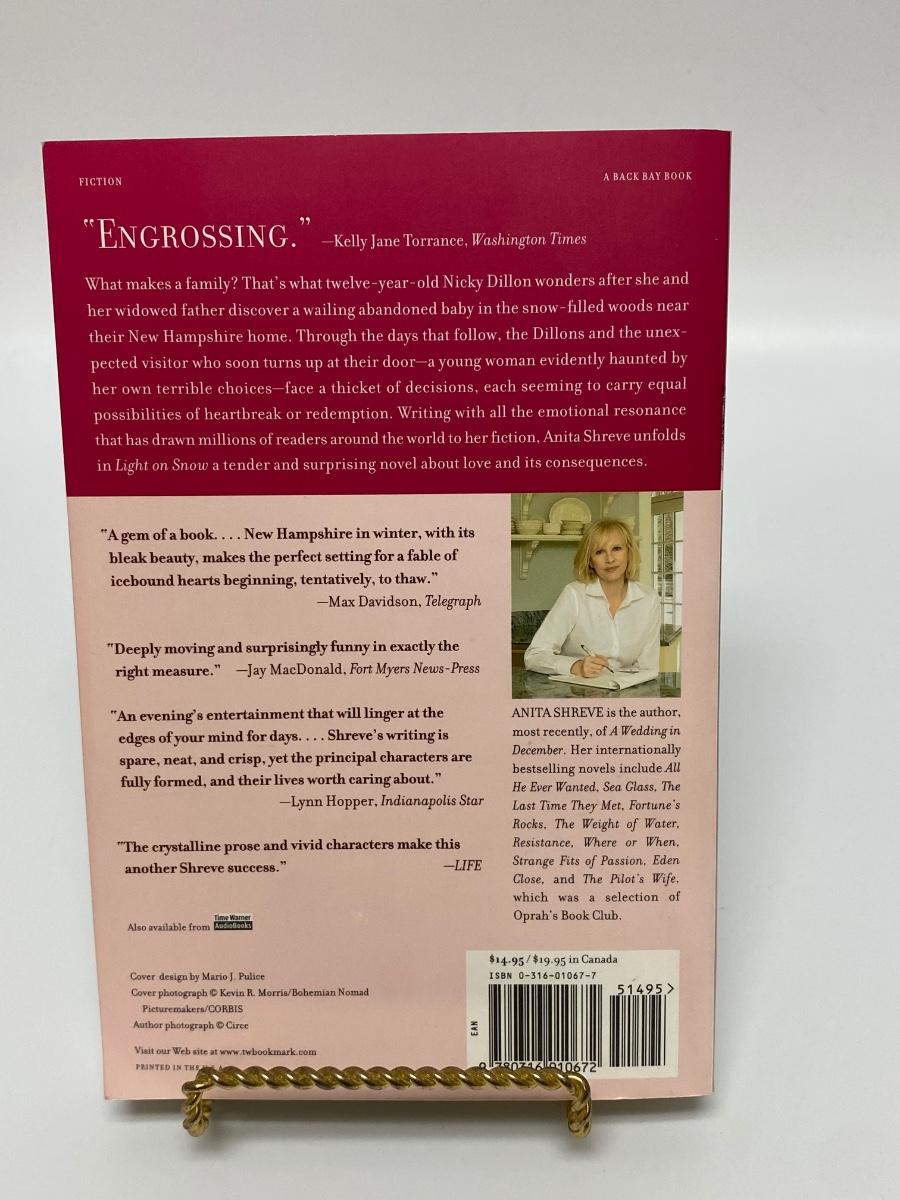 Light on Snow by Anita Shreve. A 12-year-old and widowed father find a baby in the snow followed by a woman at their door., what follows is a story of love and consequences. National bestseller. 2004. Good condition.