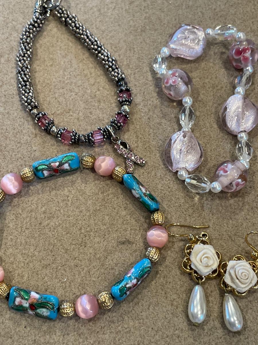 Includes earrings, bracelet, and one necklace