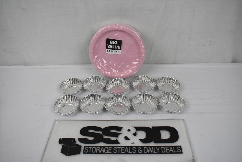 Light Pink Paper Dessert Plates & Stainless Steel Cupcake Molds - New