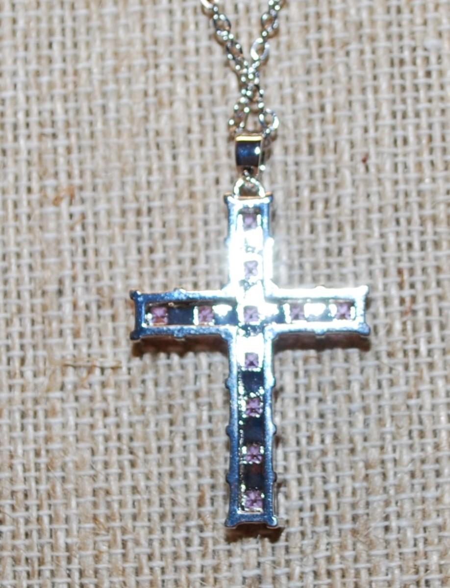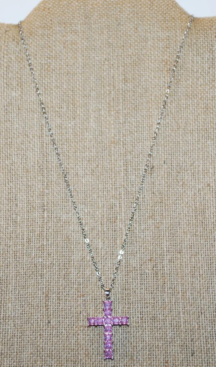 Light Pink Squared Stones Cross PENDANT (1½" x 1") on a Silver Tone Necklace Chain 17" L