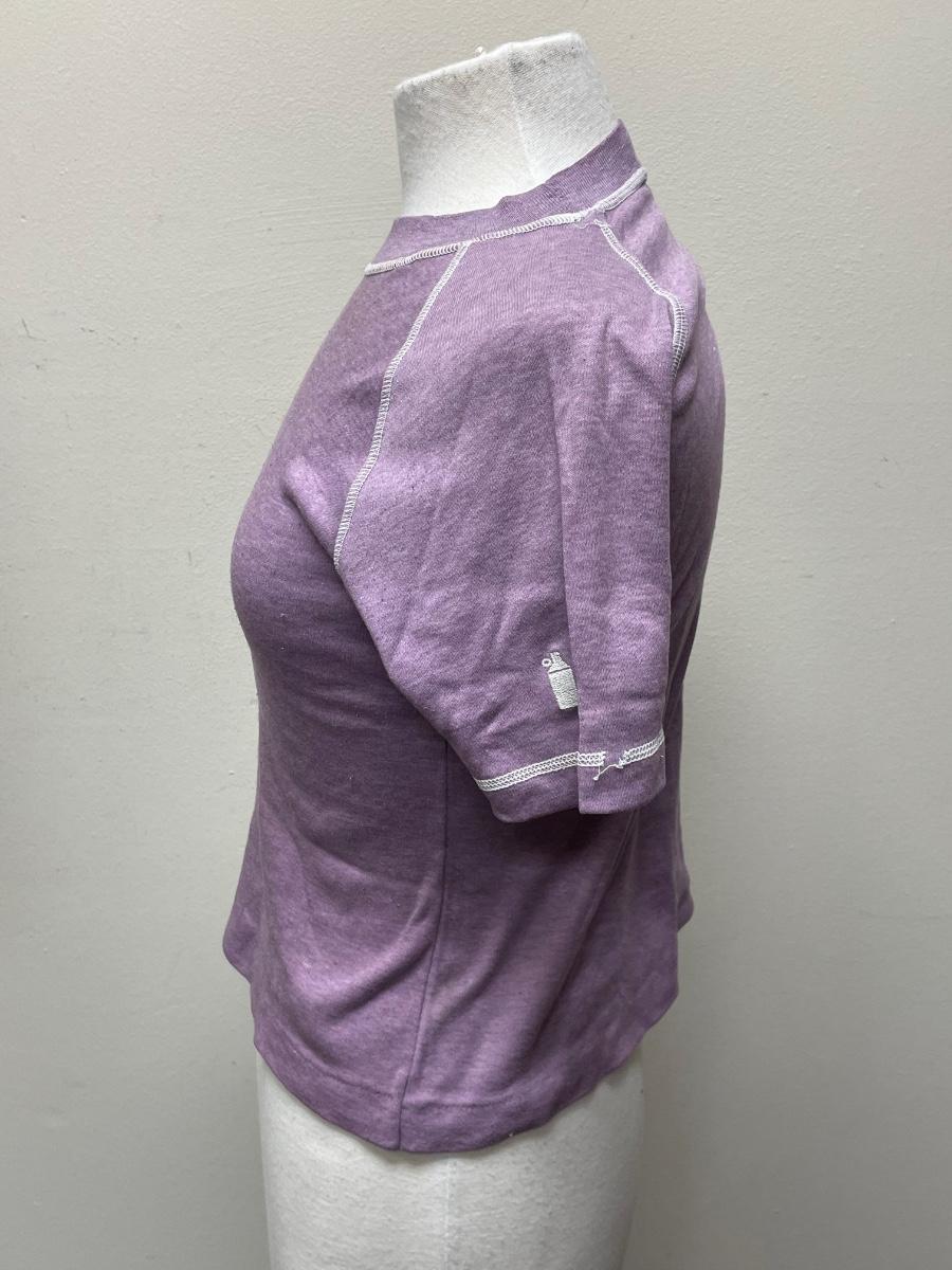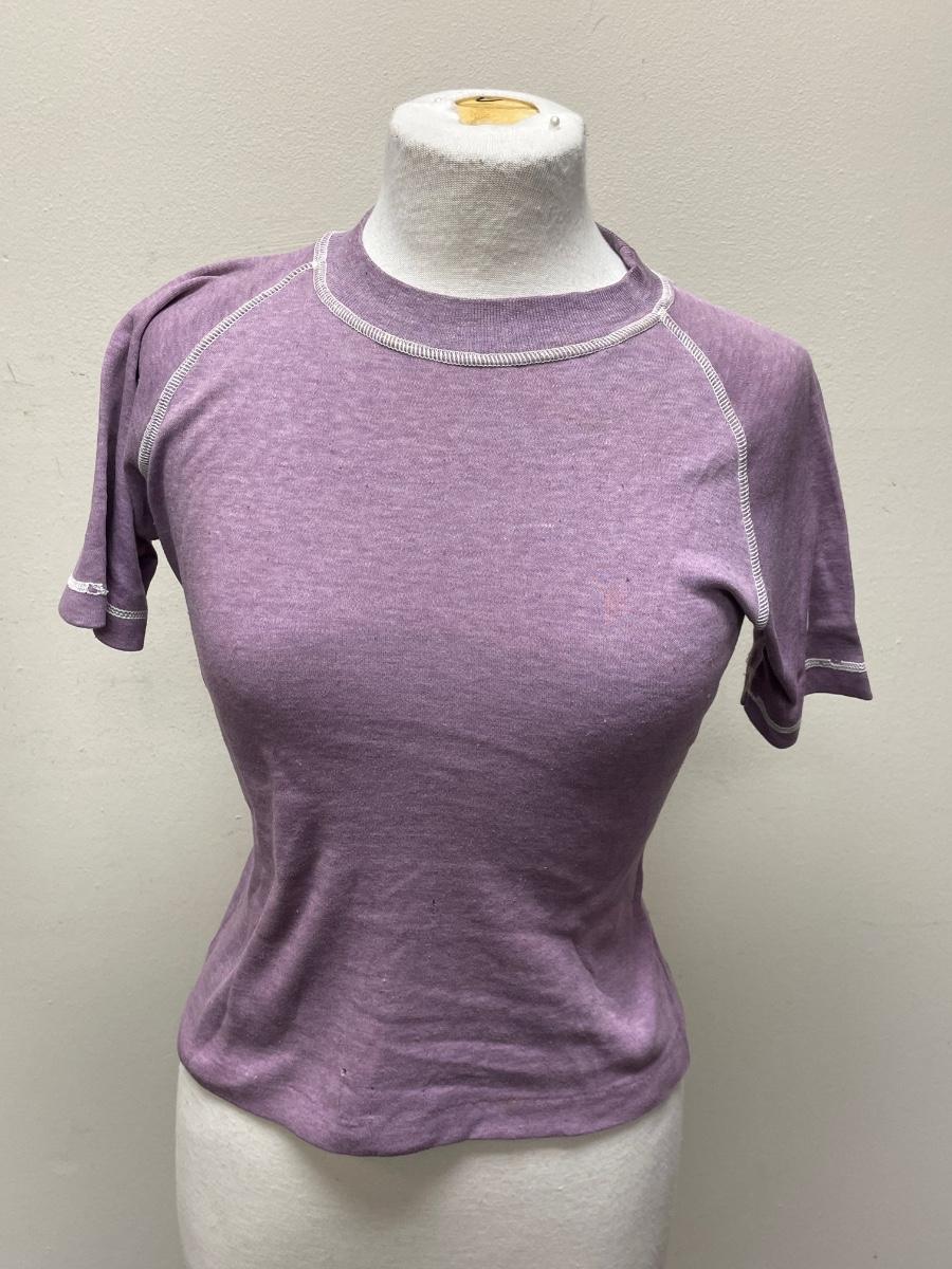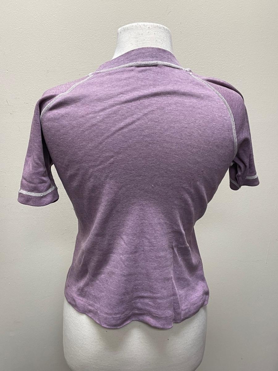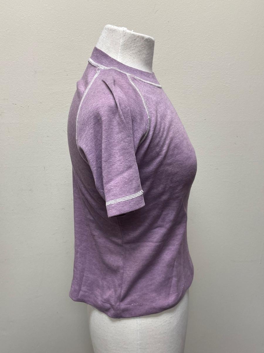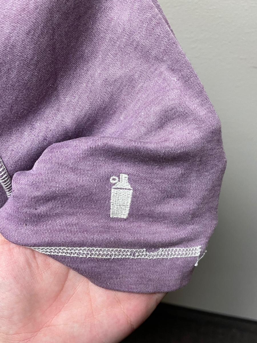 This item is in good condition. Some of the lining is a little messed up. There is some lint on the shirt. On one of the sleeves there is a picture of a coffee cup. It seems to fit a size small.