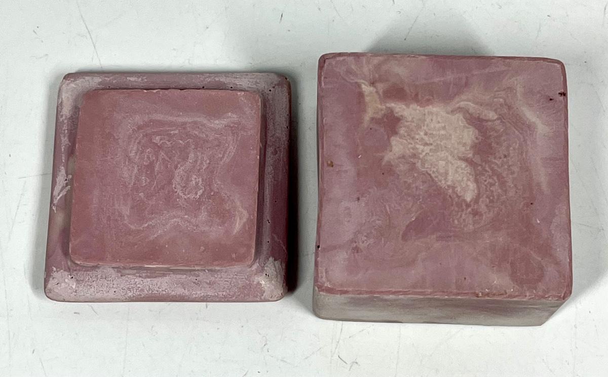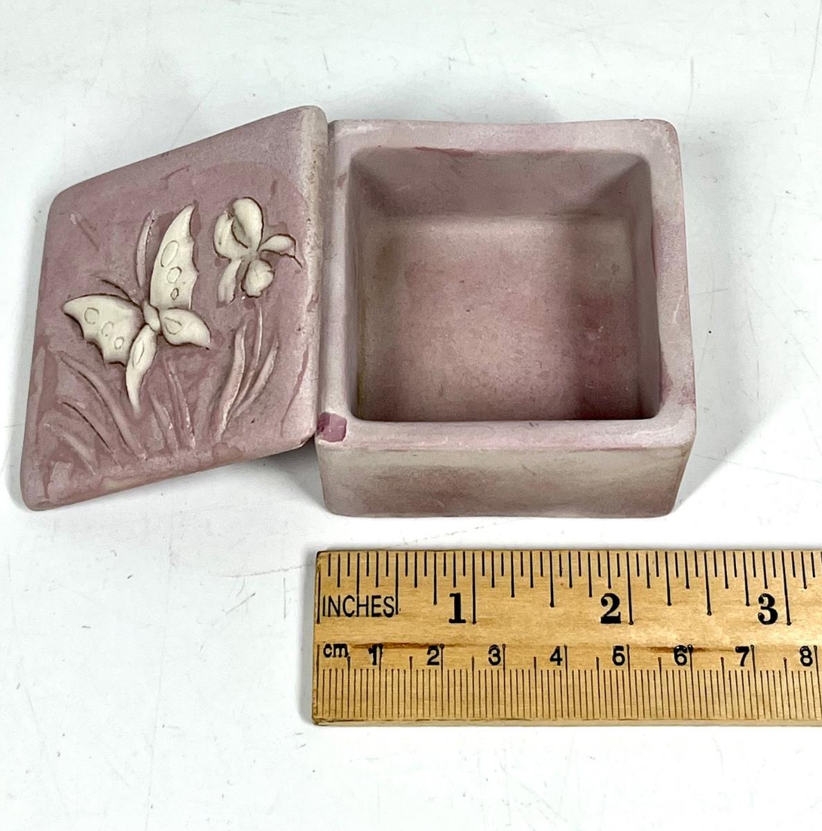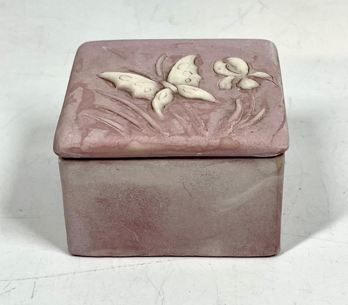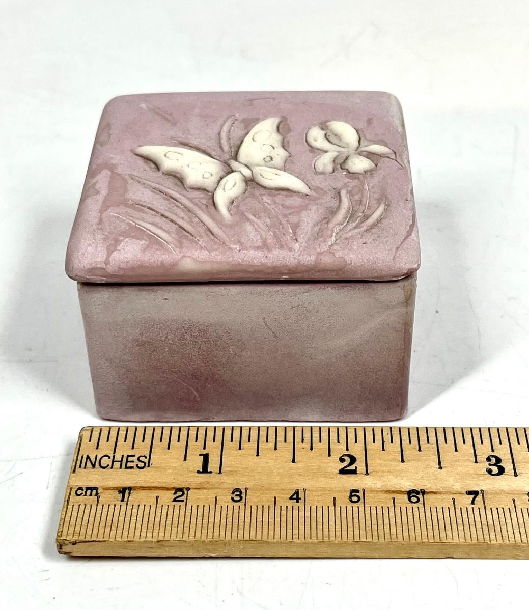 Pale Purple & White Plaster Resin Trinket Box with Butterfly & Iris on Top. Very lightweight, believe it is plaster like material. There is a chip on the corner of box, not really noticeable with the lid on.