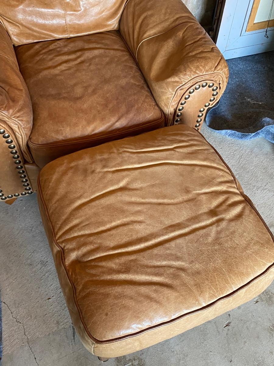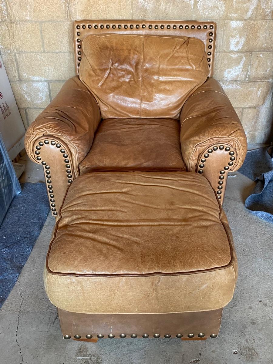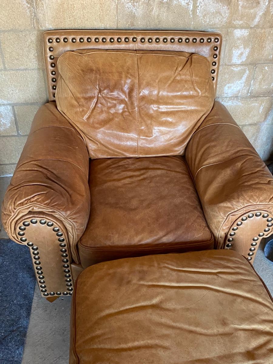 Light Tan Leather Nail Head Trim Club Chair with Ottoman. Light wear from use, no damage. Chair is about 3' square in size.