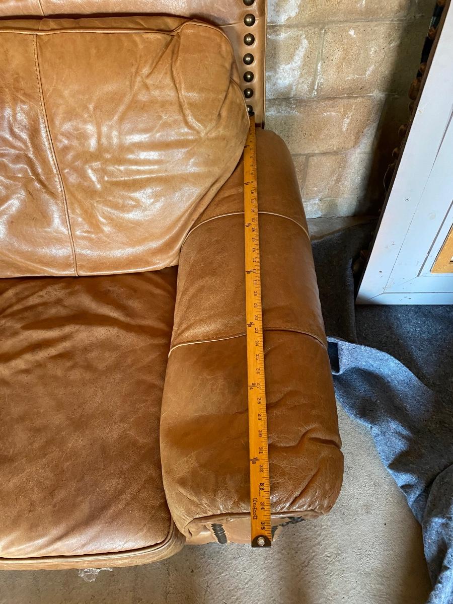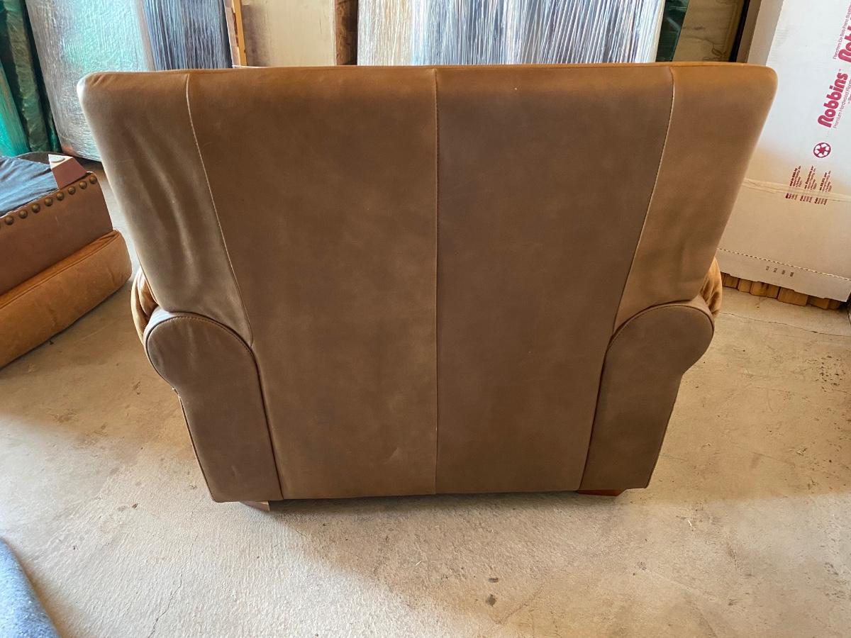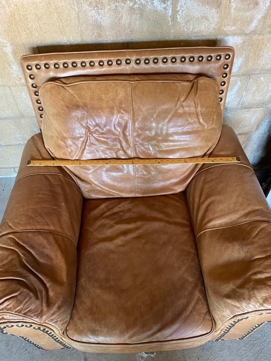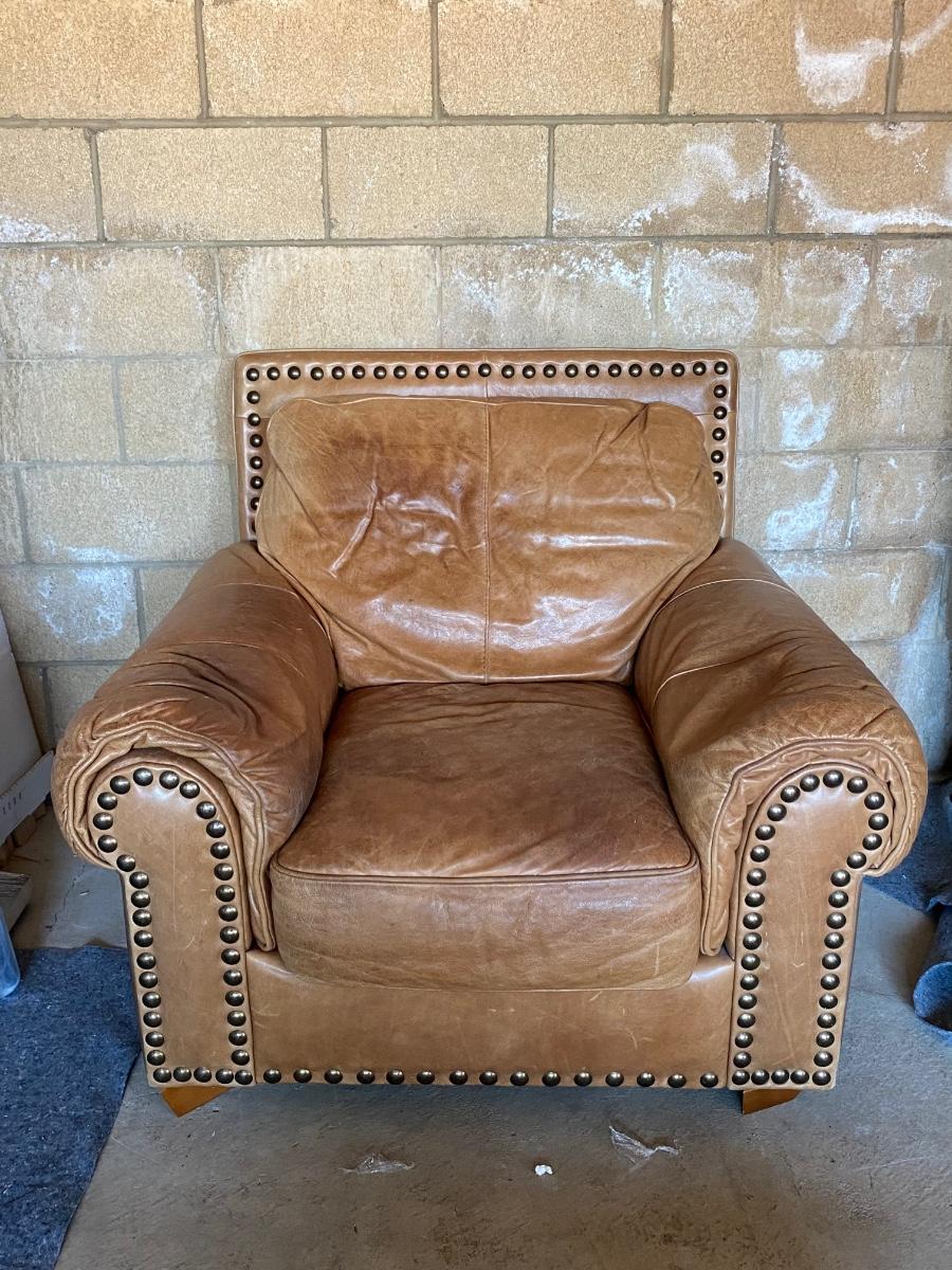 Light Tan Leather Nail Head Trim Club Chair with Ottoman. Light wear from use, no damage. Chair is about 3' square in size.