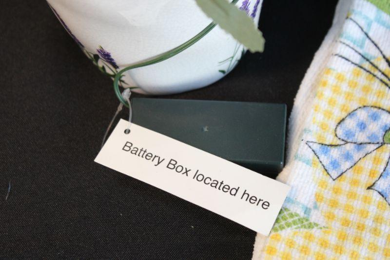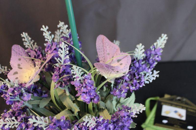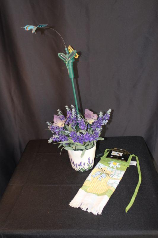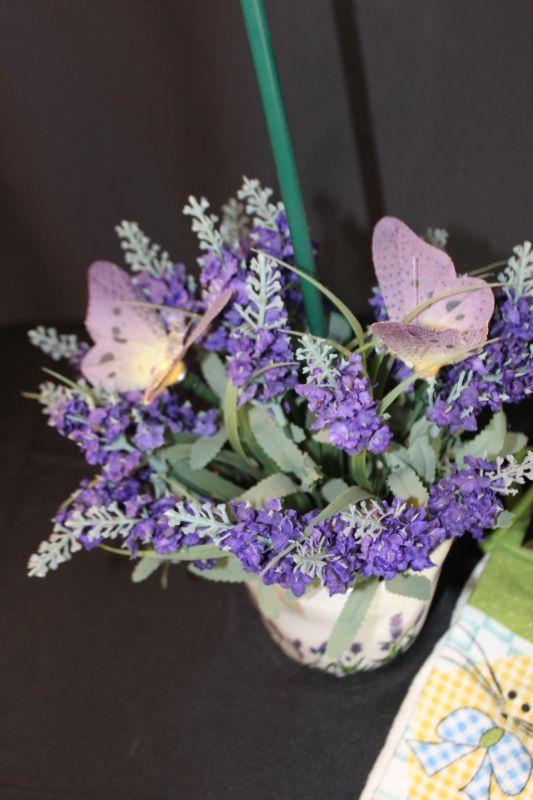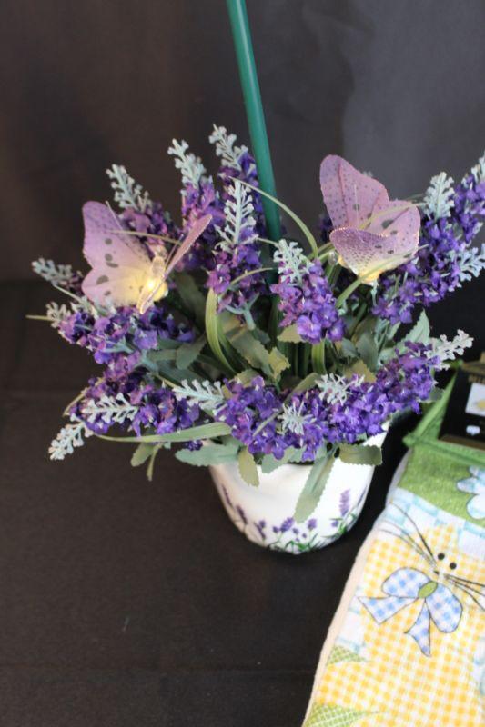 Artificial lavender in a pot contain battery operated light up butterflies. In addition is a solar "flying butterflies" garden stake in the center of lavender. Springtime cat dish towel is new, still has tag.
