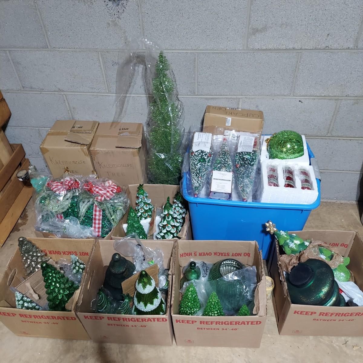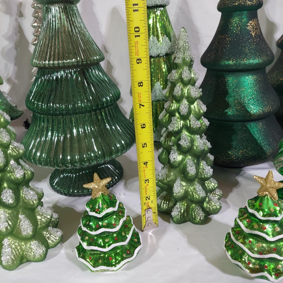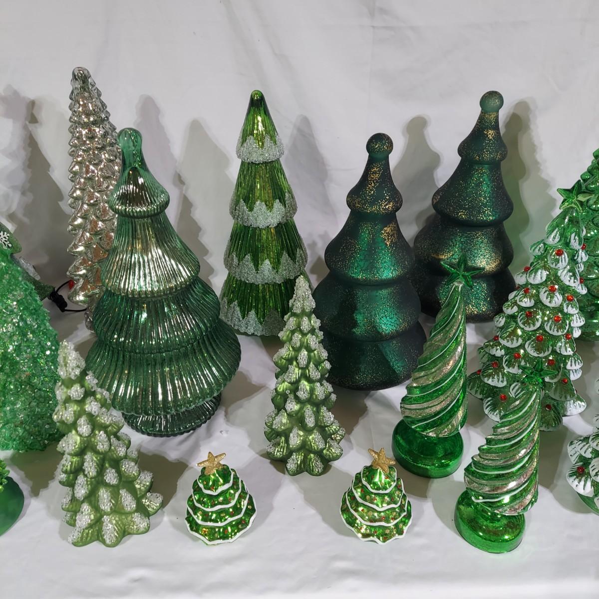 Large lot of Christmas and Winter decor. There are several style of Christmas trees. Some trees are glass, some are plastic. Some of the trees light up. Lot also includes many other decor items like snowmen and peppermint candies. These items are mostly mercury glass and also light up. Trees vary in height. The tree with a star is approximately 18"H. Please see photos for more measurements and further details. This is a very large lot. Please plan accordingly for transportation. Local Pickup Only