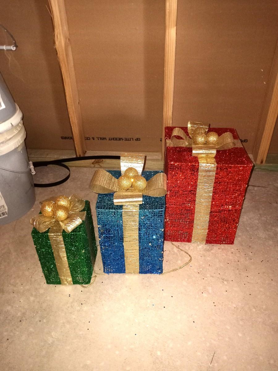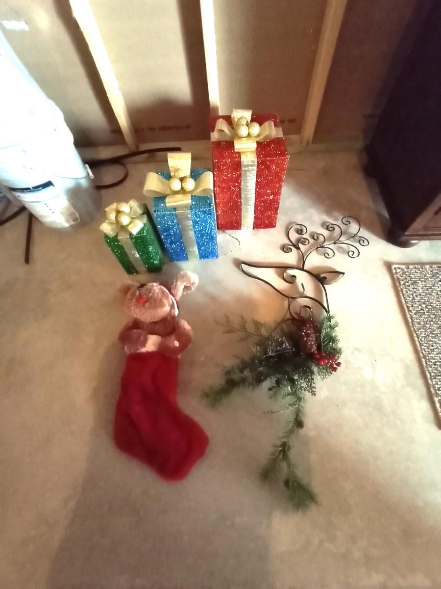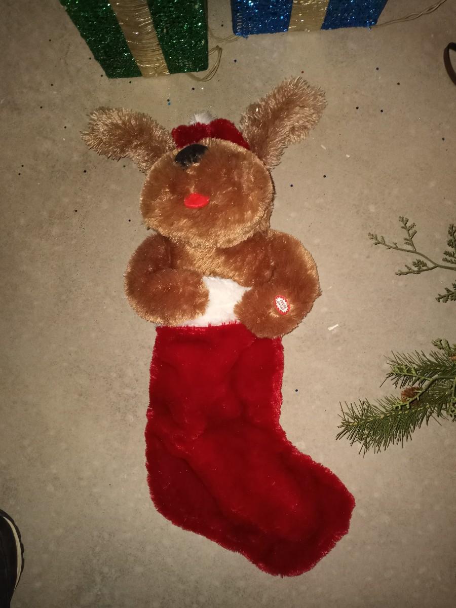 LIGHT UP PRESENTS 9" SQUARE-METEL REINDEER 12" TALL-PUPPY STOCKING