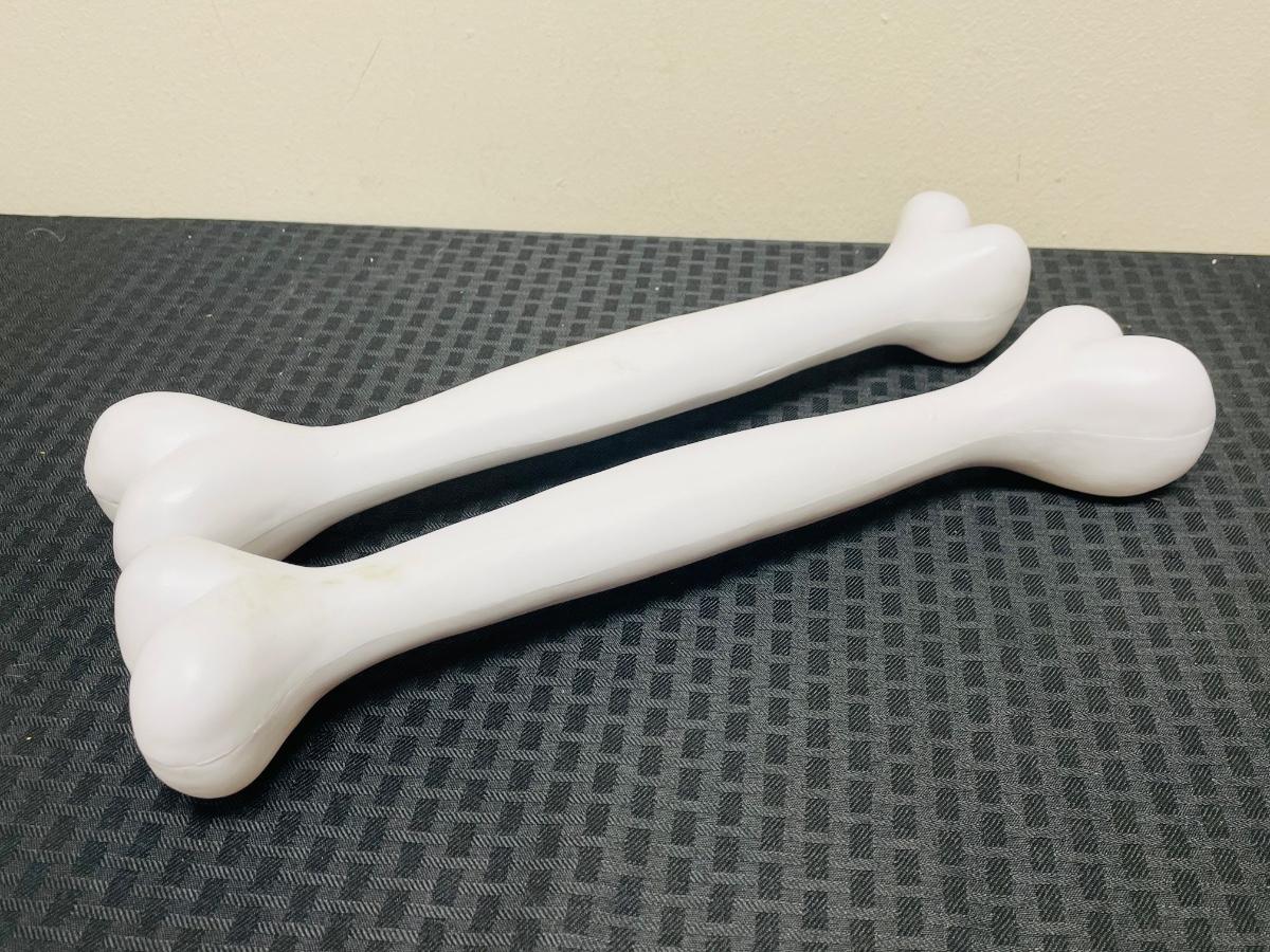 This set includes: two plastic bone decorations and one light up skeleton. The skeleton head has not been tested to see if it lights up. The two bones have some slight discoloration on them.