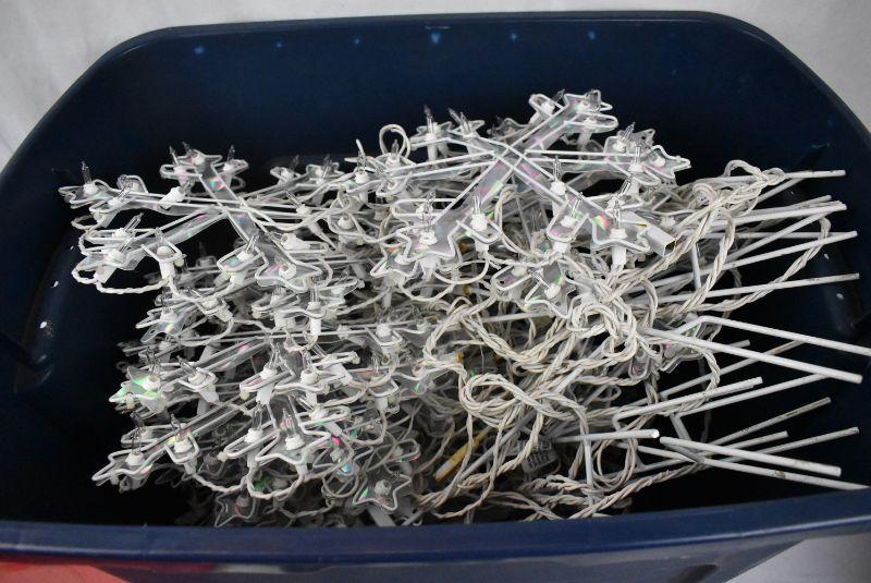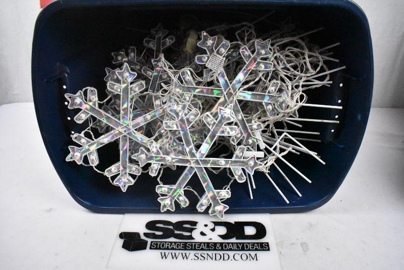 Light Up Snowflakes Outdoor Decor (approx 20) in Blue Bin/Red Lid. Untested