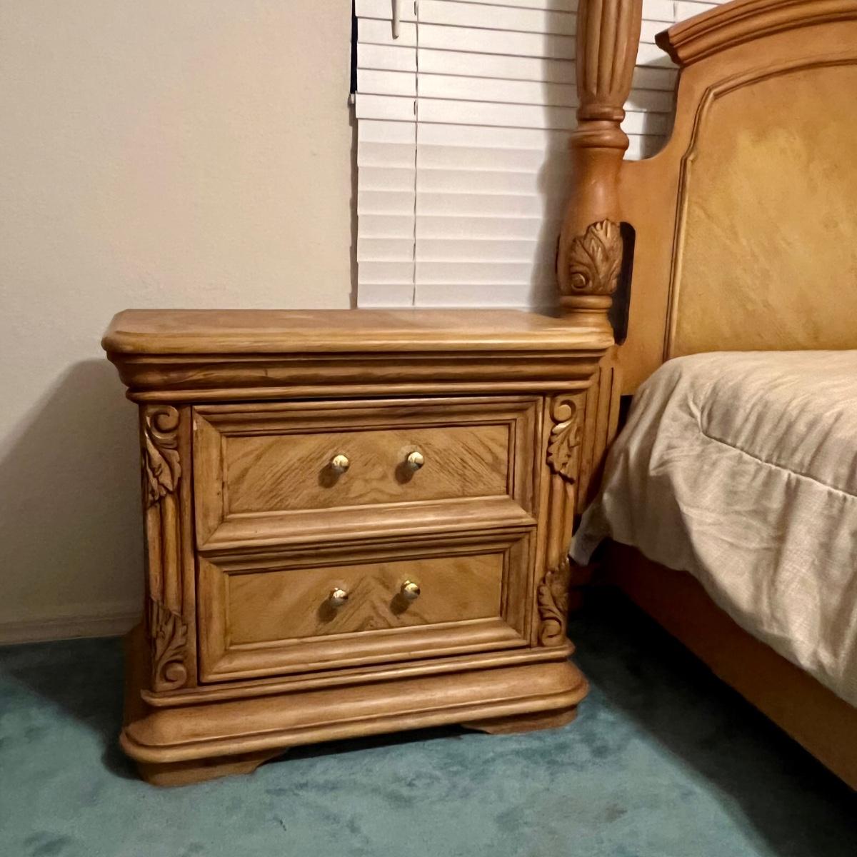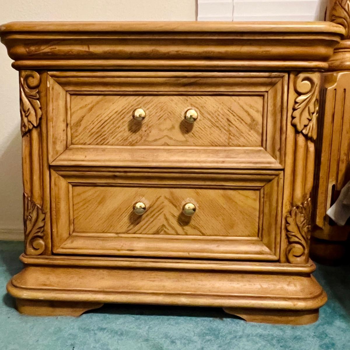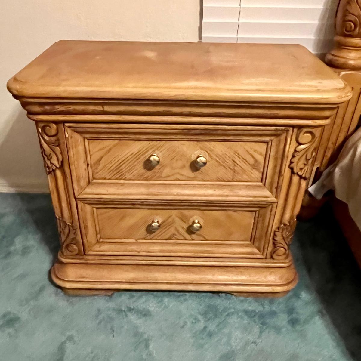 Honey Oak night stand meas. 30”w x 16”d x 26”h. Some wear on top. Matching dresser and bed available. Furniture is heavy. Please bring help to move.