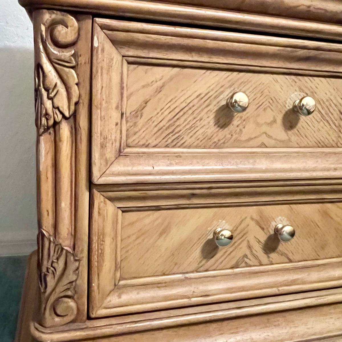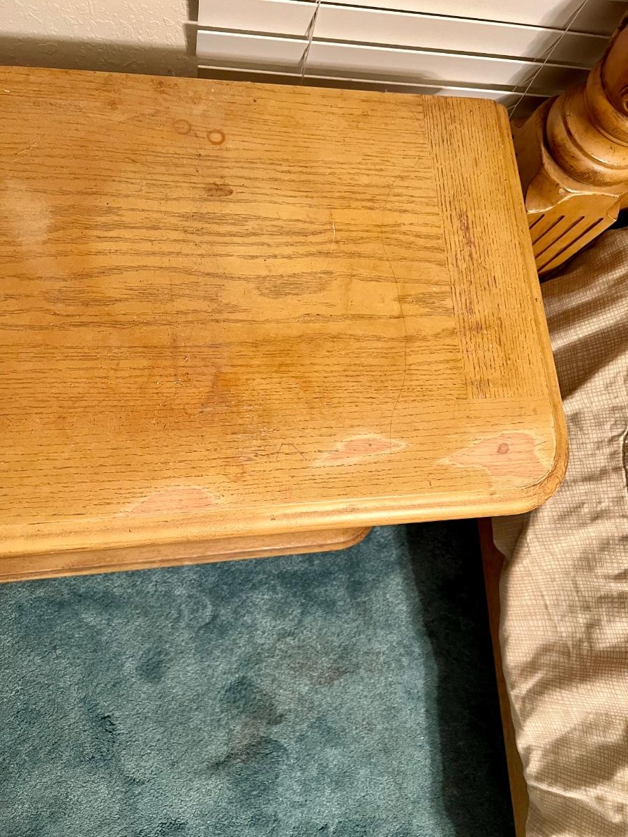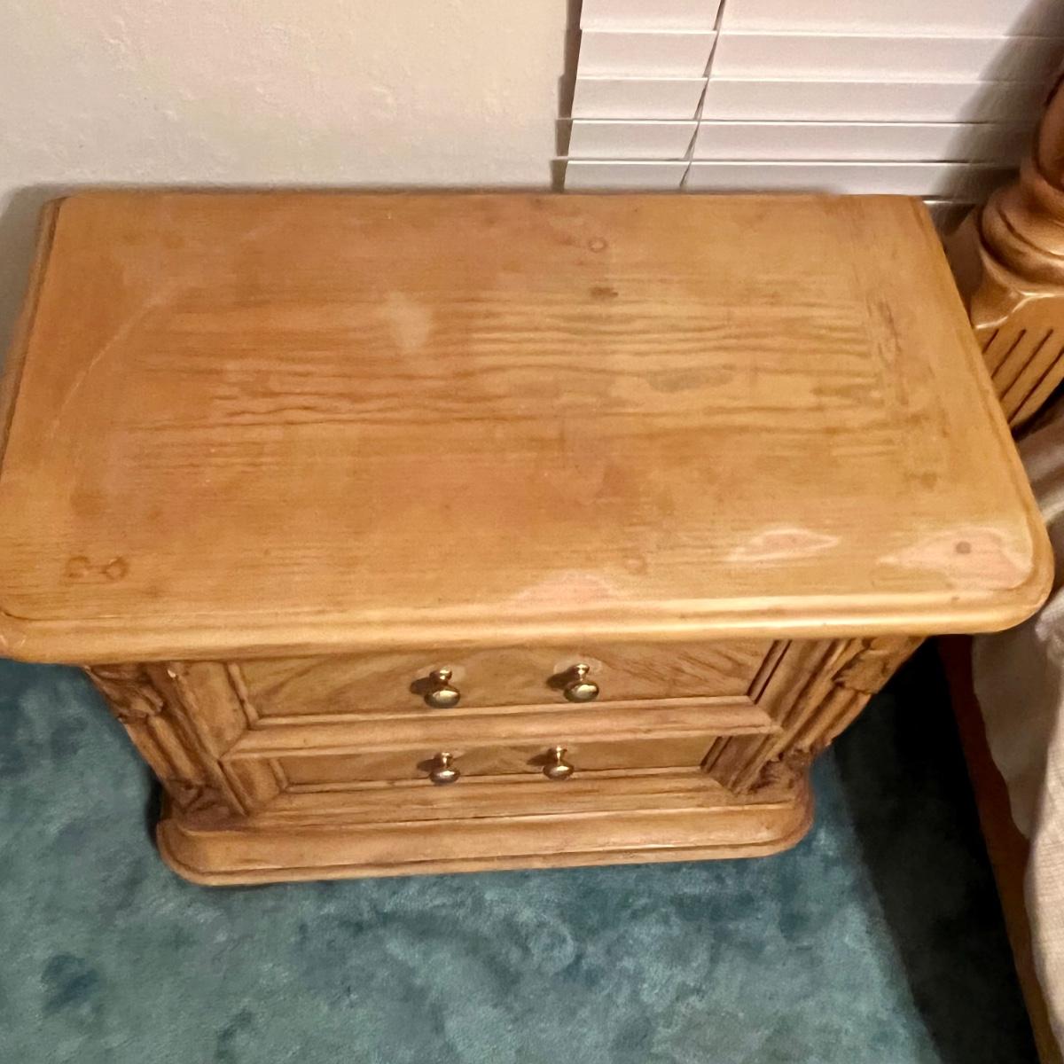 Honey Oak night stand meas. 30”w x 16”d x 26”h. Some wear on top. Matching dresser and bed available. Furniture is heavy. Please bring help to move.