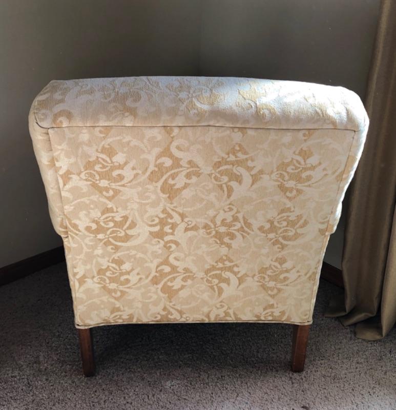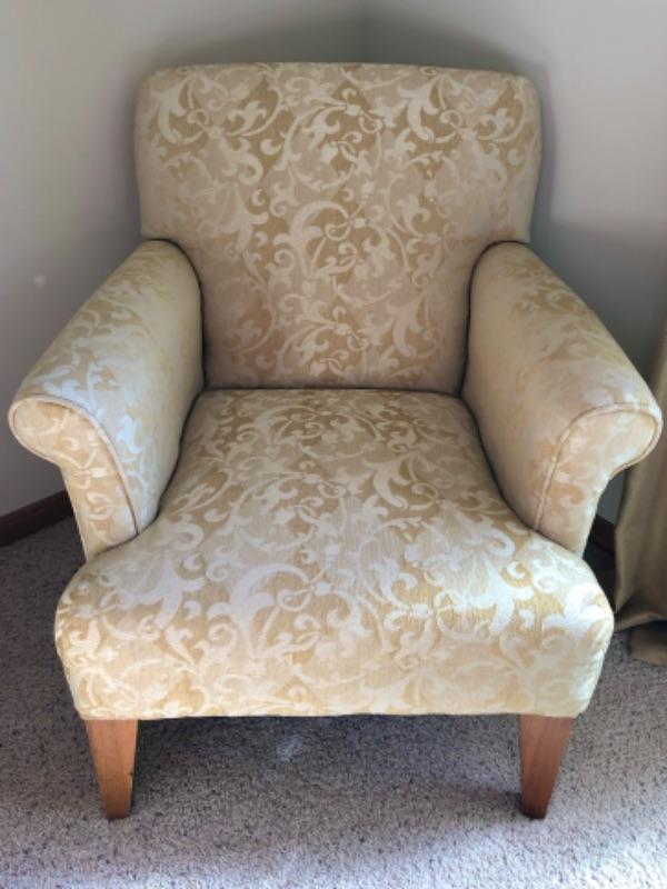 Very nice condition upholstered chair. Unused arm covers included. 35” high x 28” deep x 32.5” wide.