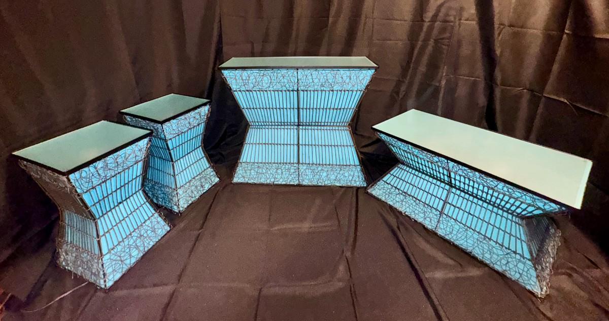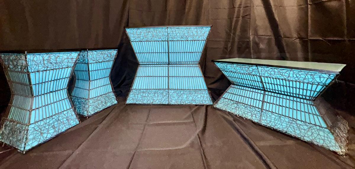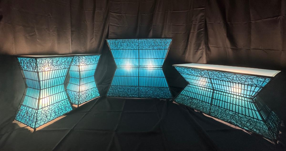 "Bask in the glow...of bold shapes, beautiful light and color! Crafted from black iron and metal with natural rattan detail and fabric shades. Tables have frosted, tempered glass tabletops. Each uses two 60-watt max. bulbs (not included)."